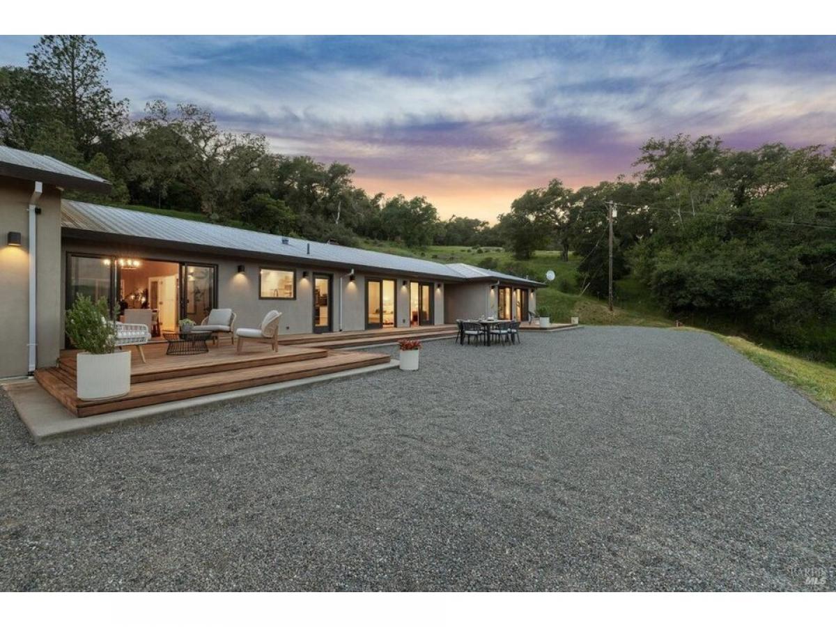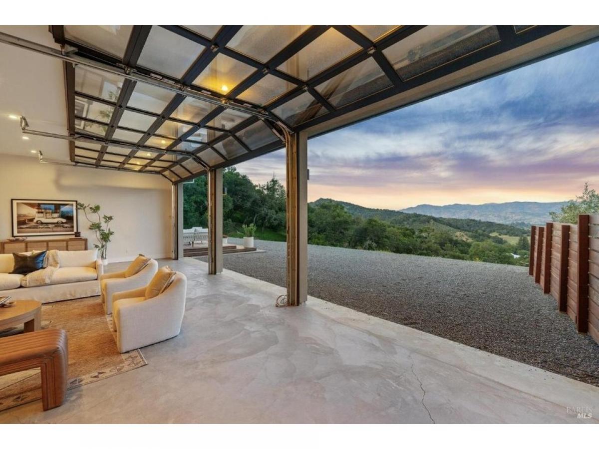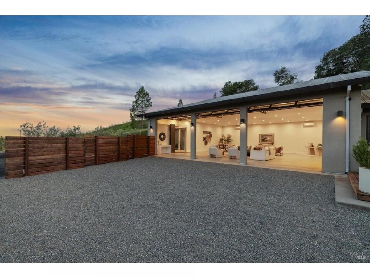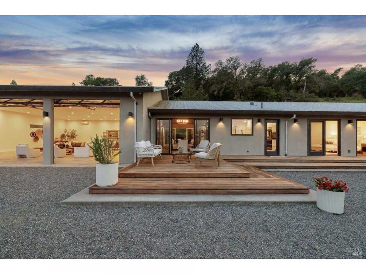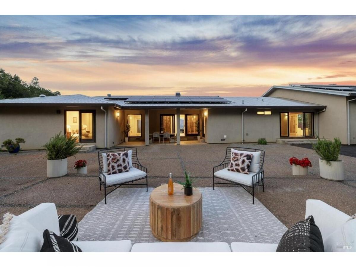 The Napa Sky Haus. Perched atop a private hill with sweeping, unobstructed views, this modern single-level home sits on 17 acres in the heart of Wine Country. Originally built in 1968, the current owners undertook a meticulous renovation, from a dazzling new kitchen amp; zen bathrooms, a cathedral dining hall, expansive IPE wood decks, solar power with backup battery, and an approved erosion control plan to plant 1.9 acres of vineyard. The home features three bedrooms and three bathrooms, including a spacious primary suite with valley views, and a spa bathroom with a soaking tub, steam shower, and custom walk-in closet. The showpiece of the property is a dramatic galleria space with soaring ceilings, polished concrete floors, and three glass roll-up doors w/electric screens framing breathtaking vistas. Currently used as an open-concept living area, the space can easily adapt to a media room, gallery, showroom, studio, or event venue. A newly constructed $2.5M driveway provides direct access from the main road to a large motor court with ample parking. This property offers the ultimate in privacy, flexibility, and California indoor-outdoor living.