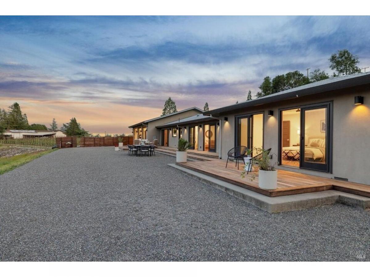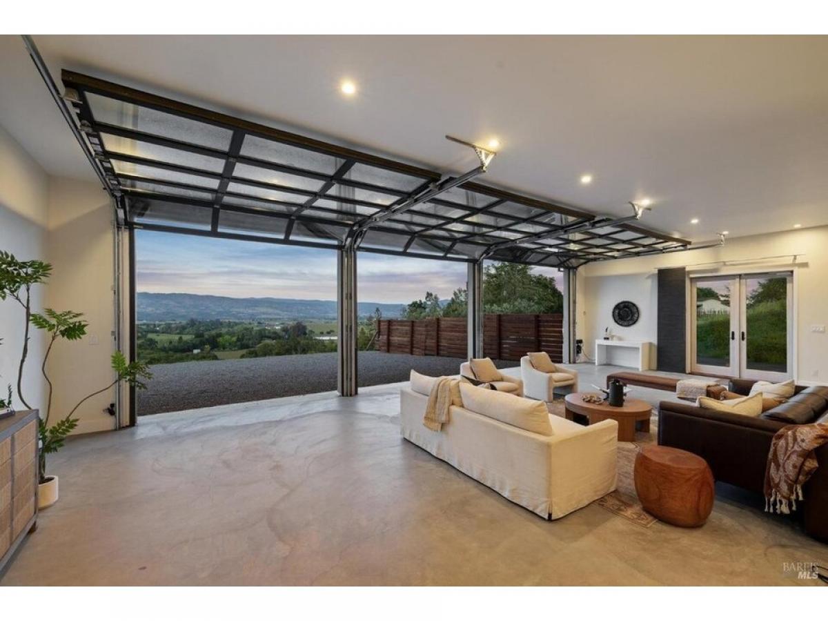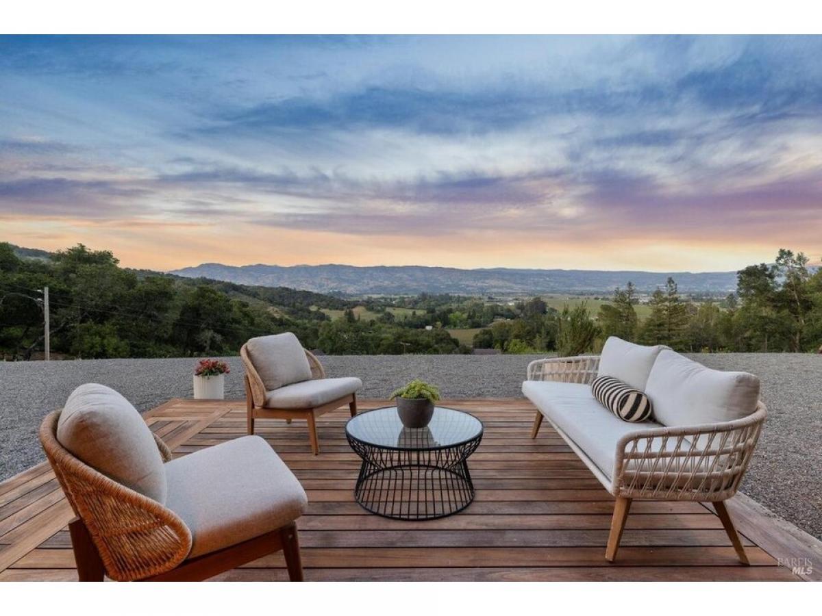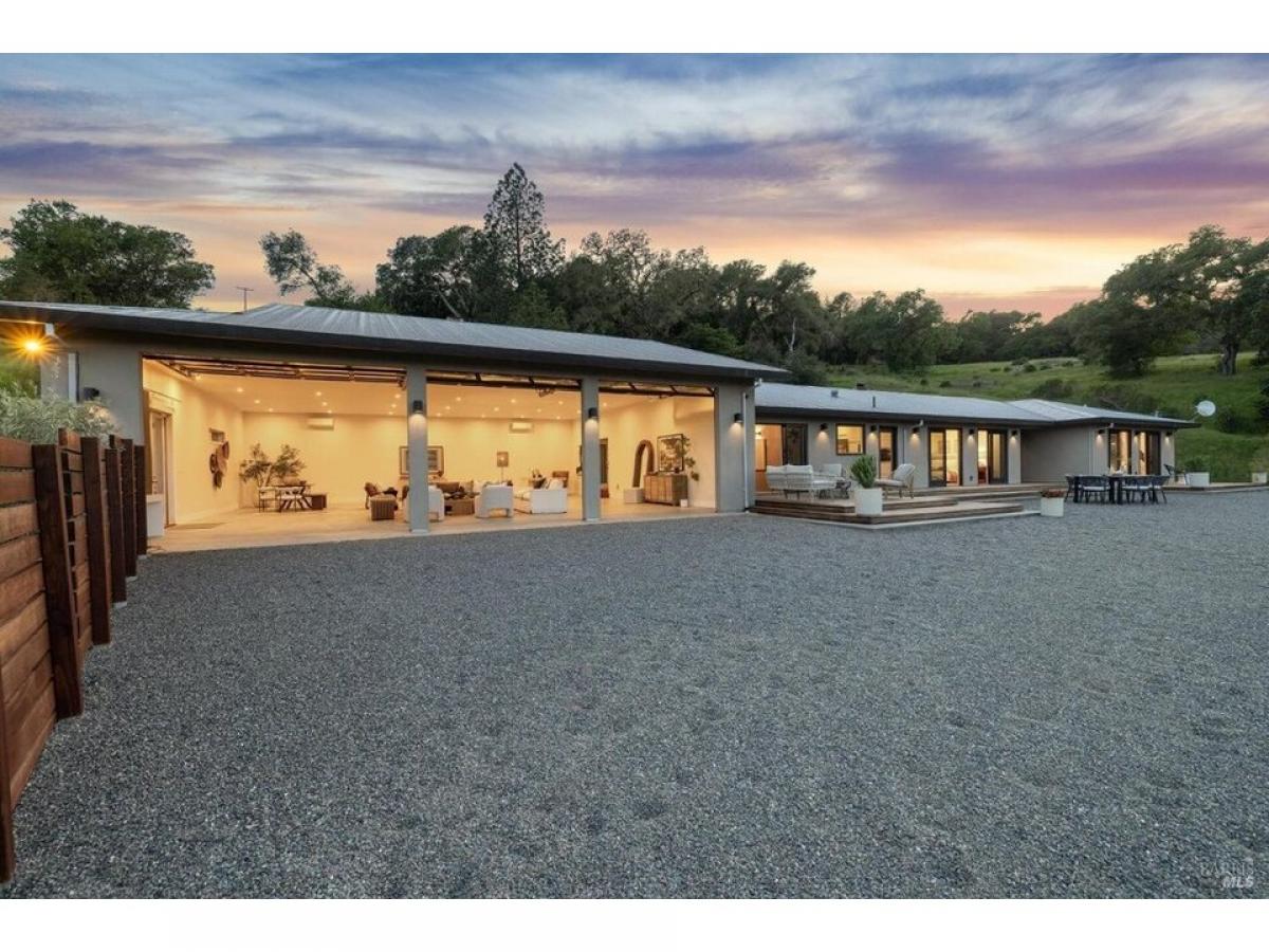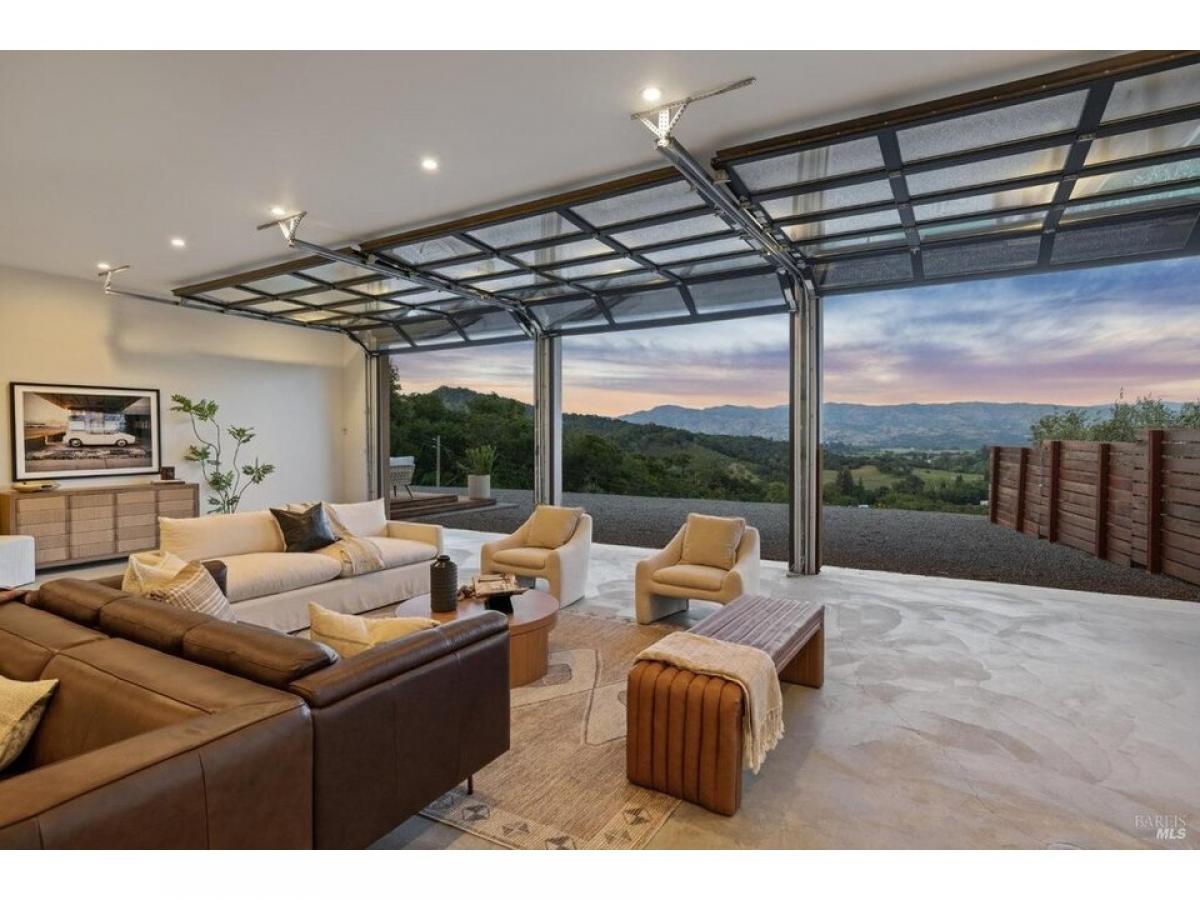 The Napa Sky Haus. Perched atop a private hill with sweeping, unobstructed views, this modern single-level home sits on 17 acres in the heart of Wine Country. Originally built in 1968, the current owners undertook a meticulous renovation, from a dazzling new kitchen amp; zen bathrooms, a cathedral dining hall, expansive IPE wood decks, solar power with backup battery, and an approved erosion control plan to plant 1.9 acres of vineyard. The home features three bedrooms and three bathrooms, including a spacious primary suite with valley views, and a spa bathroom with a soaking tub, steam shower, and custom walk-in closet. The showpiece of the property is a dramatic galleria space with soaring ceilings, polished concrete floors, and three glass roll-up doors w/electric screens framing breathtaking vistas. Currently used as an open-concept living area, the space can easily adapt to a media room, gallery, showroom, studio, or event venue. A newly constructed $2.5M driveway provides direct access from the main road to a large motor court with ample parking. This property offers the ultimate in privacy, flexibility, and California indoor-outdoor living.