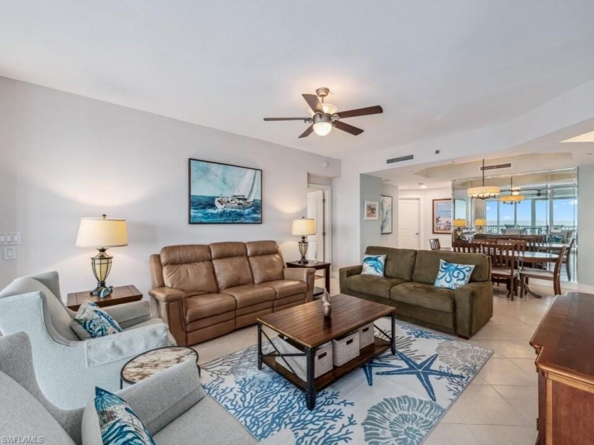 INCREDIBLE WATERFRONT VIEWS WITH BOAT SLIP INCLUDED! Experience breathtaking views from this stunning 9th-floor residence, offering panoramic vistas of the Gulf of Mexico from Marco Island to Sanibel. Spanning over 2,000 sq ft, this spacious 3-bedroom, 2.5-bath sky home features a private elevator entrance that opens directly into your living space. Enjoy morning sunrises from the open lanai off the two guest bedrooms and unwind in the expansive screened lanai facing west, accessible from the great room, kitchen, and primary suite, showcasing sweeping views of the intracoastal waterway and the shimmering Gulf beyond. Both the open balcony and screened lanai are equipped with electric hurricane shutters, ensuring complete hurricane protection. This residence also includes a rare semi-private, air-conditioned garage (shared with unit #891) and additional storage in the semi-private hallway with access to a freight elevator and a separate mechanical room featuring a Kinetico water system. Offered fully turnkey furnished, this property also includes boat slip #129 (10,000 lb) at Hibiscus Point! Sunset Gulf building boasts a semi-private elevator with secure access codes for each unit, ensuring convenience and privacy. Amenities include a fitness room, sauna, steam room, guest suites, community room, pool, hot tub, fishing pier, and lighted Har-Tru tennis courts, along with scenic walking and jogging paths. Residents of Waterside at Bay Beach also enjoy additional amenities such as four pickleball courts, two tennis courts, a driving range, and bocce. Donrsquo;t miss the opportunity to own this exquisite home in a prime location!