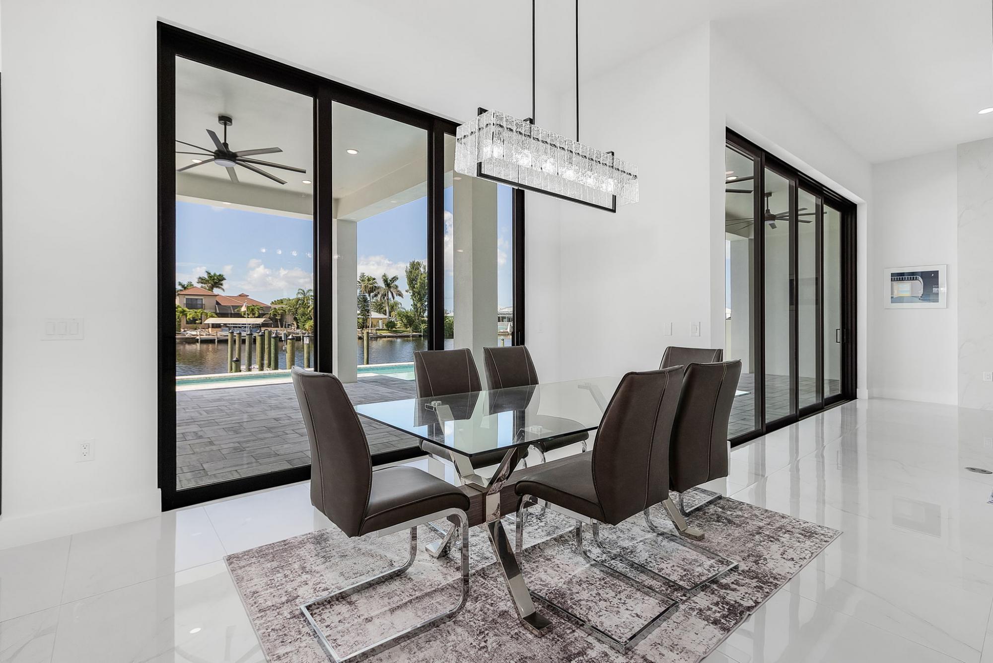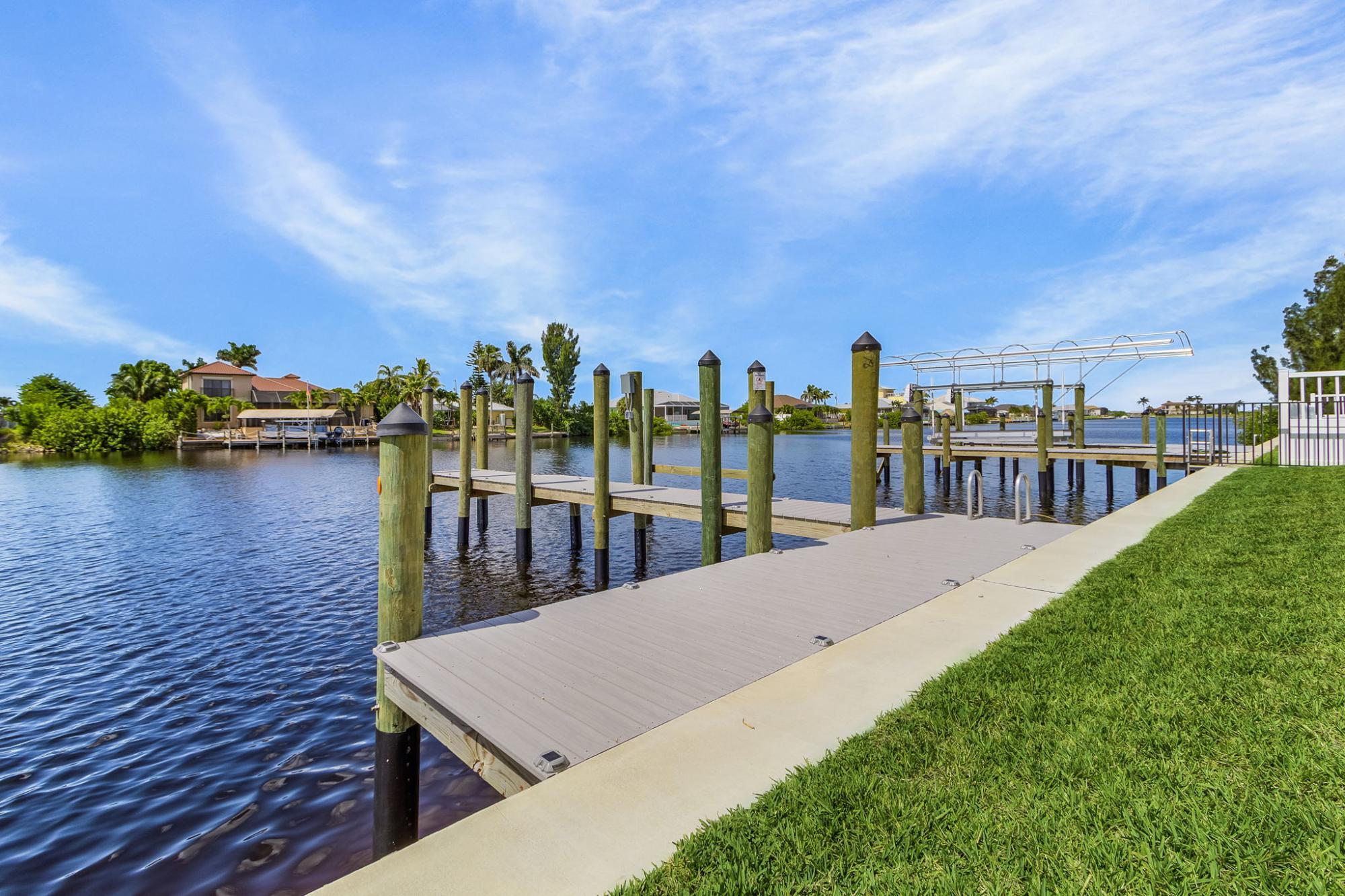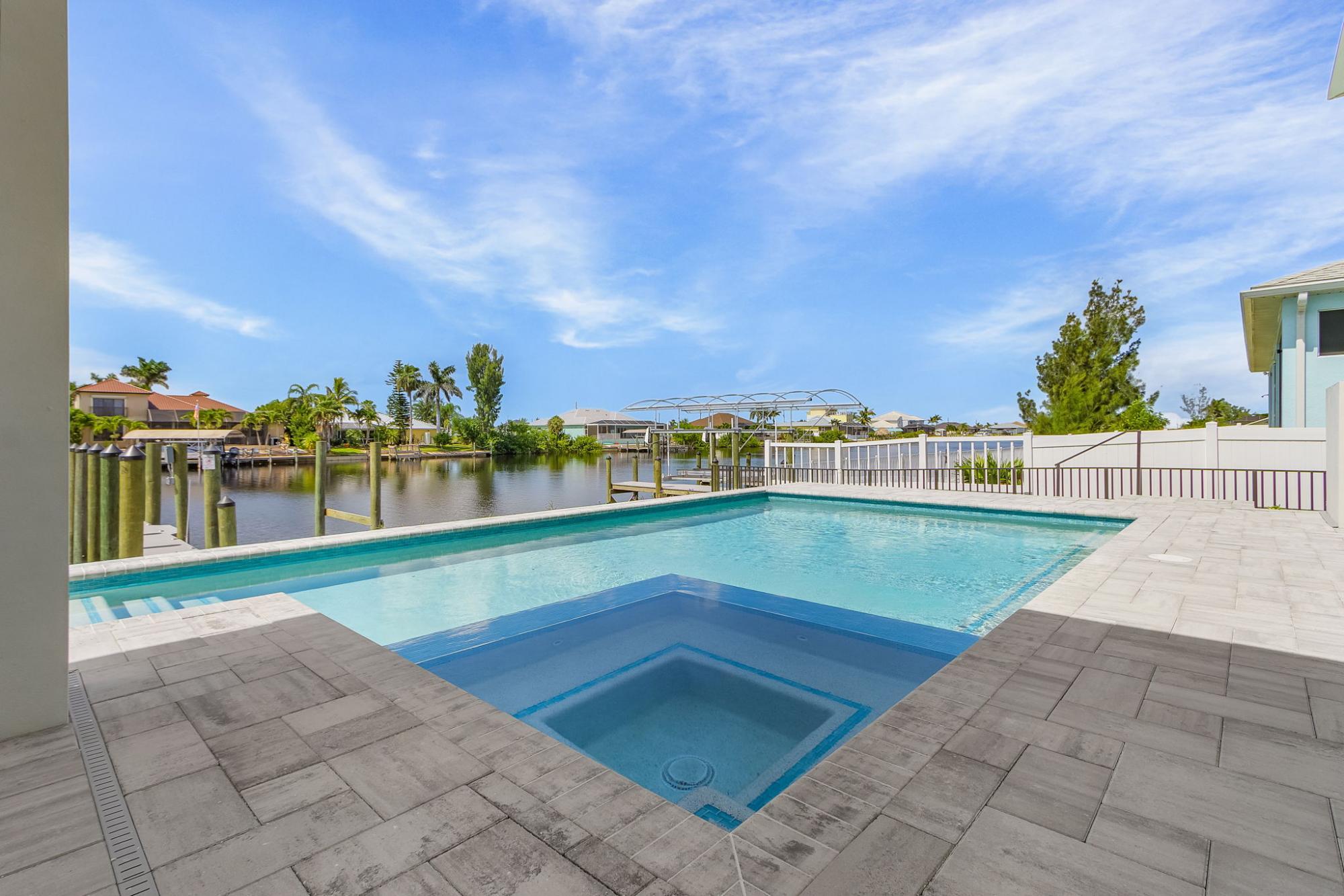 A truly must see, one of a kind custom designed home, “NOT A BUILDERS MODEL” New construction June 2025. 3Br. 3Ba. with den/office or permitted 4th bedroom, overlooking a south facing expansive 260 ft. wide canal with no bridges to the gulf. A boater’s dream includes a 2-slip composite dock large enough for a 50ft boat and a lift on the other side. No expense spared on this modern open floor plan design. 2665sf. of living space with soaring ceilings and 10ft high impact sliders overlooking the oversized almost 800 sf. lanai with a summer kitchen and bar. The fully automated (control from your phone) large saltwater pool features a custom spa and sun shelf. The master suite includes a spa inspired bath, twin vanities with 7’ led backlit mirrors, his and her double entry shower and soaking tub. Large 24X48 polished porcelain tiles throughout the house gives the house an elegant appearance and blends in with a fireplace and custom tile and wood wall feature. A custom large kitchen with espresso cabinets, a 10ft. island and top of the line Bosch appliances will truly inspire any chef’s dreams.