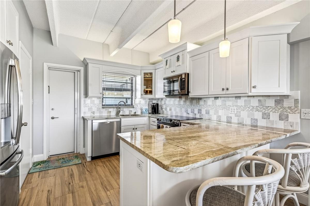 The Perfect Oceanside Retreat! Beautifully Renovated, Top Floor, South Exposure with views of the Ocean, Pool and Park. Offered fully furnished, Turn-Key. Featuring two master suites. Open kitchen with wide granite island for eating and entertaining. Stainless appliances, wood cabinets, extra storage, tile floors throughout. Washer & Dryer in the unit, impact glass doors & windows plus shutters. Elevator building, New Seawall. ONE PET allowed. Milestone Inspection Passed. Great rental property! Centrally located near shops, restaurants and the boardwalk!