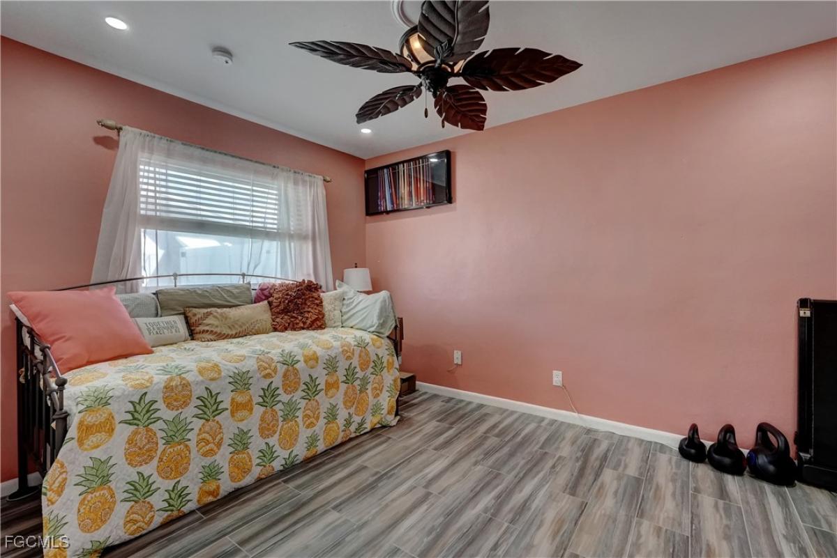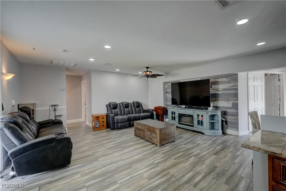 New Price! Take advantage of this price reduction now. Use your imagination to utilize the spaciousness of this home to create your unique design and living arrangement. This 3 bedroom, 3 full baths home with resort style swimming pool and spa is in one of the most conveniently located spots in Cape Coral! All within walking distance to entertainment, shopping, restaurants, social events, weekly Farmer's Market and much more. Enter into the open floor plan with luxury plank porcelain floor tile, recessed ceiling lighting, and beautiful ceiling fans throughout. The spacious primary bedroom with ensuite bath and huge walk-in closet leaves you to your design creativity for utilizing the space as your special retreat! The split bedroom plan provides privacy and convenience for family or guests with another bedroom also having it's own private full ensuite bath plus a convenient guest bathroom off the hallway. The family chef will enjoy meal preparation utilizing the gleaming stainless steel appliances, high-end GE Profile range with double oven and pantry. Conveniently located off the kitchen is the air conditioned laundry room with extra wash basin. The inviting swimming pool & spa is ideally situated with southern exposure and large area for relaxing in sun or shade. The back yard is fully fenced providing privacy for your outdoor enjoyment. The driveway has been conveniently widened to adequately accommodate multiple vehicle parking space. There are storm panels for wind protection and the home is on city water & sewer services with sprinkler system for irrigation. Take advantage of this opportunity to secure your home before the holidays Now!