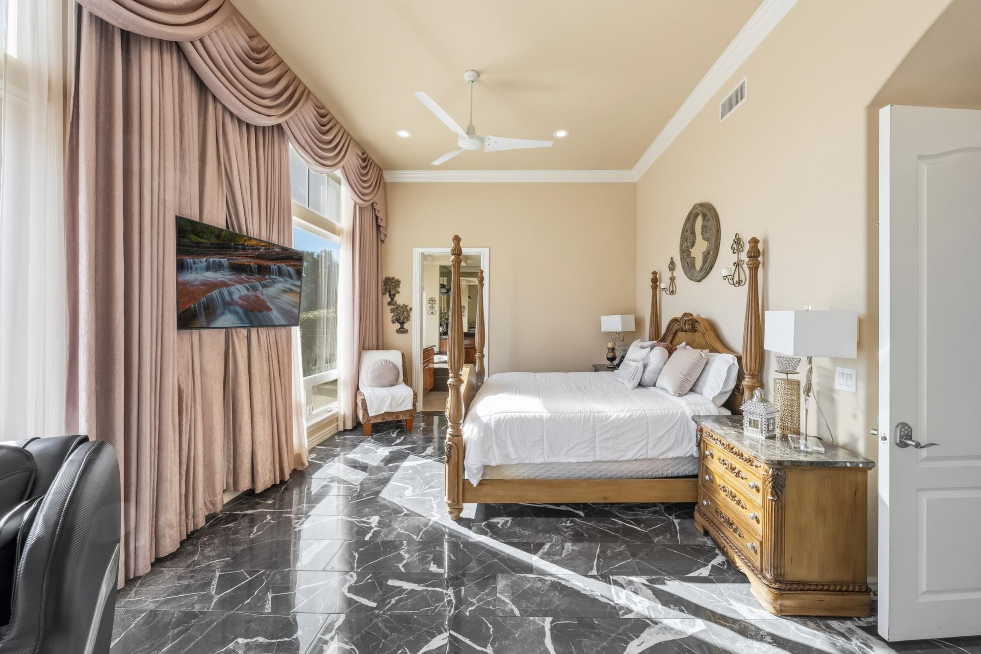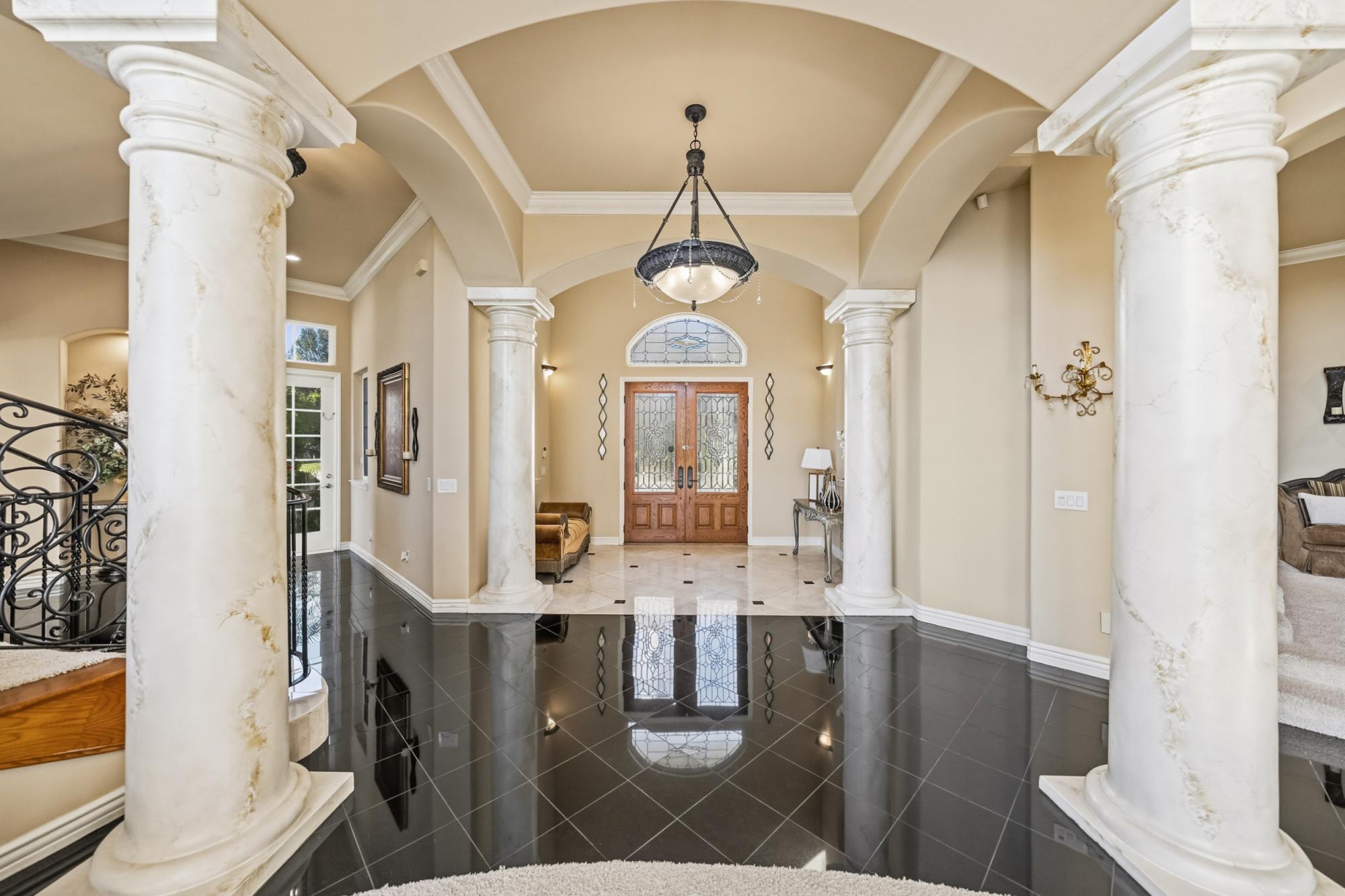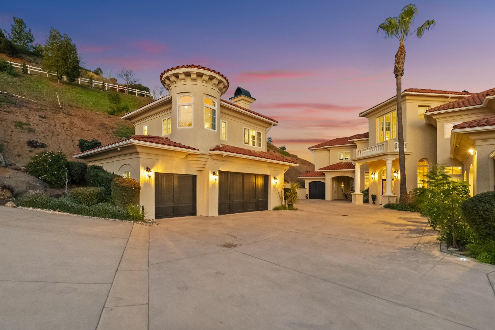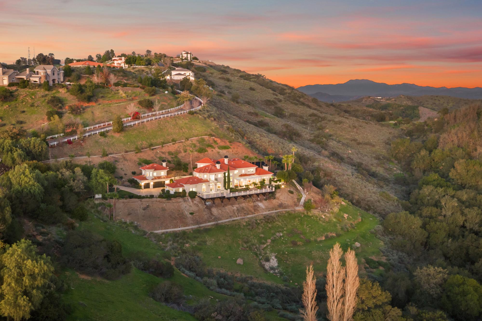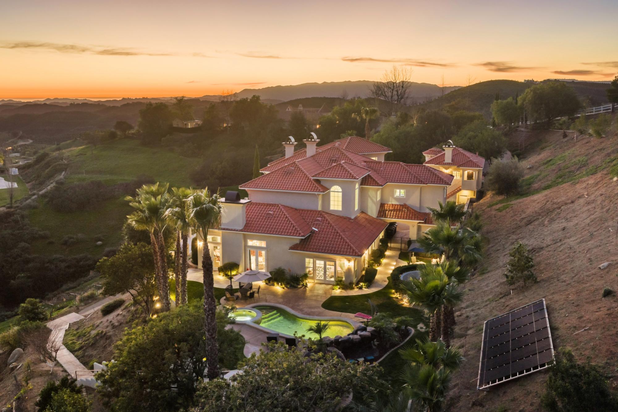 A breathtaking luxury estate in the prestigious gated Renaissance Estates community where timeless architecture converges on five acres and over 7,000 square feet of living space. Masterfully built, this residence has panoramic picturesque views of surrounding hills and valleys, tranquility and privacy. Experience high-end living, impeccably maintained landscapes, and various fruit trees, creating an atmosphere that elevates daily living just minutes from Old Town Temecula. The main residence welcomes you through glass double doors and cathedral ceilings with clerestory windows, illuminating the living room with Temecula’s stunning sunrise. Downstairs unveils a unique theater space and a ready-to-install elevator that makes this home stand out from all the rest. A formal dining room with a fireplace is adjacent to the gourmet kitchen that includes a center island with granite countertops, wine rack, butler's kitchen, high-quality milled wood cabinetry, reverse osmosis water system, and top of the line Bertazzoni six burner stove top with electric griddle. In the right wing, you’ll find the primary spa-like suite, which includes a jetted tub, double vanities, oversized closets, and double doors leading to the sweeping terrace overlooking majestic hills. The left wing offers another commodious guest suite with its own entry doors to the home. As you pass through corinthian marble pillars and walk up the grand staircase, you’ll find five spacious ensuite bedrooms with generous closet spaces, bathrooms, and a bonus room with built-in shelving. Additional home features include thirteen foot ceilings, a laundry chute, and lots of storage space. Entertain with ease when you step into the outdoor living space where you’ll find a spa, pool with its own paid-off solar, and a winding path leading you down to multiple fruit trees and vines. The separate guest house above a two car garage offers multi-generational living and includes a full kitchen, living room, one bedroom, and a full bath. Outdoors you’ll also find an additional car garage, comprehensive security system, and a brand new Generac generator with wifi. This home is a rare opportunity to own a private luxury residence in the heart of De Luz with close access to the 15 freeway.