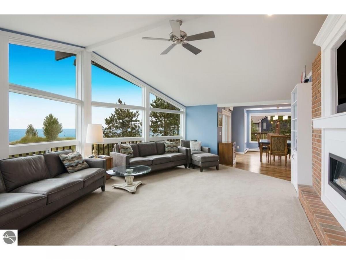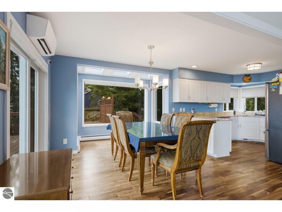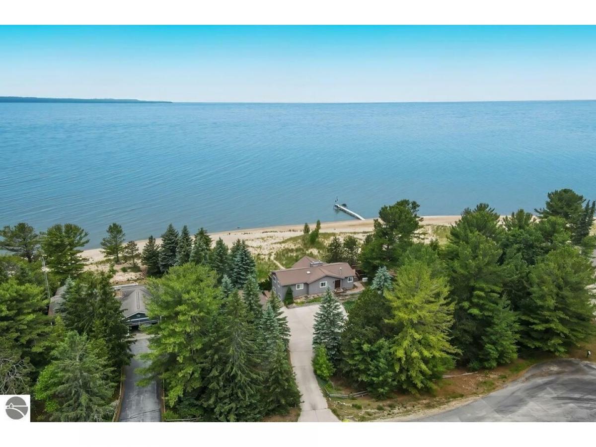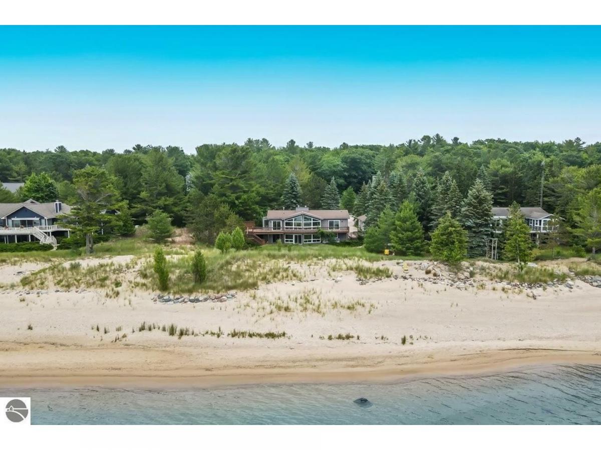 Gorgeous private sandy frontage on Grand Traverse Bay just north of Elk Rapids. This lovely 5 bedroom home has a stunning living room with prow windows to take full advantage of the expansive views. Kitchen and dining have easy deck access for al fresco dining bay side. Wake up to the gorgeous views in the primary bedroom with attached bath. 2 additional bedrooms and bath on the main floor. Walk out lower level has a spacious family room ideal for tv nights. 2 additional bedrooms and full bath as well as an office space with its own entrance. Oversized 2 car garage has room for all the toys. Major improvements since 2017 - New Windows & Doors (Pella), Full House Generator, New Boiler, Sea Wall at Waters Edge, New Dock included.