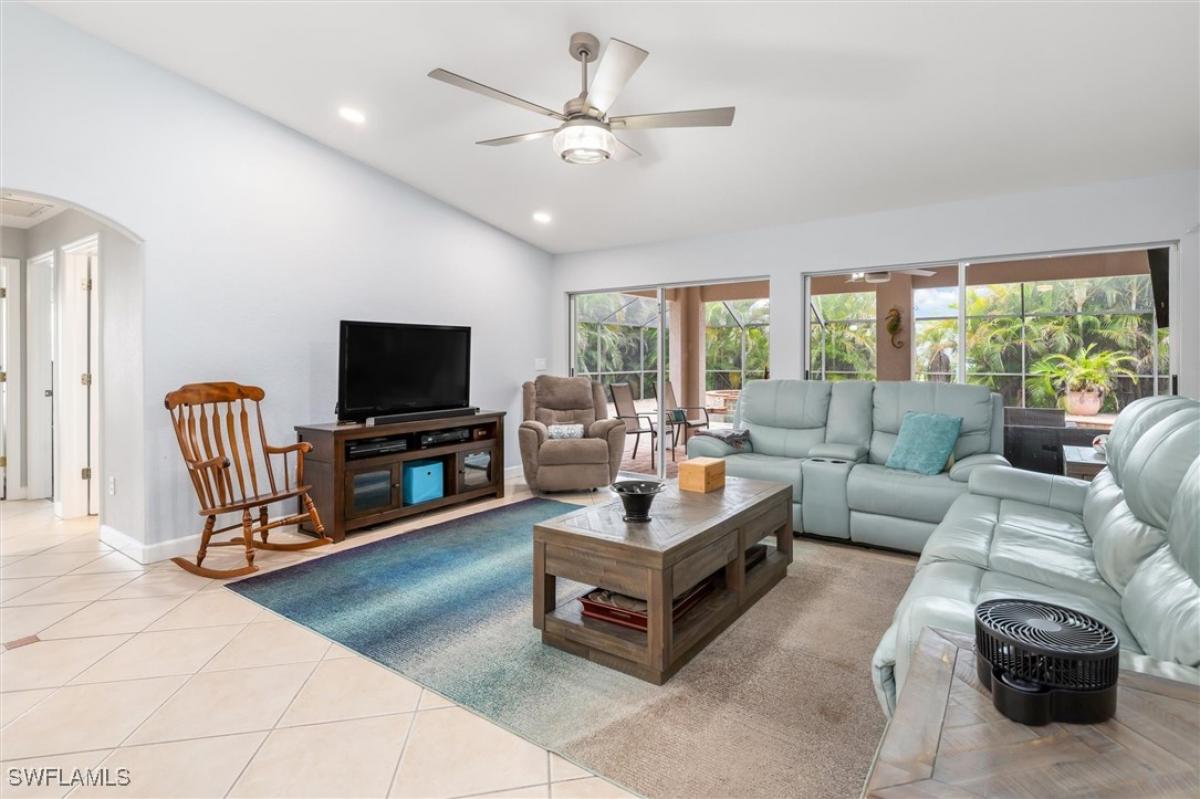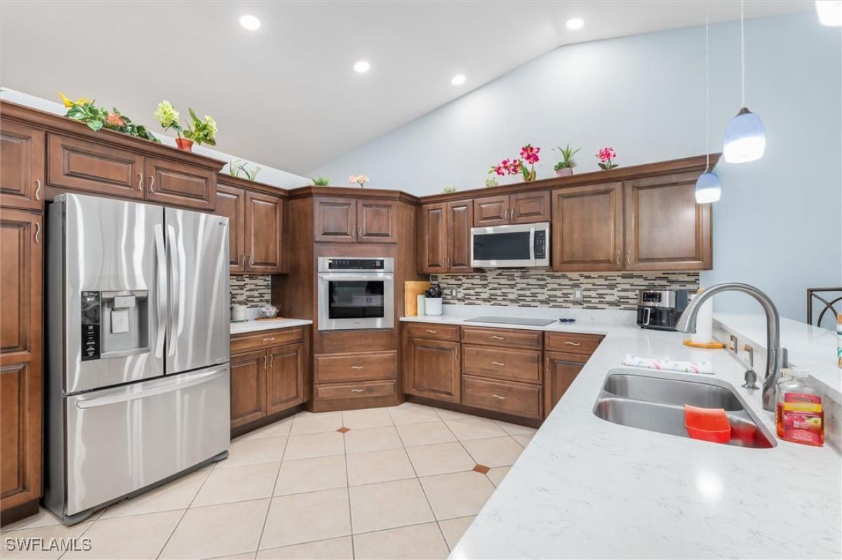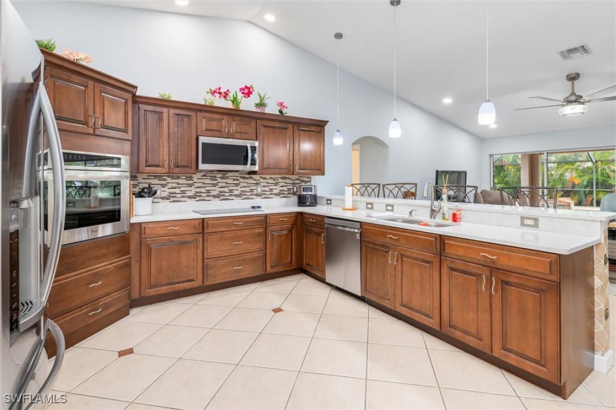 Price Reduction on this Very nice SW location. Close to Dining & Entertainment as well as most every other service you could ask for. This 3BR, 2BA Almost 2000sq ft home has been recently upgraded with new all wood cabinets, quarts counters,matching stainless appliances, glass cooktop and built-in oven. The master bedroom has an attached "Yoga Room" that could be a private office or setting room. master bath W/dual sinks, separate tub & shower, all tile or laminate flooring throughout, no carpet. The Screened Lanai features lots of room around the Heated Spa and Pool as well as being plumbed and wired for an Outdoor Kitchen. Under Truss seating area with TV already in place. This "Mercedes" built home did not flood, but it did sustain some water intrusion from the roof, this was all remediated with new insulation, drywall and paint. The paver drive and landscape just adds to attraction of this home. Bring your Buyers, They won't be disappointed!!!