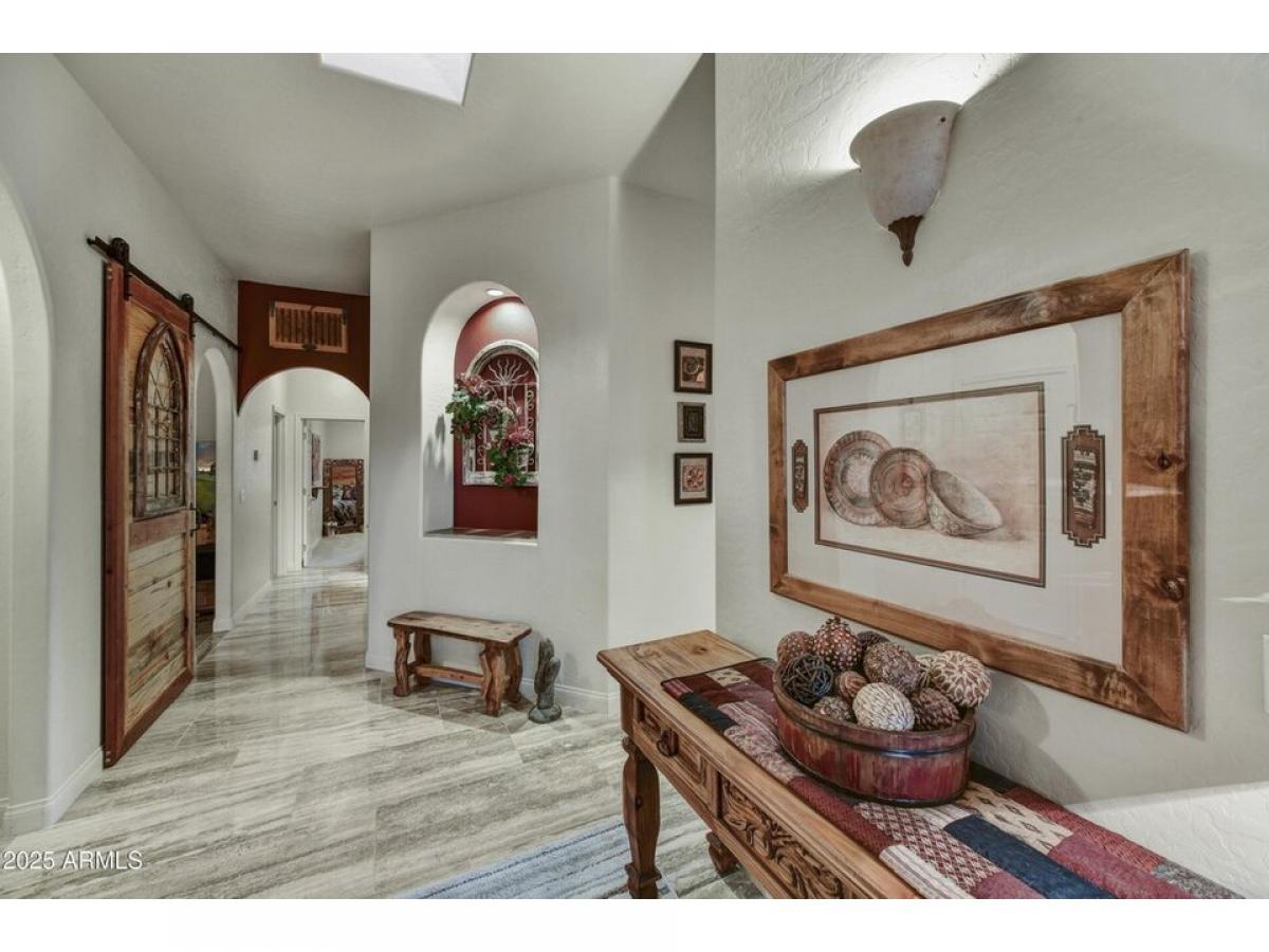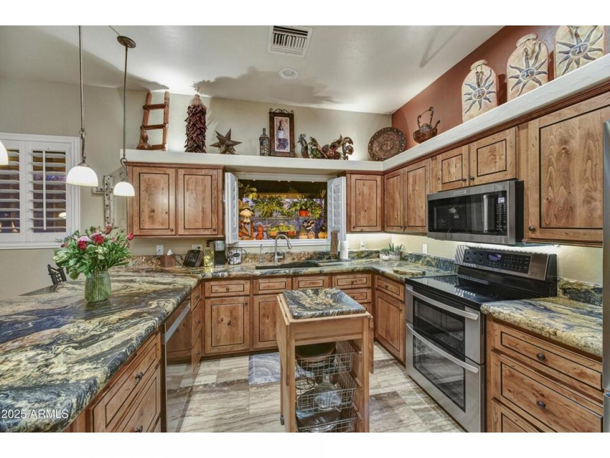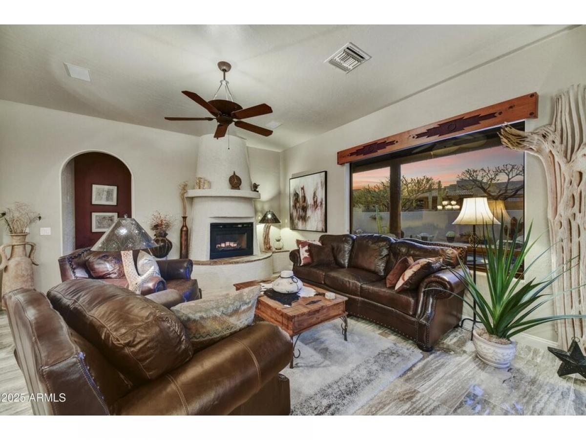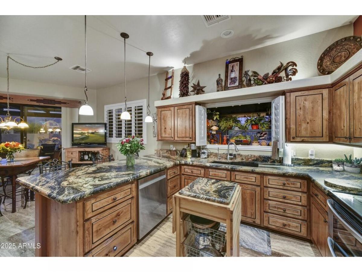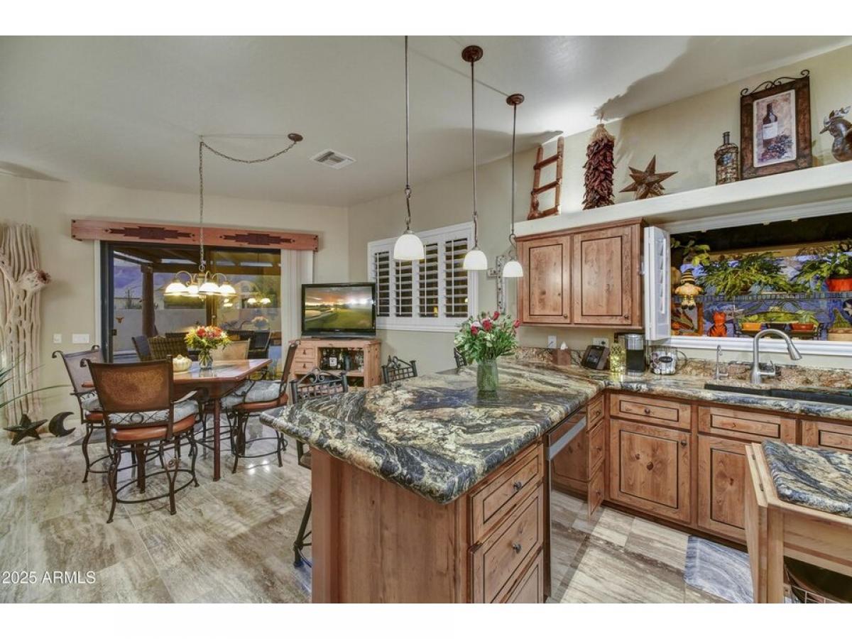 OFFERED TURNKEY FURNISHED MINUS PERSONAL ITEMS. Very attractive, well-maintained, amp; pride of ownership best describes this Gold Canyon East gem! Quiet streets, on 2 quiet corners amp; only one neighbor w/both unbeatable Superstition Mountain amp; Dinosaur Mountain poolside views. Incredible sunrises amp; sunsets abound! Polished Travertine flooring, leathered granite counters amp; custom made solid wood cabinetry, w/under counter lighting. Newer appliances. Plantation shutters, formal dining room, 2-way interior fireplace, skylights, spacious backyard w/heated Pebbletec pool, free standing spa, waterfall, newer hot water heater w/recirc pump, fireplace, built-in BBQ, outdoor kitchen. Misting system. Extended length garage with extensive real wood custom cabinets amp; carpenter#039;s dream work bench area. Garage bays run from 19#039; to 26#039;6quot;. Large TV/media den with back bedroom/closets. Art niches w/lighting, landscape lighting. Primary bedroom closet with build out. Adjacent to small park, natural open area, enhancing privacy while preserving mountain views. Ring Door Bell system and 4 additional cameras. Meticulous condition inside and out.