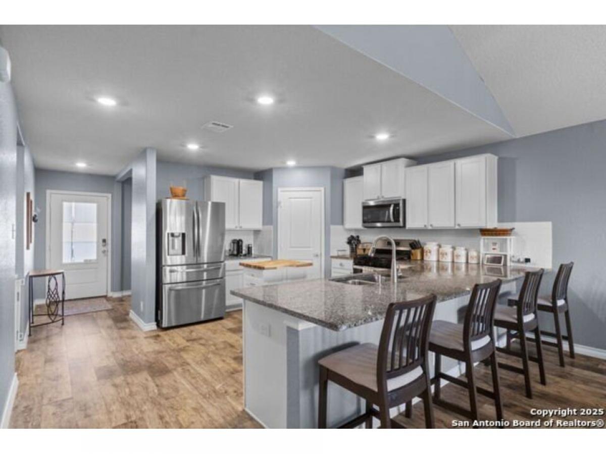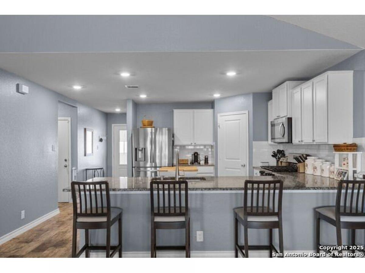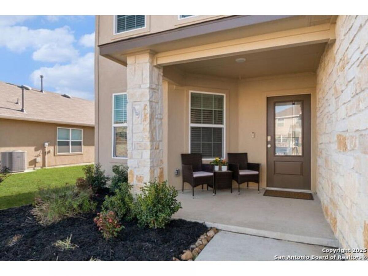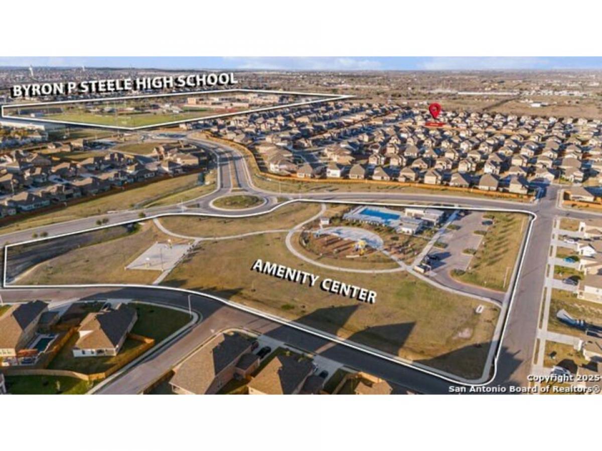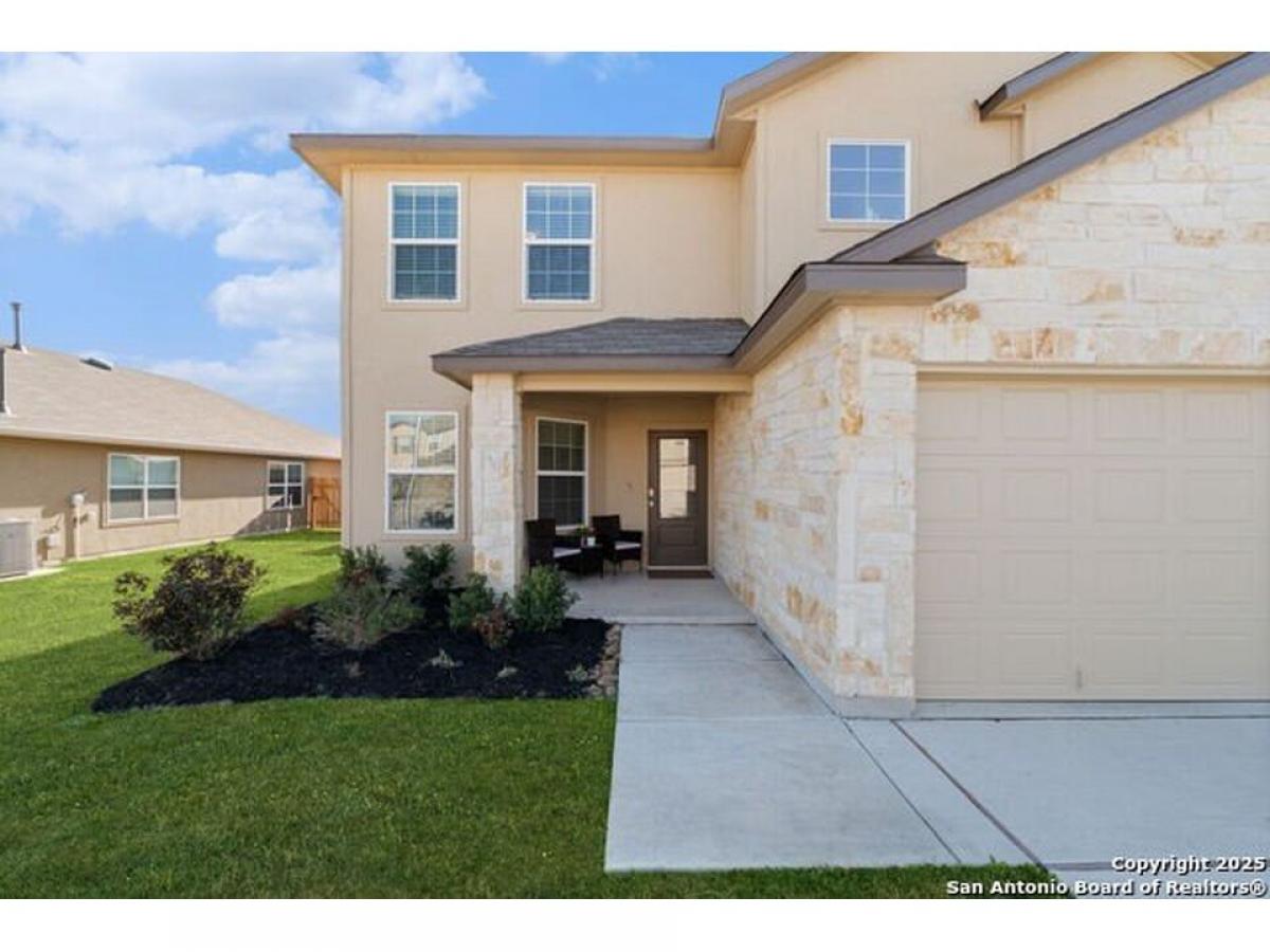 Not far from bustling but quaint downtown Cibolo, just one block from Steele High School and one block from the incredible Steele Creek Amenities Center - This stunning two-story home offers a thoughtfully designed living space with 4 bedrooms and 2.5 bathrooms. The Walsh floor plan was the most popular floor plan in Steele Creek and there are no more available. This your opportunity! As you approach the home, a charming covered front porch leads into an elegant formal dining room or possible flex room, setting the tone for the rest of the home. Enter the hallway and you#039;re greeted by a beautiful open kitchen featuring sleek stainless steel appliances, granite countertops, a trendy white subway tile backsplash, a spacious corner pantry, ample cabinet space, and a generous eat-in breakfast bar. The kitchen flows into a large living room with a striking vaulted ceiling. The living area opens to a covered patio that overlooks a huge backyard, ideal for outdoor dining or entertaining, with green space behind that limits direct exposure to backyard neighbors. The private primary suite is conveniently located downstairs off the family room. The ensuite bath has dual vanities, a separate tub and shower, ceramic tile flooring, a water closet, and a spacious walk-in closet with built-in shelving. A half-bath is located just off the family room, and the oversized utility room is near the kitchen and stairs. Upstairs, you#039;ll find a large game room or office area, a second full bath, and three generously sized secondary bedrooms, two with walk-in closets. Additional highlights include 9-foot ceilings, luxury vinyl plank flooring in the entryway, family room, kitchen, and dining room, ceramic tile in all bathrooms and the utility room, a well maintained water softener, and did I mention the huge backyard? Located in a desirable neighborhood, this home offers outstanding amenities such as a large lap pool, expansive playground, sports courts, and scenic jogging trails. With convenient access to nearby shops, dining options, and top-rated schools, it truly has everything you need.