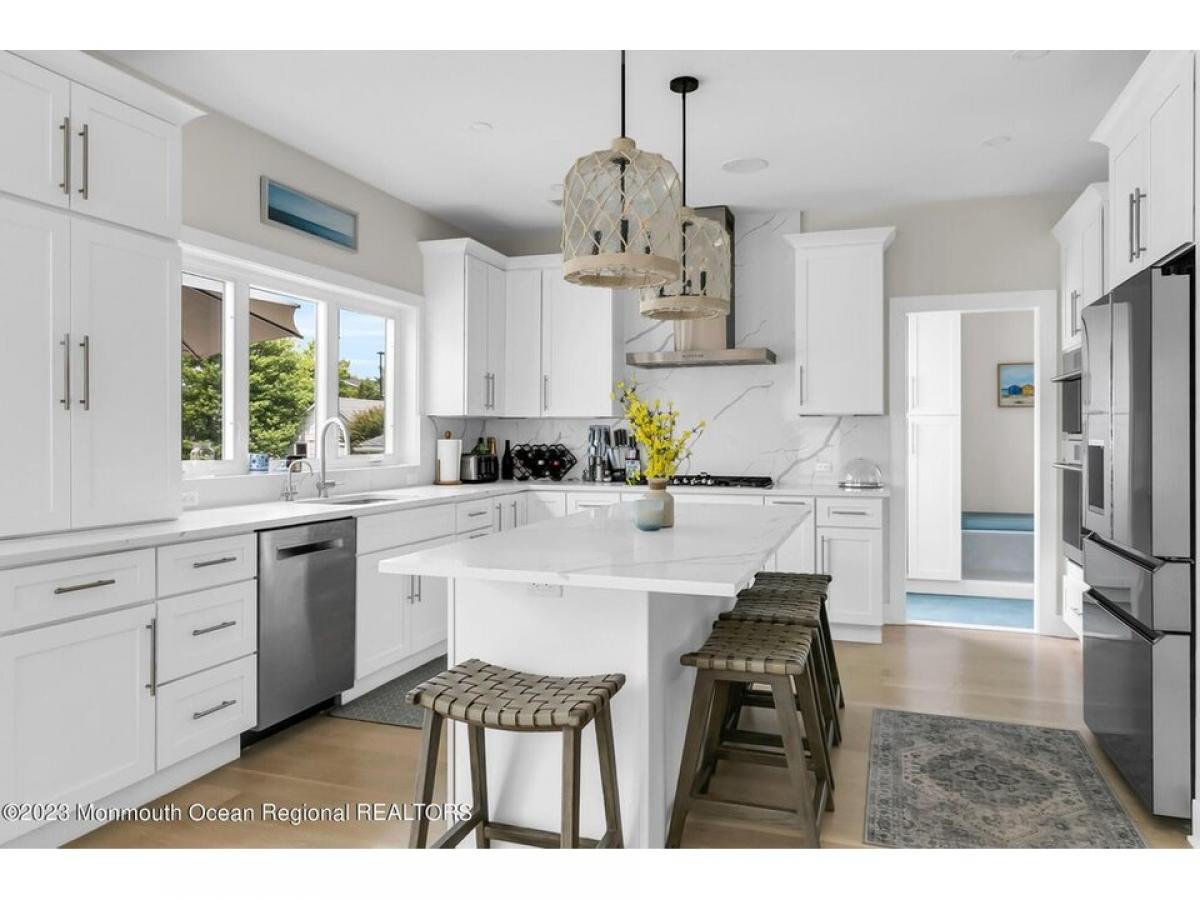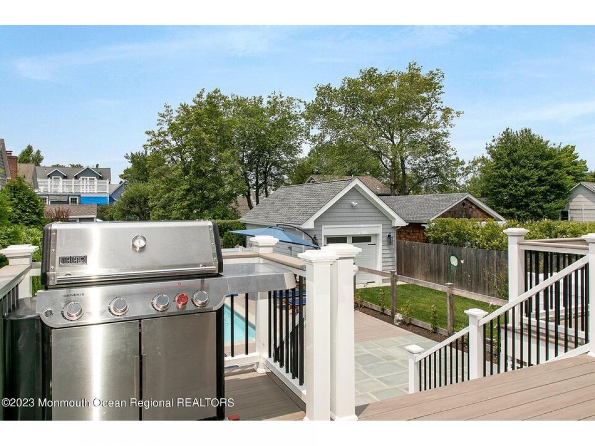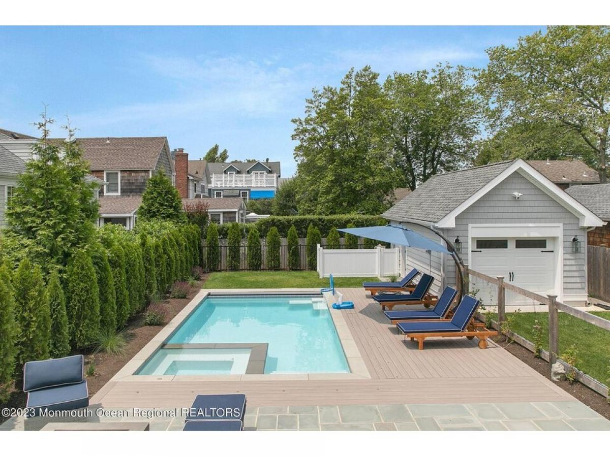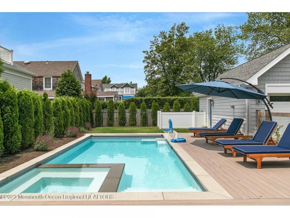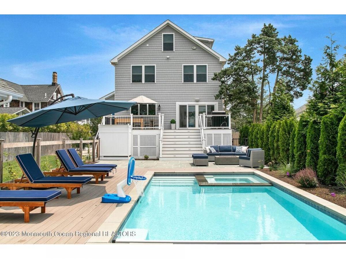 WEEKLY RENTAL:Brand new home in the heart of Bay Head! Features include an open floor plan, covered front porch, large rear deck, backyard pool, and ample parking. There are 3 bedrooms and 2 baths on the second floor, including the master suite, plus additional bedroom space and another full bath on the third floor (4 beds, plus a seating area). Sleeps 14. Walk or bike to any part of town - the shops, restaurants, beaches, and more! 6 beach badges are provided, as are 6 beach chairs. Bikes are also available for your use. Relax by the pool, or enjoy the hot tub! Other features include a gas grill and outdoor speakers. Pets are not permitted. Now considering 2025 rentals, $16,000 per week. Utilities are not included. **Owner prefers August dates, but might consider late July.