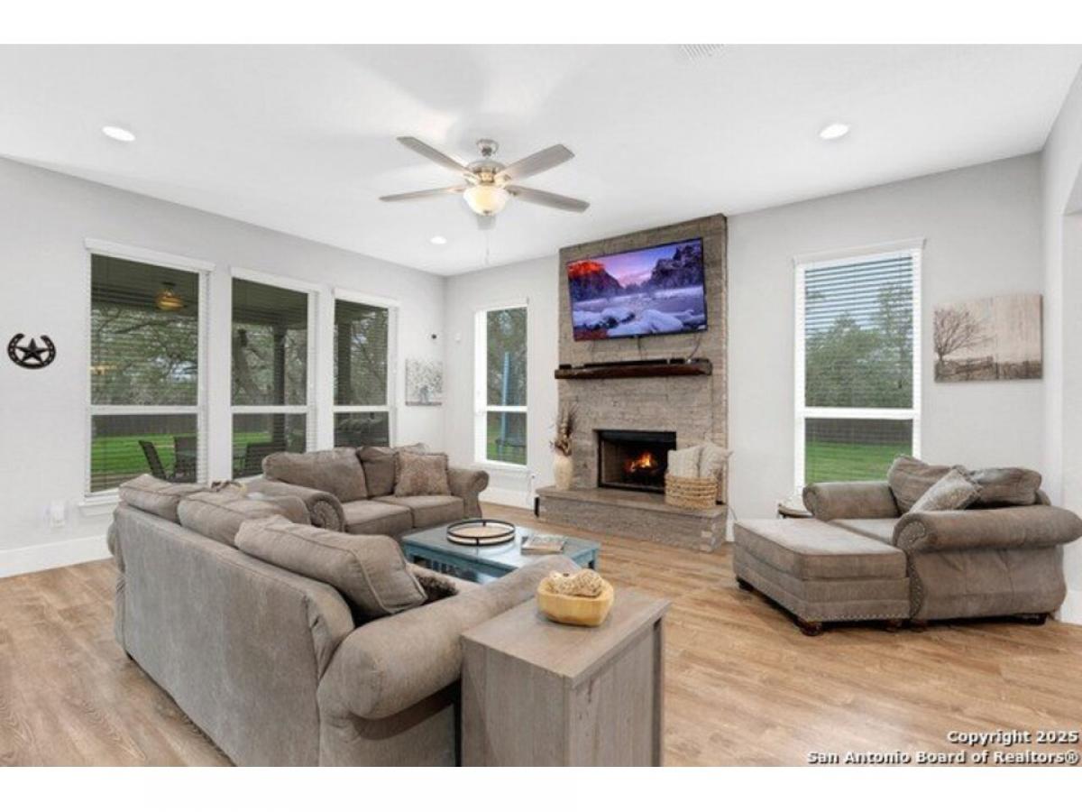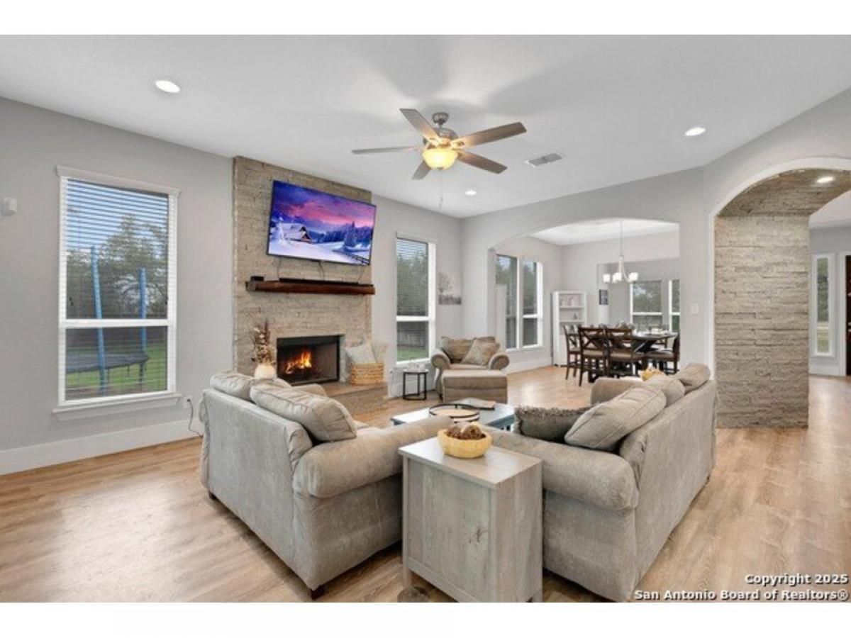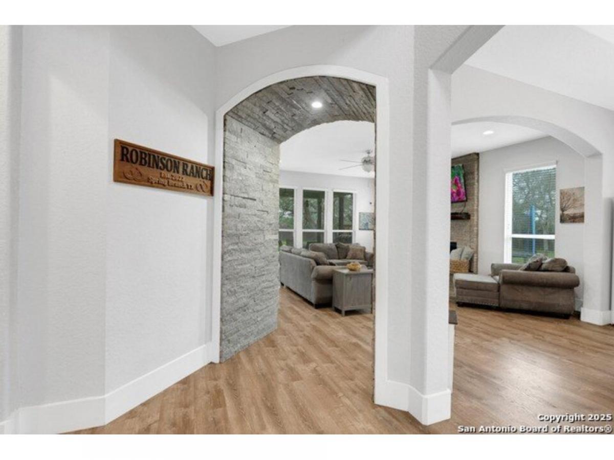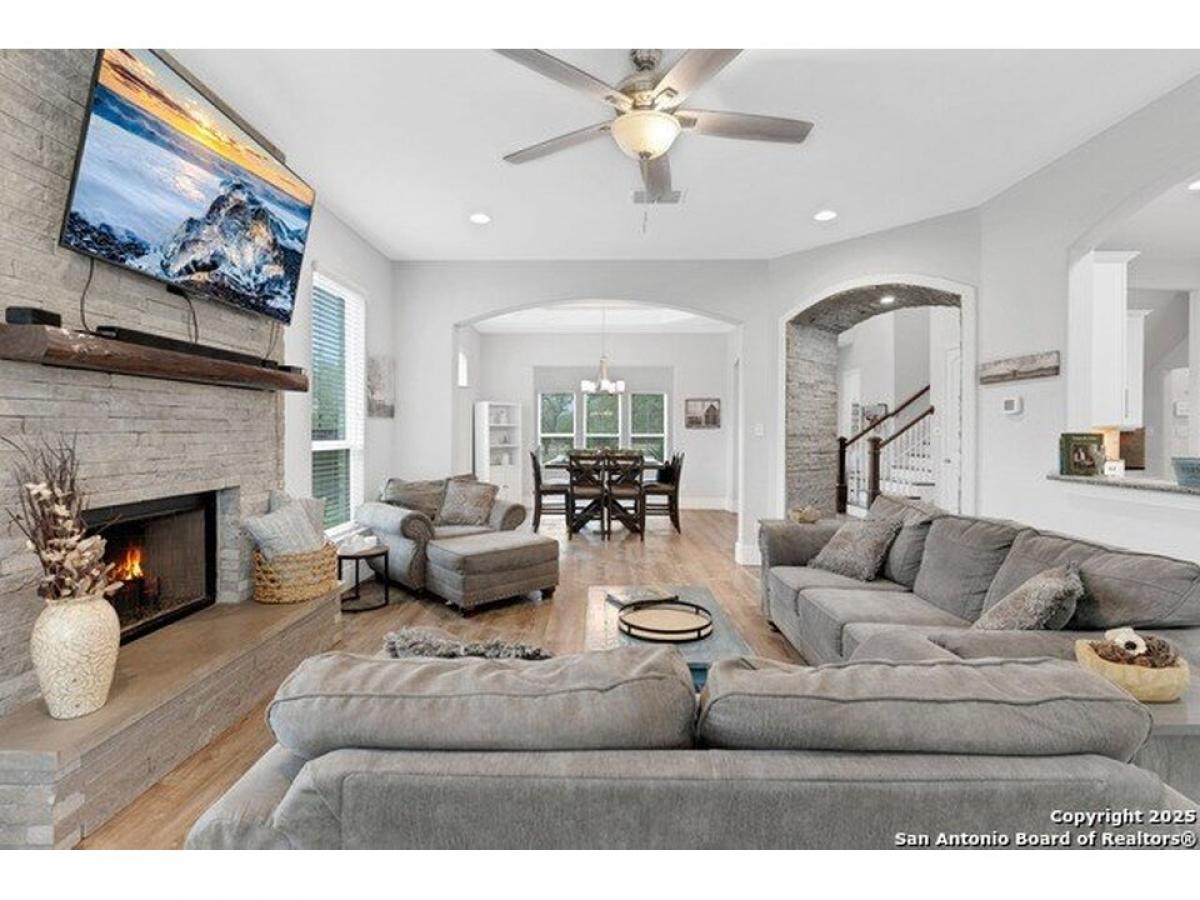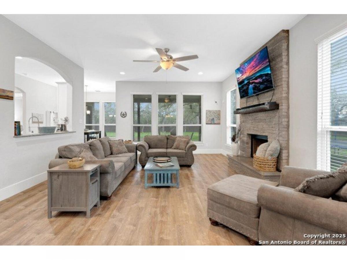 Stunning Two story, 5 Bedroom/4.5 Bath/3 car garage home in Gated Serenity Oaks*3657 square feet on 1.21 Acres*No carpet throughout! Family room with natural light with gorgeous stone fireplace w/gas/propane logs *Art Niches and custom stacked stone accents*Gourmet kitchen with Double ovens, Farmhouse sink, Gas/propane cooking, leather granite island, plenty of cabinets for extra storage*Adjacent wine/coffee bar*Formal dining room*Study/flex space*Secondary bedroom downstairs with full bath*Primary suite with outside access, vaulted ceilings, Separate vanities, large custom shower*Upstairs includes 22quot; Sierra Artisian Luxury vinyl plank flooring with 3 additional bedrooms and 2 full baths, Gameroom and desk/study space*Privacy fenced backyard on a greenbelt with mature trees, oversized covered patio with propane line and outdoor TV connections*Vegetable garden and Herb Garden, Sprinkler system*Kinetico filtration system*Security System*Metal Roof*Comal County Schools*Community Amenities include Jr. Olympic Pool, Basketball amp; Pickleball Court, Private Park with access to the Guadalupe River, playground and adjacent to the Rebecca Creek Golf Course! No City Taxes!!!!
