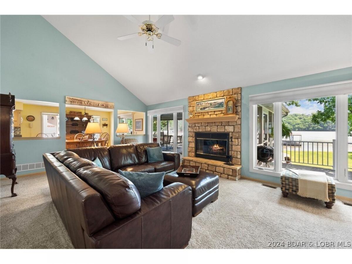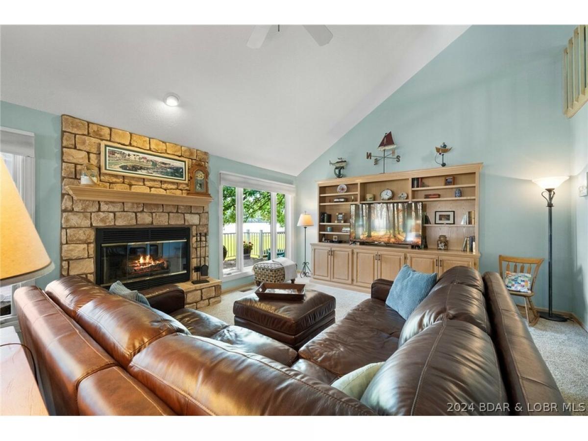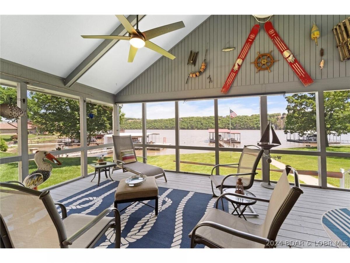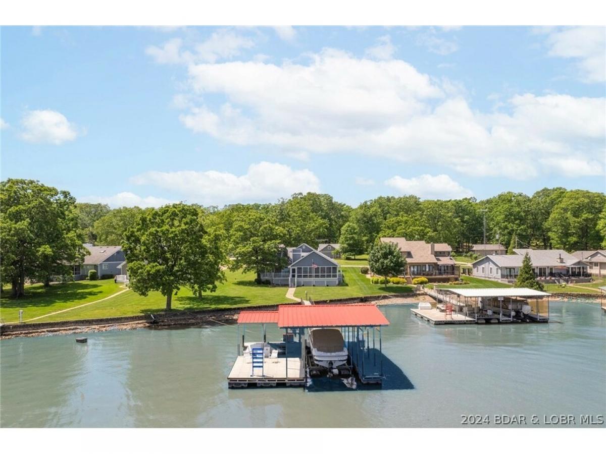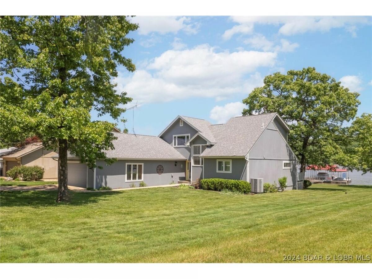 Scandia Subdivision is one of those neighborhoods that dreams are made of. Gentle topo with abundant greenspace is the hallmark of this cherished location at the 37 mile marker of the Lake of the Ozarks. Rarely found, flat waterfront lot with a spectacular view, awaits you here. You will be practically living on the screened deck lakeside, while you watch eagles soar and plunge into the water for their meals and summer time boaters living the good life. Practical floor plan offers big views from nearly all the rooms in the house. Entertaining is easy here. Spacious, open kitchen and dining area, coffee bar, pull-outs in cabinets and built-in wet bar in the living room. Main level living with lakeside primary suite with walk-in shower, jetted tub and double vanity. Bonus/office area off kitchen and large attached garage with ample storage. Additional lot is included across the street with an oversized 2 car garage with workshop & pull down storage! Perfect set up for a number of hobbies. Plenty of room for gardening, too. Nearly new boat dock w/boat lift, covered space for personal watercraft w/lift and swim platform with wet steps. Partial furniture included. Boat available.