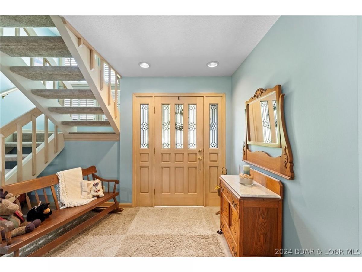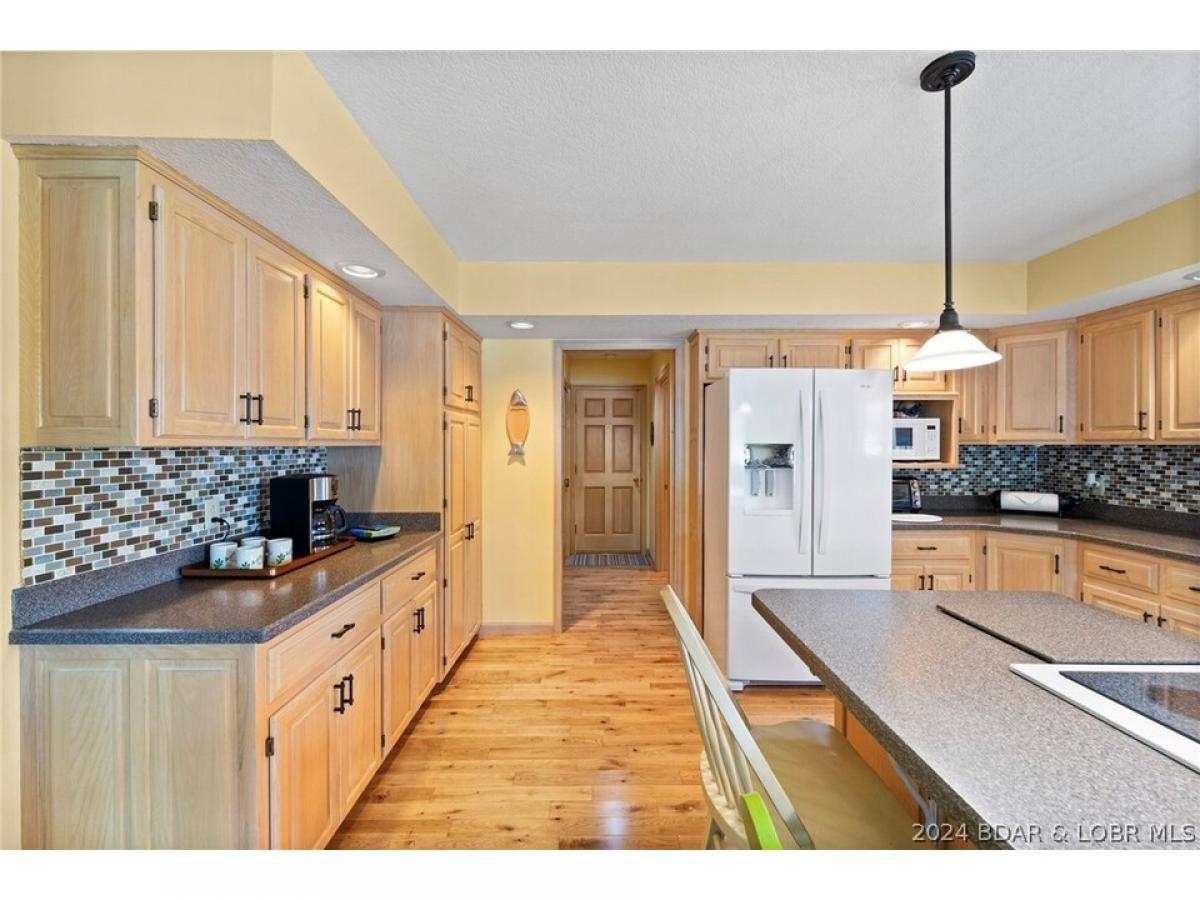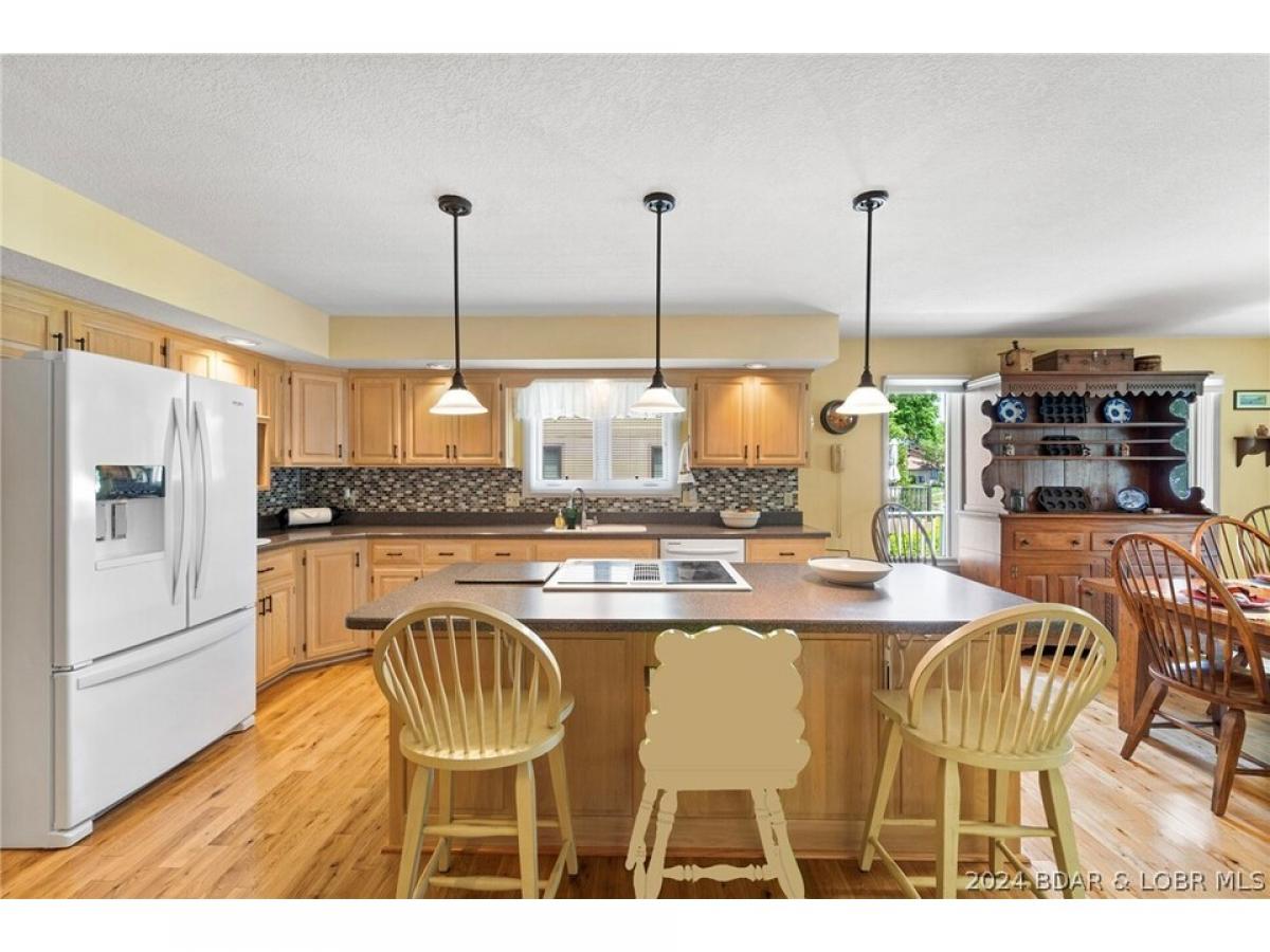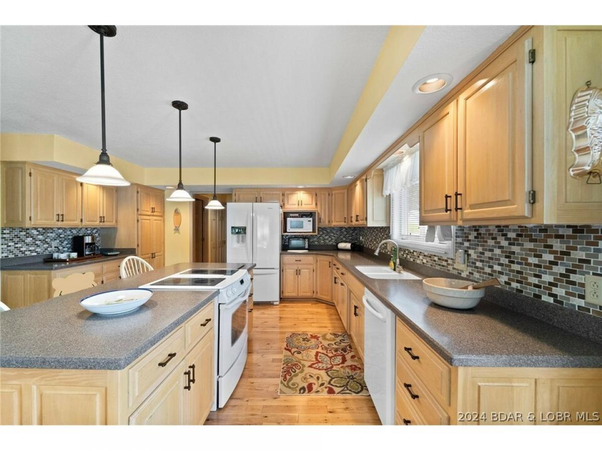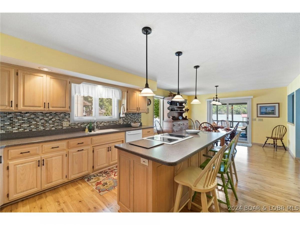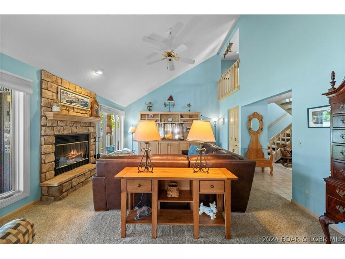 Scandia Subdivision is one of those neighborhoods that dreams are made of. Gentle topo with abundant greenspace is the hallmark of this cherished location at the 37 mile marker of the Lake of the Ozarks. Rarely found, flat waterfront lot with a spectacular view, awaits you here. You will be practically living on the screened deck lakeside, while you watch eagles soar and plunge into the water for their meals and summer time boaters living the good life. Practical floor plan offers big views from nearly all the rooms in the house. Entertaining is easy here. Spacious, open kitchen and dining area, coffee bar, pull-outs in cabinets and built-in wet bar in the living room. Main level living with lakeside primary suite with walk-in shower, jetted tub and double vanity. Bonus/office area off kitchen and large attached garage with ample storage. Additional lot is included across the street with an oversized 2 car garage with workshop & pull down storage! Perfect set up for a number of hobbies. Plenty of room for gardening, too. Nearly new boat dock w/boat lift, covered space for personal watercraft w/lift and swim platform with wet steps. Partial furniture included. Boat available.