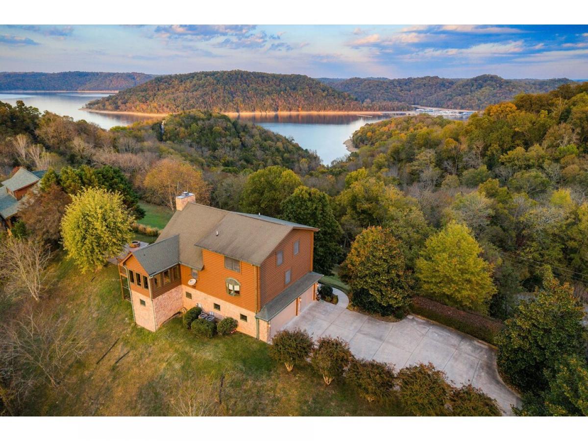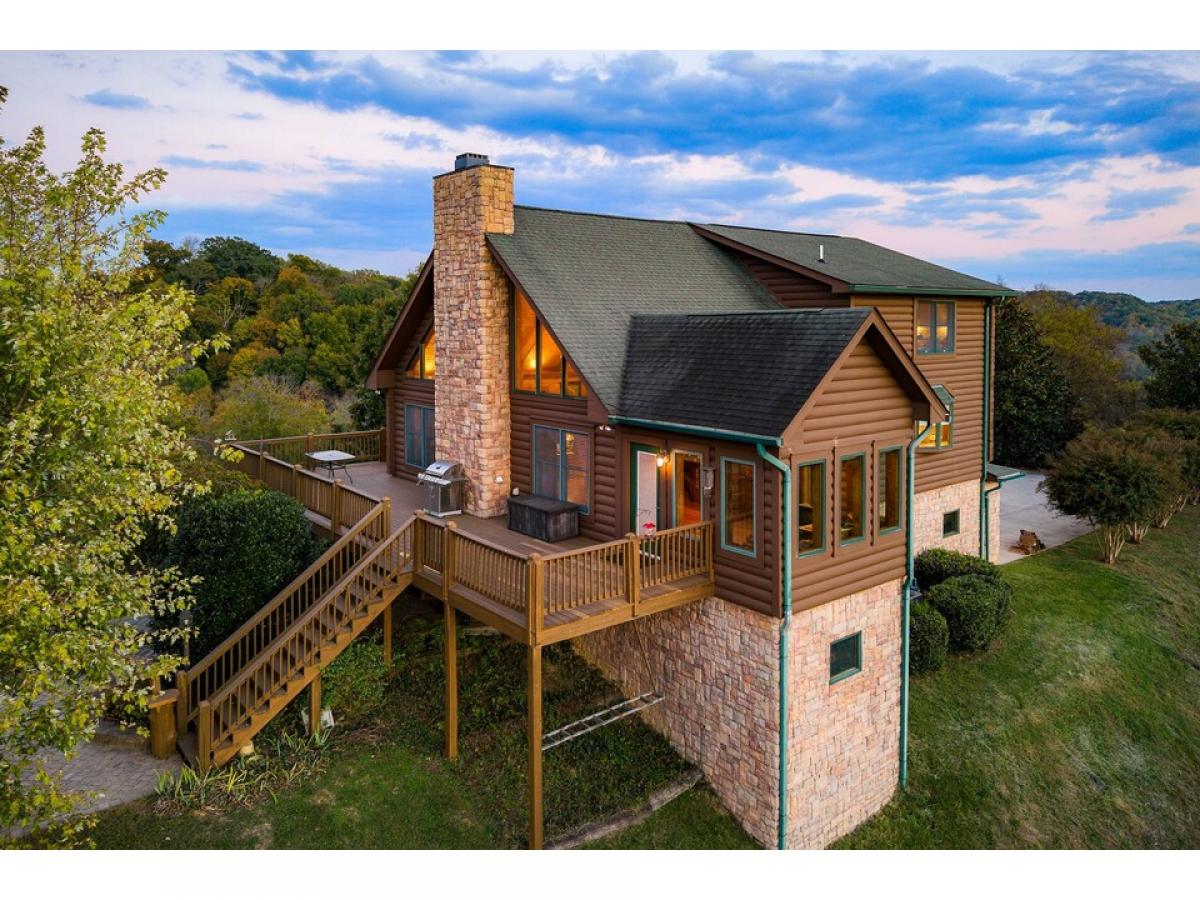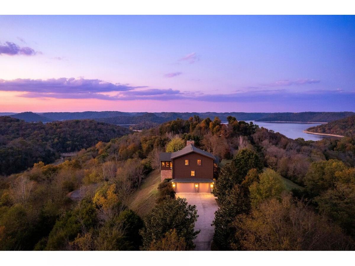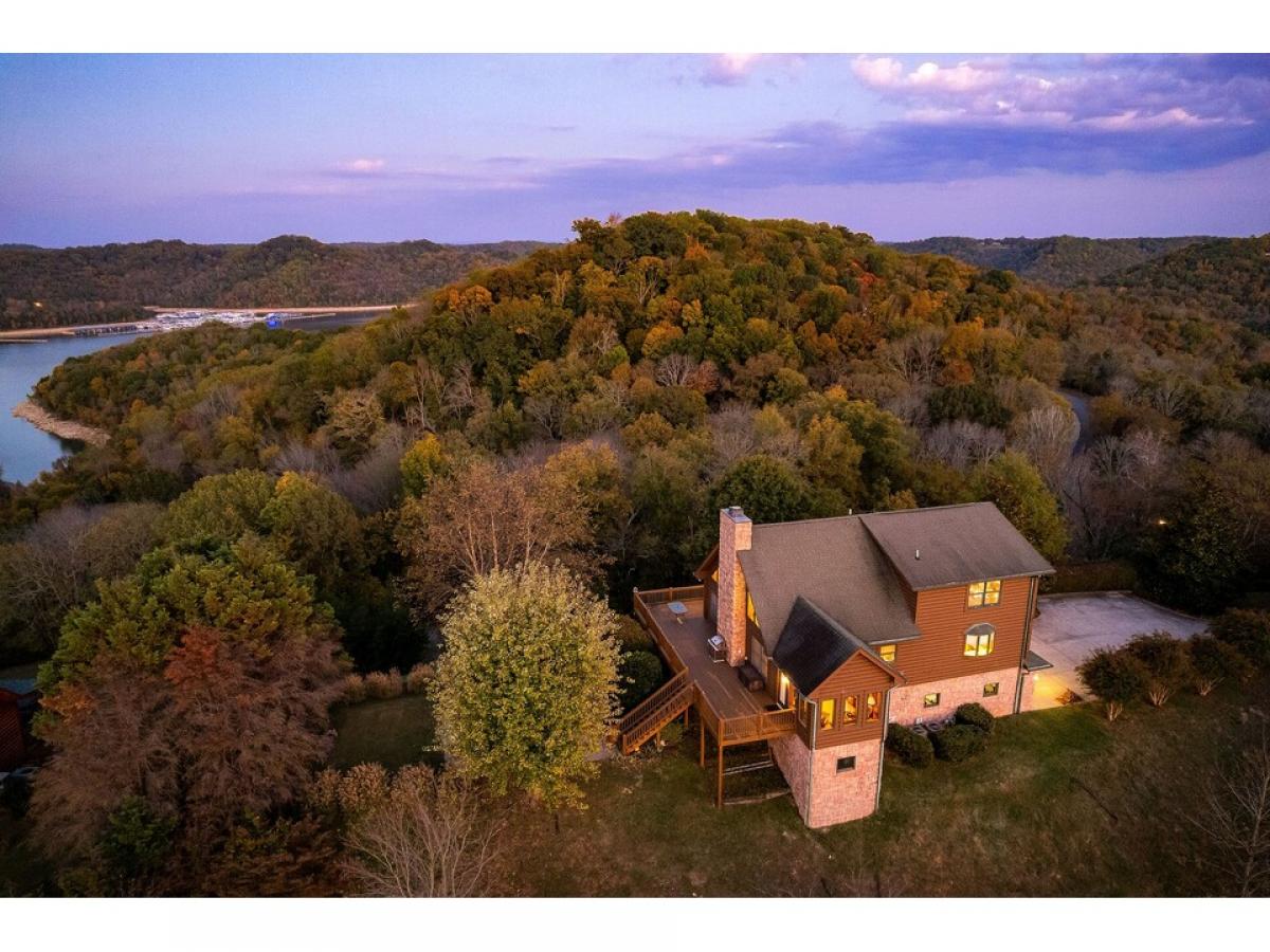 Welcome to the mountaintop cabin of your dreams! This custom log cabin features breathtaking, year-round views of Center Hill Lake from every room. Walk in to the open-concept Living area boasting 22 ft ceilings with tongue-in-groove wood, a stone fireplace, and windows all around. Modern kitchen has granite countertops and custom cabinets and eat-at bar that are open to the living room, dining room, and sun room. The main floor houses the primary suite with large walk in closet and a newer, handicap accessible shower. If you'd rather come in through the garage, you can ride the elevator upstairs (even if the power is out). The finished entry level is also accesible via garage and features a Rec room, bedroom, half bath, storage room, and mechanical room. Upstairs you'll find two large beds and a bath. The outdooor areas are pristine as well and accent the lake view from this amazing hilltop with brick pathways, covered seating, a fire pit, and shade trees. Newer HVAC and deck stain.