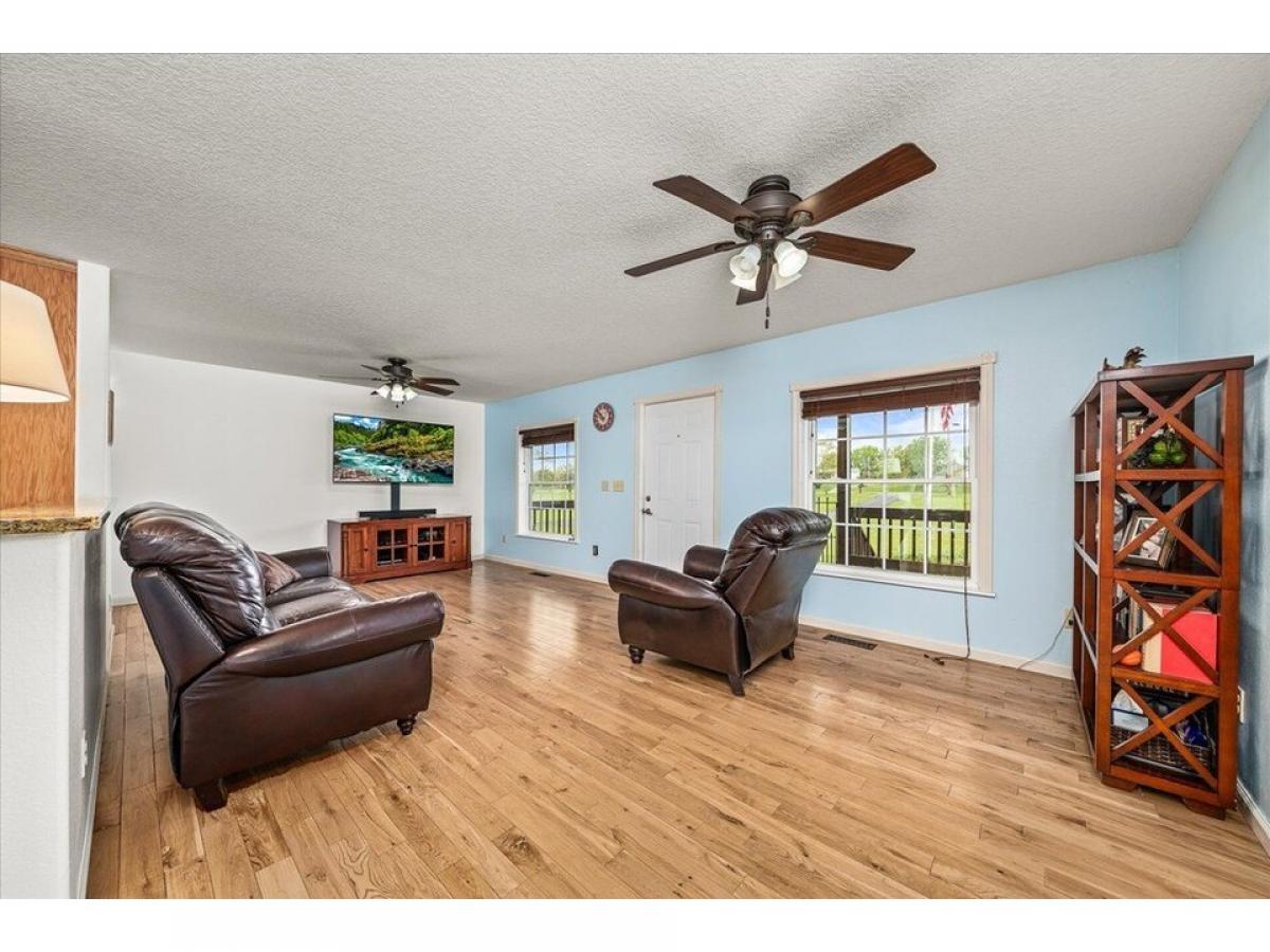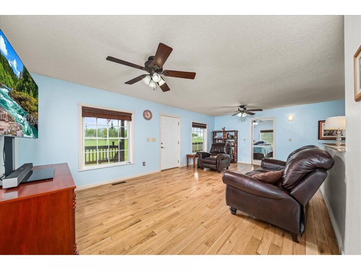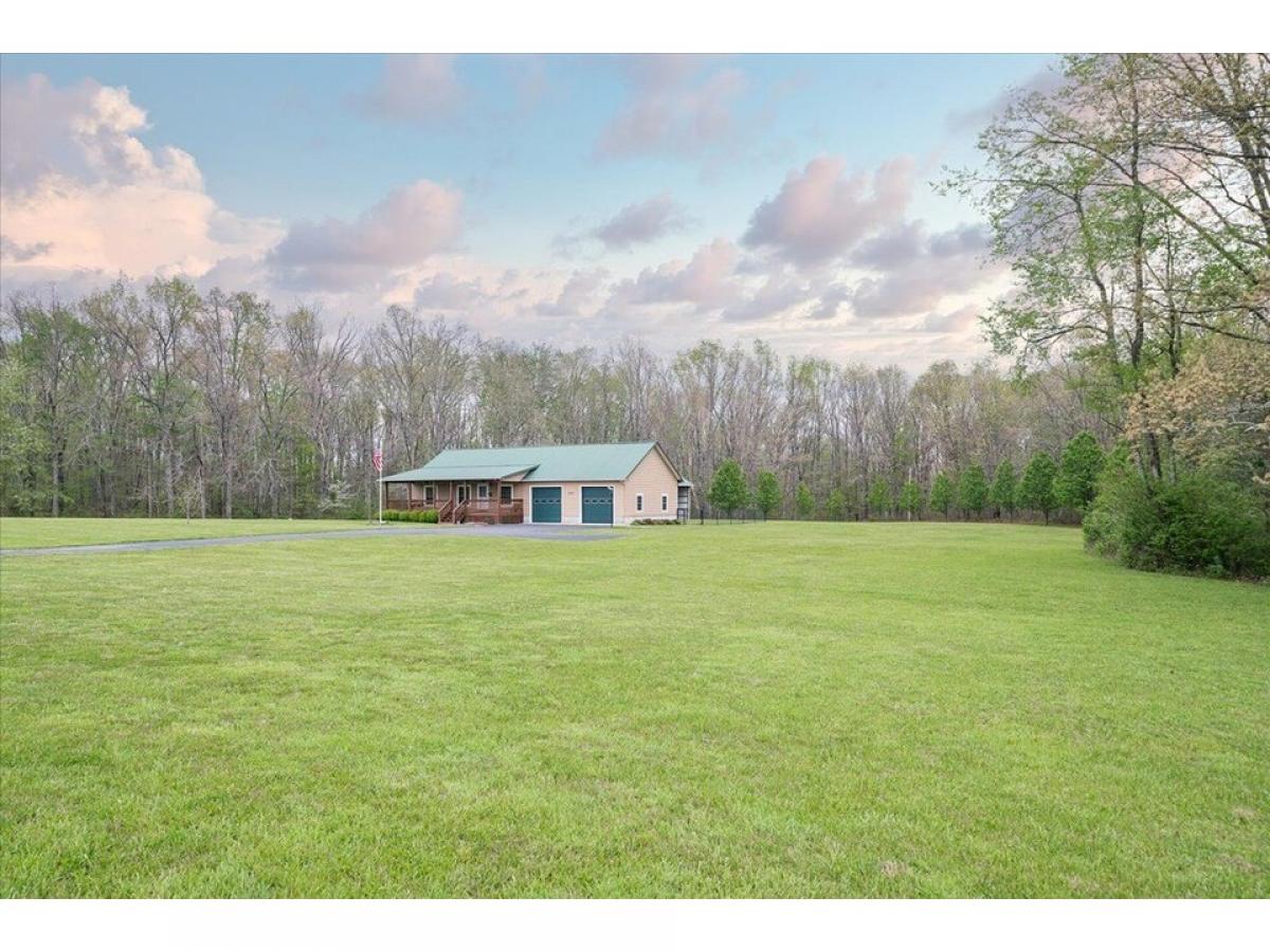 Tucked away on 5.7 private acres, this cozy 2-bedroom, 2-bath cabin is the perfect blend of comfort and functionality. The kitchen boasts maple cabinets, stainless steel appliances with a brand new microwave. all complimented by granite countertops and a convenient Lazy Susan. The warmth of hickory flooring flows throughout, with plush carpeting in both bedrooms for added comfort. The master features a walk-in closet, and both bathrooms are outfitted with hard surface counters. There are fans in each bedroom and two in the great room. Upstairs presents an exciting opportunity - it can easily be converted into a third bedroom and storage is abundant ensuring everything has its place. Freshly painted and move-in ready, this cabin has a fenced in area for your fur babies, a 3 bay pole barn with 220-volt wiring plus RV hookups, a propane tank that is owned amp; stays with the property, a flagpole out front and a lone paved driveway.
