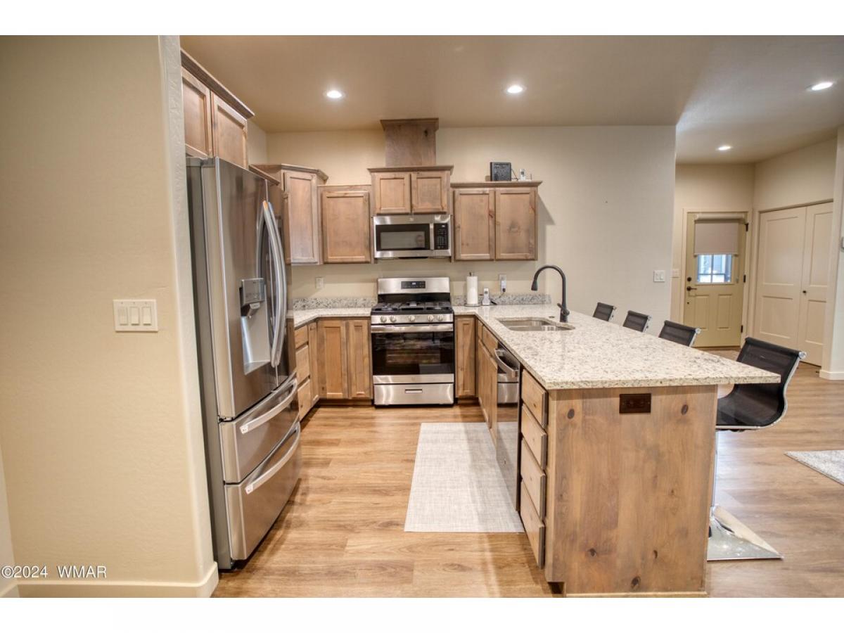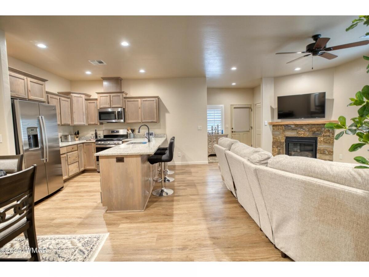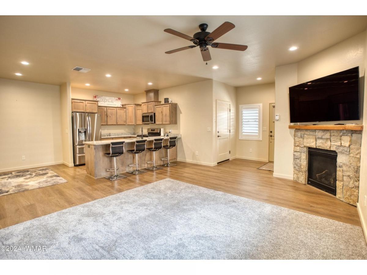 Discover this cozy move-in-ready single-story townhome in the peaceful Starlight Ridge community, nestled in the heart of the White Mountains. This inviting 1,173 square foot property, set on a .07-acre lot, features an open layout accentuated by high ceilings and recessed lighting. Notable amenities include granite countertops, a cozy stone gas fireplace in the spacious living room, and a well-equipped kitchen with knotty alder cabinets, stainless steel appliances, and a walk-in pantry. There are plenty of upgrades in this build! All wood flooring, tiled main bathroom, wood screen doors, an on-demand water heater, and custom wood blinds! The expansive private covered deck off of the master bedroom adds to the charm of this home. With two bedrooms, including a master suite with an en-suite bathroom, additional conveniences such as an attached garage, this home blends comfort with contemporary features. Positioned just a mile from local shops and dining, near golf clubs, hiking trails, and Sunrise Ski Resort, this property offers a perfect escape into the cool mountain air, ideal for those looking to enjoy the distinct beauty of all four seasons away from the city's heat.