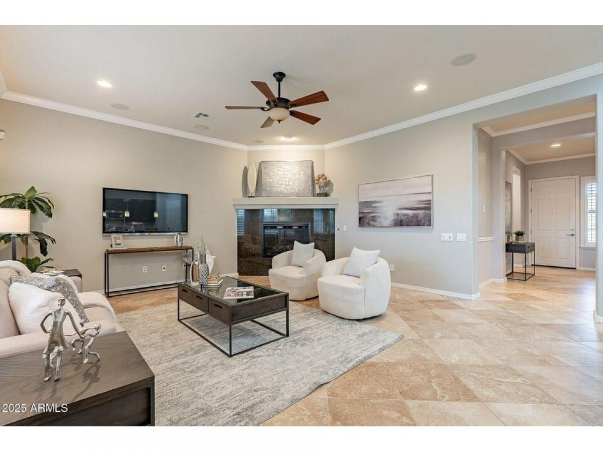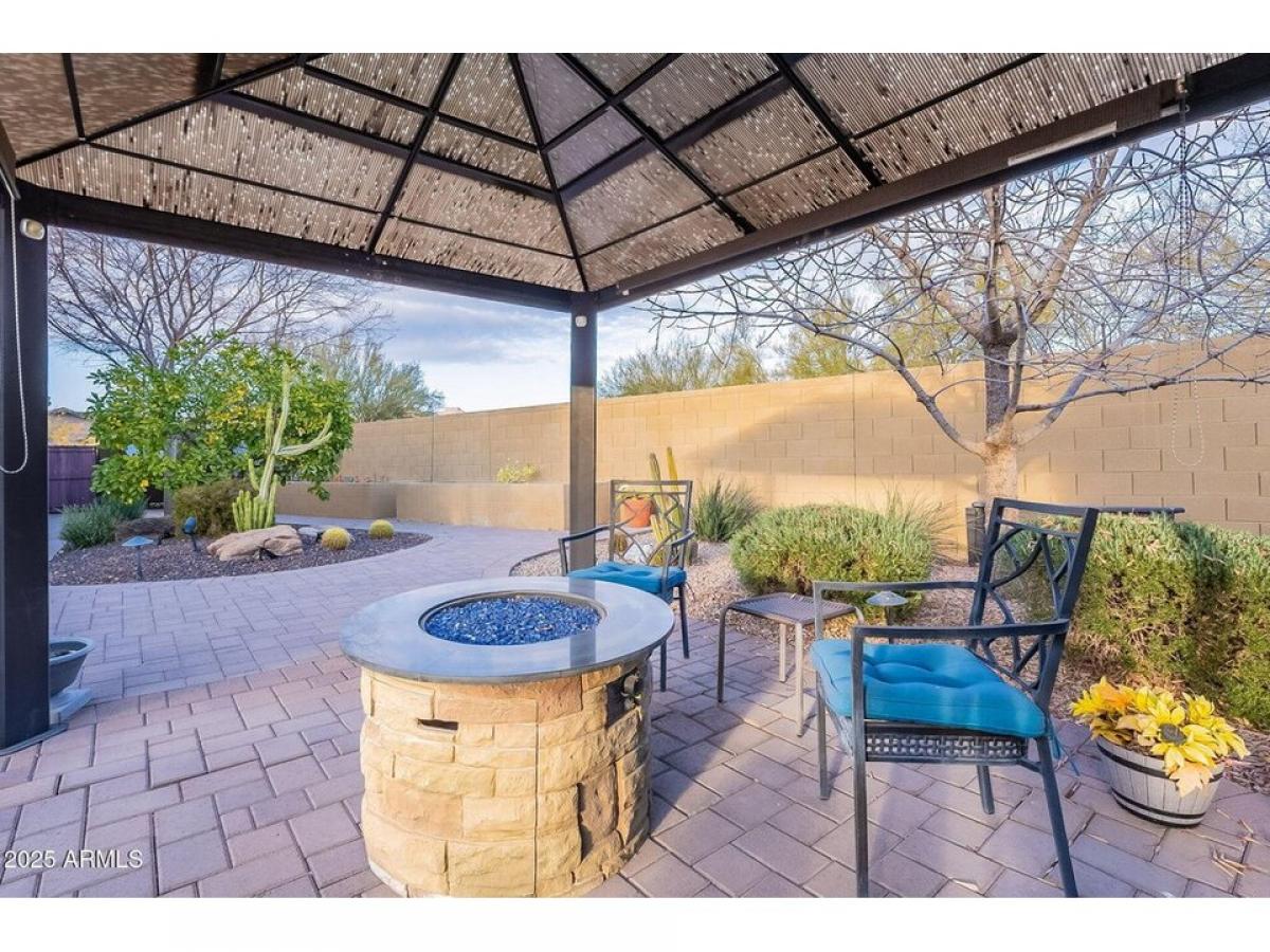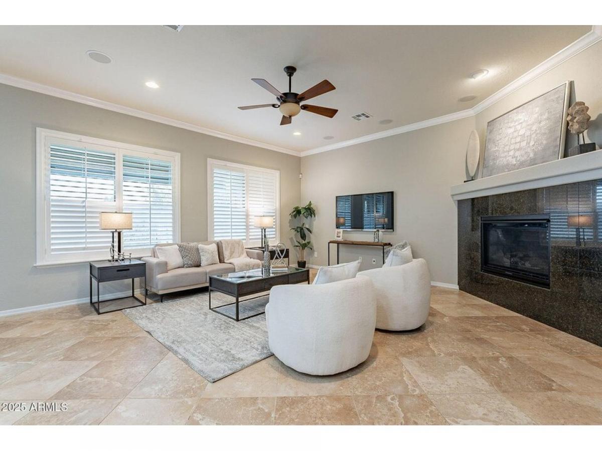 Welcome to this Stunning desert home w/immaculate curb appeal amp; elevated features like crown molding, plantation shutters amp; wood tile flooring throughout. Open amp; inviting floor plan creates a seamless flow between living spaces. Designer chef#039;s kitchen features custom Alder wood cabinetry, stainless smart appliances w/gas range, pantry amp; center island w/seating. Primary retreat is spacious amp; features a custom designed walk-in closet amp; spa like bathroom. The backyard oasis features meticulously maintained landscaping, large covered patio w/retractable shade,BBQ, gazebo w/gas firepit, raised planters amp; storage. Extended garage w/20amp, built in cabinets amp; overhead storage. Owned Solar. Home is N/S facing in a cul-de-sac amp; offers privacy amp; Mountain Views. Gated Community in great location.