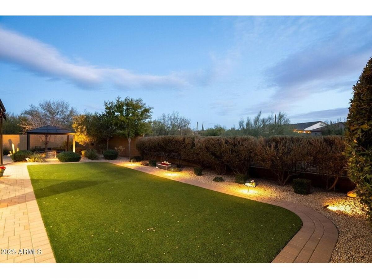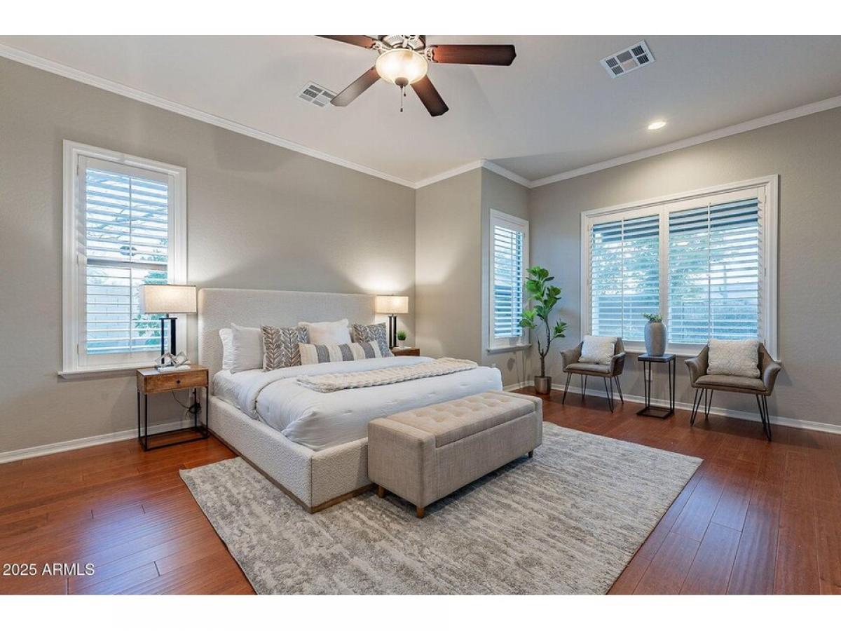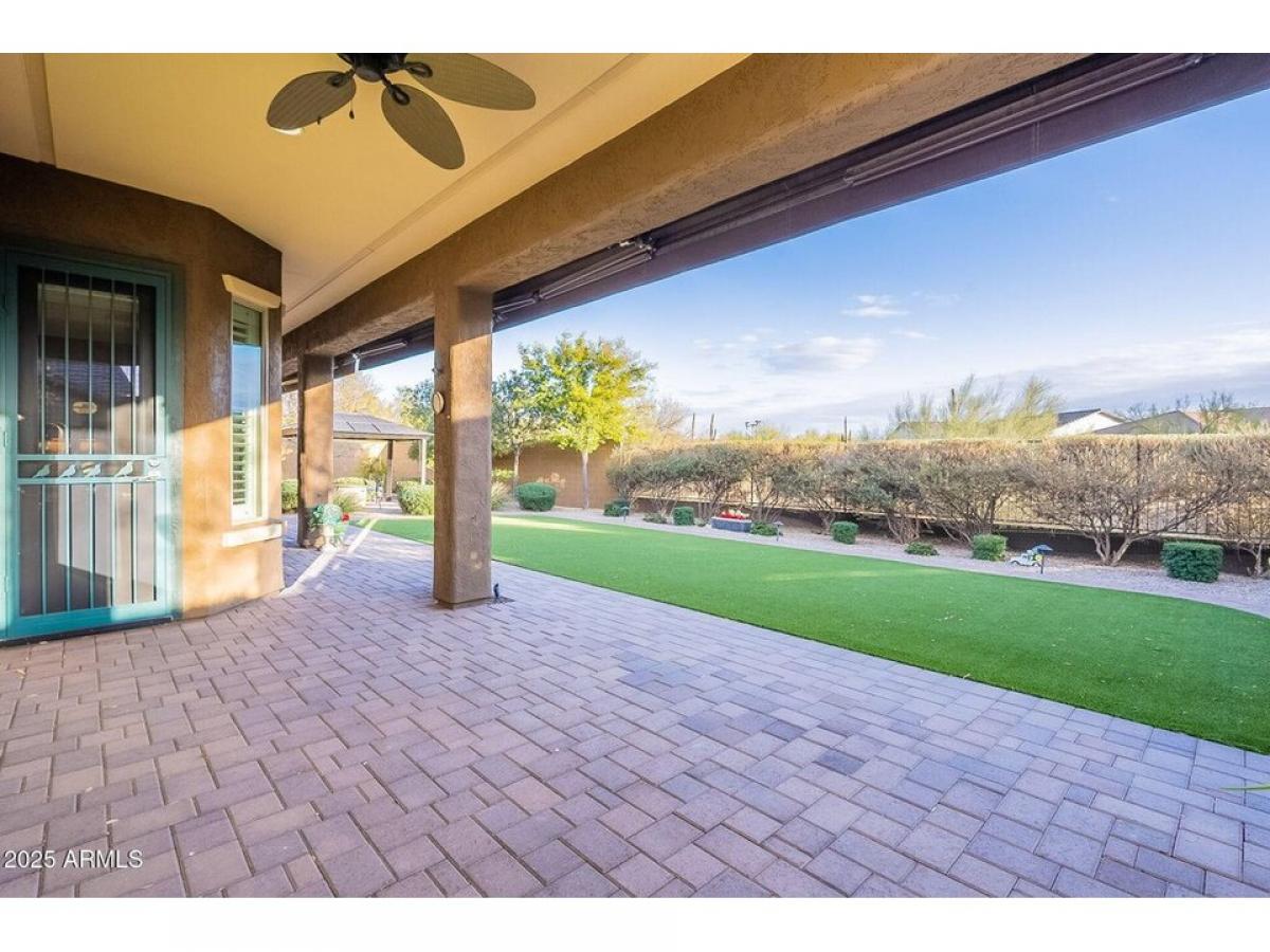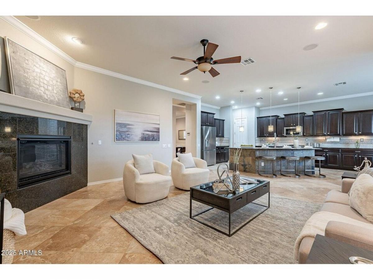 Welcome to this Stunning desert home w/immaculate curb appeal amp; elevated features like crown molding, plantation shutters amp; wood tile flooring throughout. Open amp; inviting floor plan creates a seamless flow between living spaces. Designer chef#039;s kitchen features custom Alder wood cabinetry, stainless smart appliances w/gas range, pantry amp; center island w/seating. Primary retreat is spacious amp; features a custom designed walk-in closet amp; spa like bathroom. The backyard oasis features meticulously maintained landscaping, large covered patio w/retractable shade,BBQ, gazebo w/gas firepit, raised planters amp; storage. Extended garage w/20amp, built in cabinets amp; overhead storage. Owned Solar. Home is N/S facing in a cul-de-sac amp; offers privacy amp; Mountain Views. Gated Community in great location.