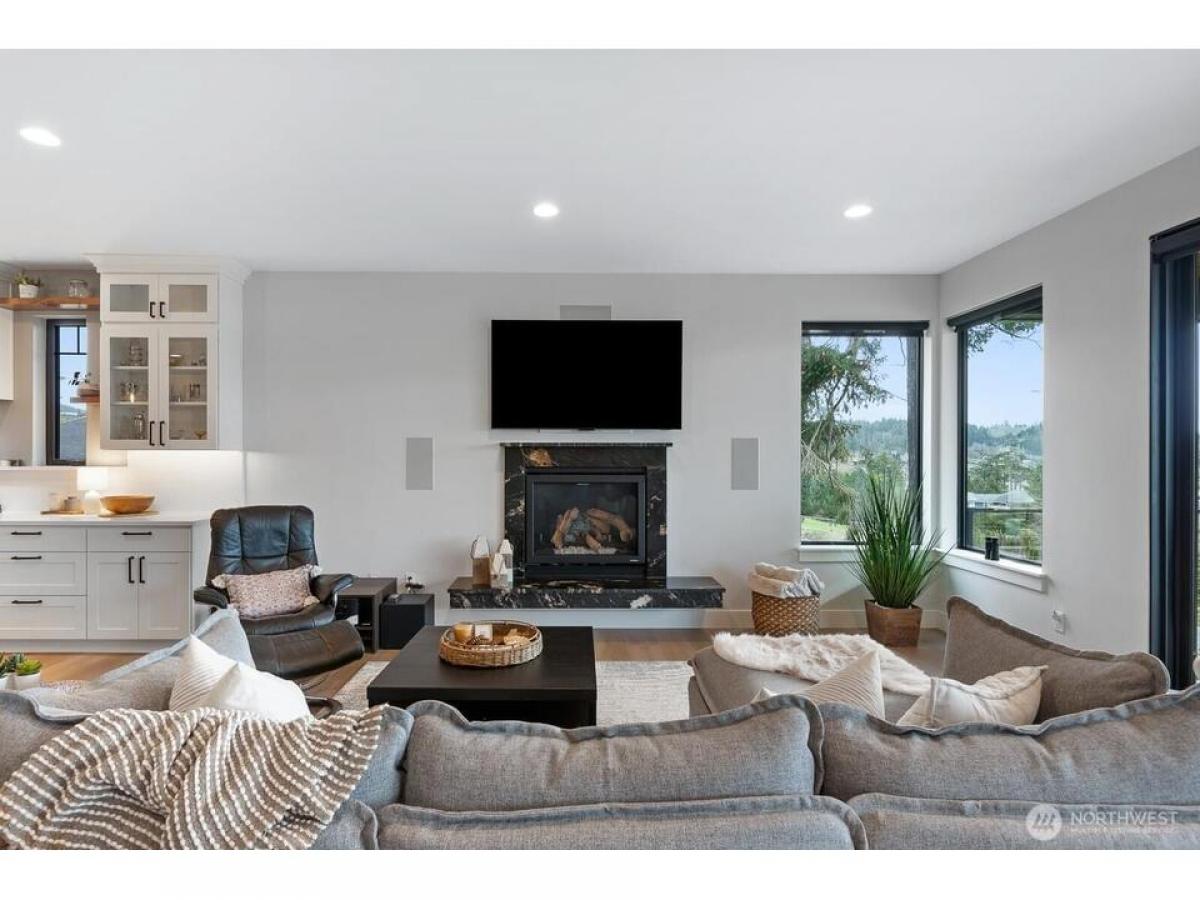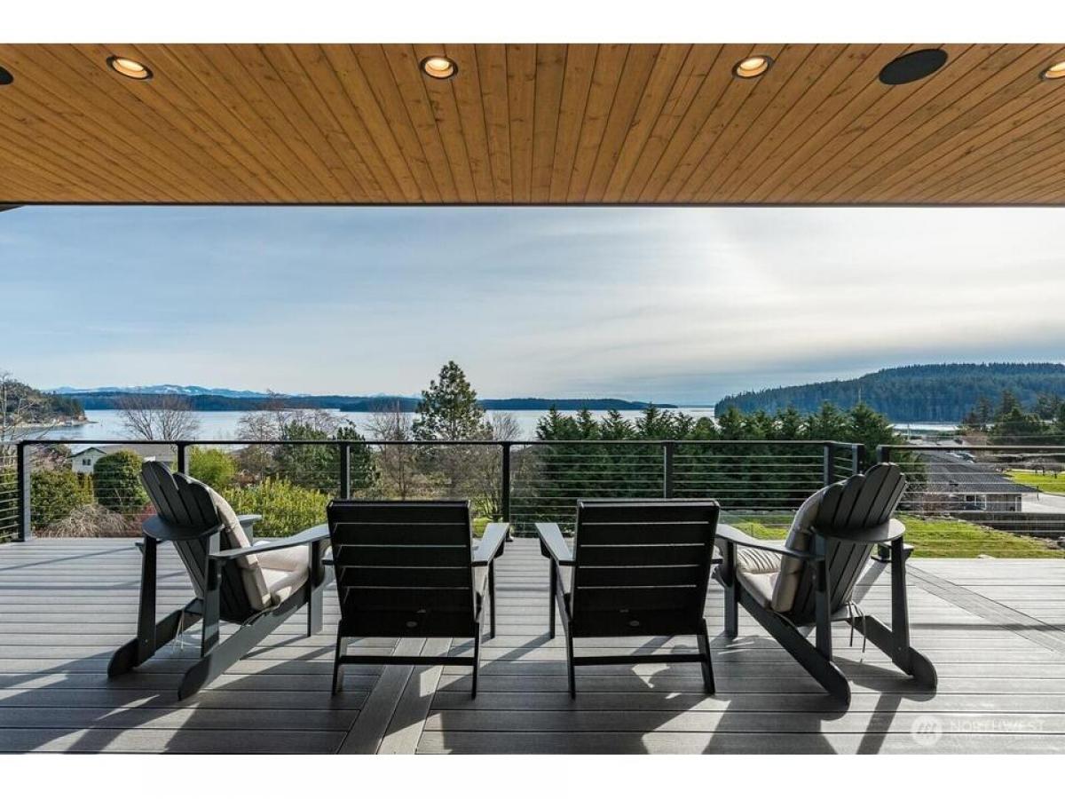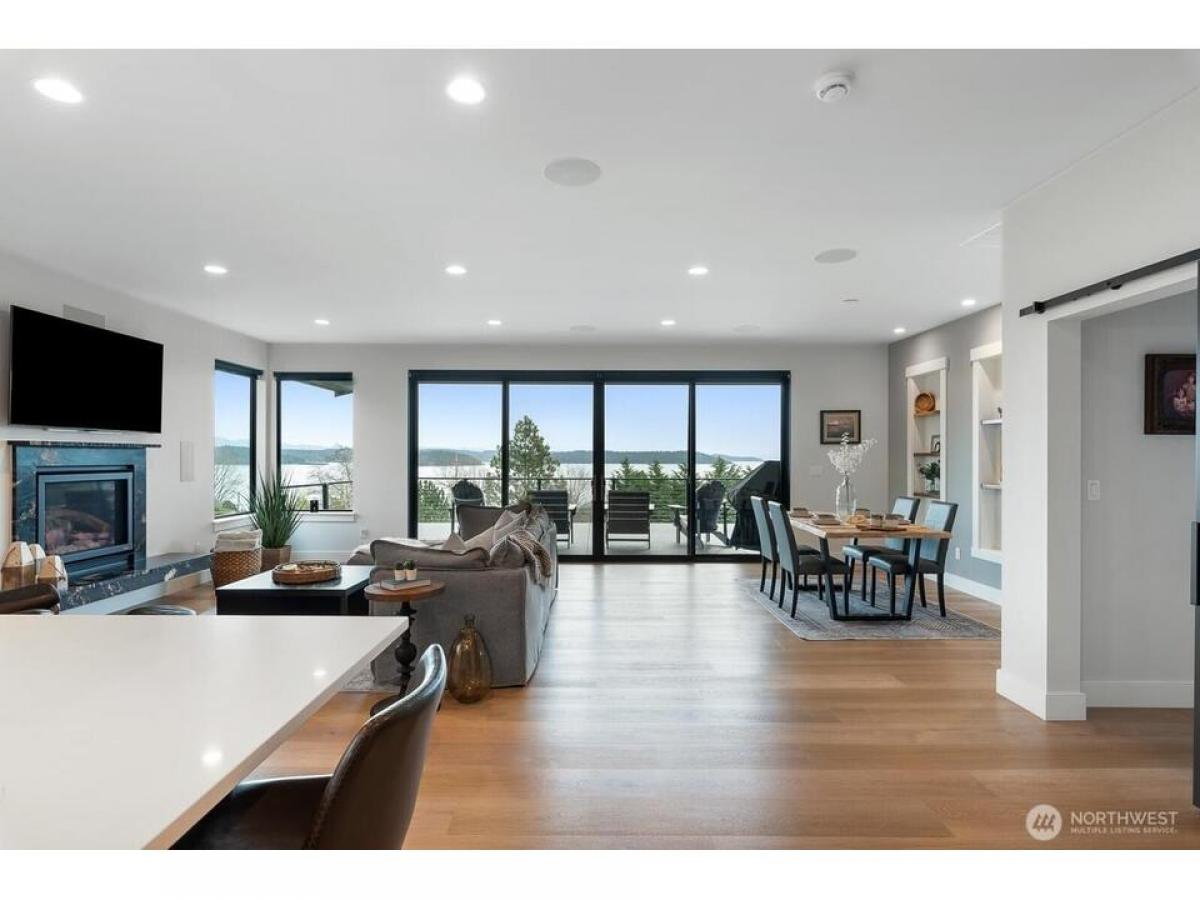 Nestled near Deception Pass this stunning custom home blends contemporary design with Pacific Northwest beauty. Welcomed with gas lantern-lit entry into the open-concept main level featuring immediate water mountain views from walls of windows out to expansive covered deck, dream kitchen with quartz counters beautiful cabinetry-flowing seamlessly into living dining with fireplace. Luxe primary suite with spa-like en-suite spacious walk-in closet. 2nd bedroom, full bath laundry/mudrm with dog bath complete the main floor. Upstairs, an office/rec space boasts expansive views. Lower level gives family room with fp kitchenette, 3rd bdrm, bonus rm flex rm, addtl laundry plus lower deck, patio fully fenced yard. Exceptional home!