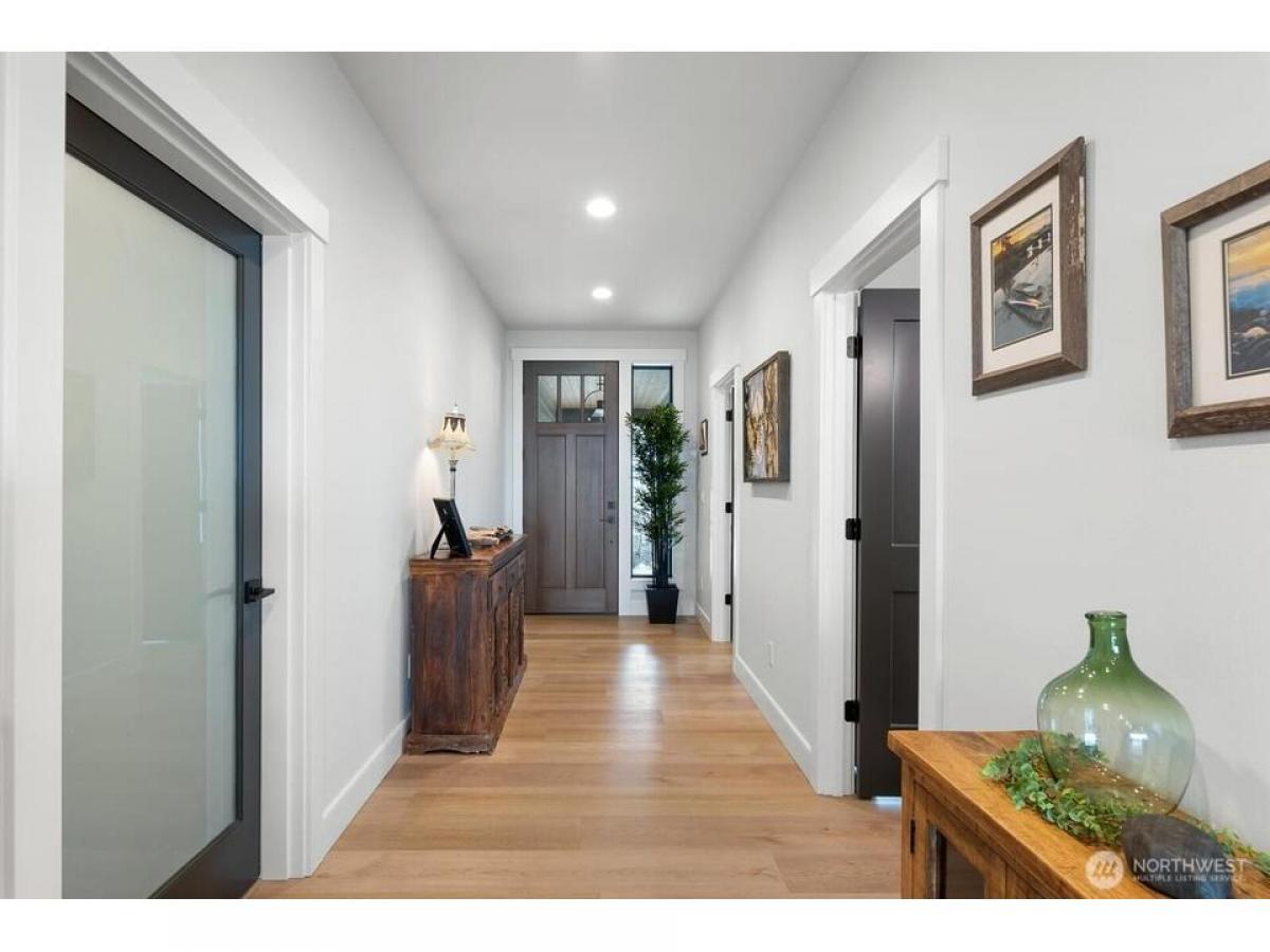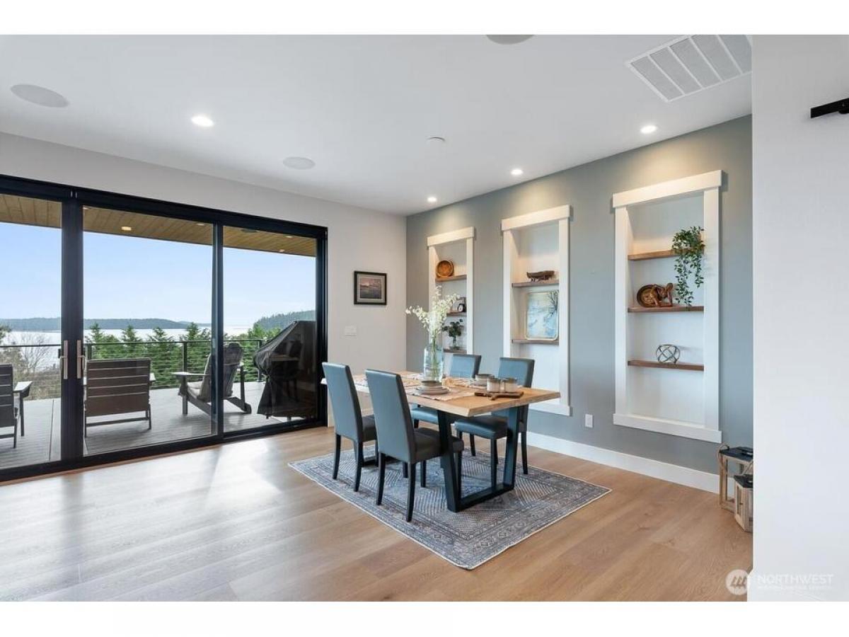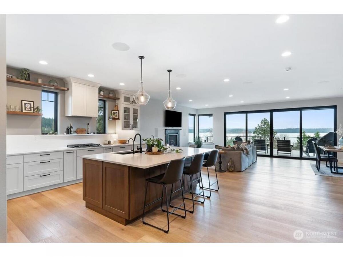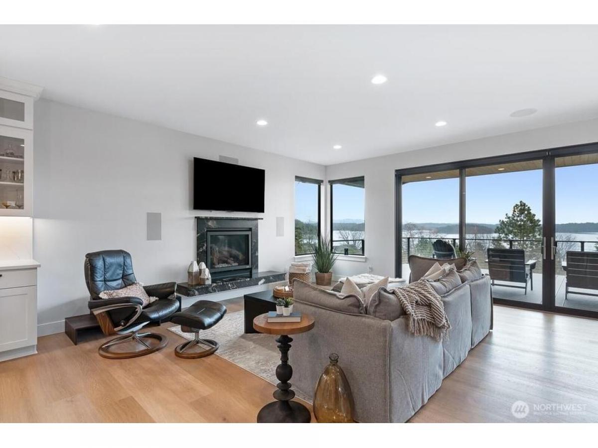 Nestled near Deception Pass this stunning custom home blends contemporary design with Pacific Northwest beauty. Welcomed with gas lantern-lit entry into the open-concept main level featuring immediate water mountain views from walls of windows out to expansive covered deck, dream kitchen with quartz counters beautiful cabinetry-flowing seamlessly into living dining with fireplace. Luxe primary suite with spa-like en-suite spacious walk-in closet. 2nd bedroom, full bath laundry/mudrm with dog bath complete the main floor. Upstairs, an office/rec space boasts expansive views. Lower level gives family room with fp kitchenette, 3rd bdrm, bonus rm flex rm, addtl laundry plus lower deck, patio fully fenced yard. Exceptional home!