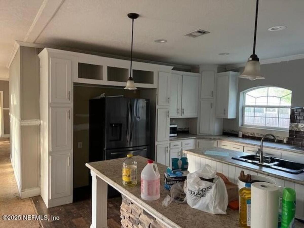 This AS-IS 2018 double-wide mobile home offers spacious living with 4 bedrooms and 2 bathrooms. The kitchen is a standout feature, equipped with a large island that provides ample counter space and a central area for cooking and gathering. The master bedroom is generously sized, and the attached bathroom includes a walk-in shower, adding convenience and luxury to the space. The home also includes a laundry room located inside, making laundry chores more accessible. A deck on the backside of the house provides a great space for outdoor relaxation or entertaining, while the backyard is fenced in for privacy and security. Overall, this mobile home combines modern amenities with a comfortable, functional design.