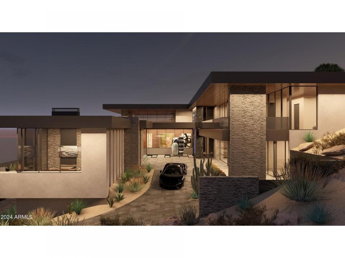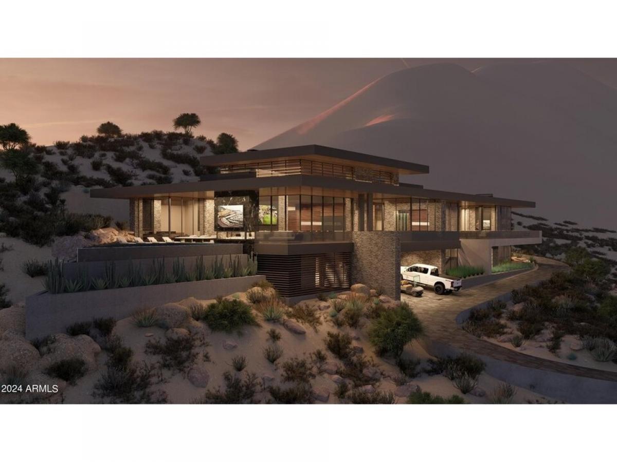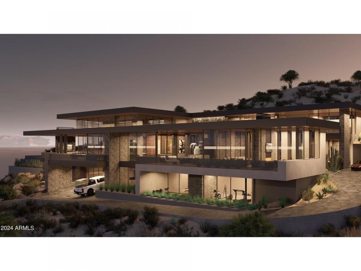 This majestic modern mountain home, nestled in the serene foothills of Mummy Mountain, offers expansive views and an unparalleled blend of luxury and craftsmanship. In collaboration with the esteemed luxury home builder Mike Graham of American First Builders and CP Drewett of Drewett Works Architecture, this architectural masterpiece is designed for the discerning homeowner who values sophistication and meticulous attention to detail. With an expansive living area of 11,850 square feet, this residence has been meticulously designed for both comfort and luxury. The breathtaking view corridors showcase the stunning McDowell Mountain range, Four Peaks, and the twinkling city lights, creating an exquisite backdrop for this exceptional property. The main level features a spacious Great Room and open kitchen that seamlessly integrates with a private dining space, all offering stunning mountain vistas. The luxurious Primary Suite provides a serene retreat, while the outdoor entertaining spaces are perfect for gatherings and enjoying the beautiful surroundings. A private guest casita offers a secluded and comfortable space for visitors. Additionally, an optional fifth bedroom is available, allowing for flexible use as a guest room, office, or studio to suit your needs. The two-car garage is conveniently located for easy access, and the outdoor spaces feature ample room for entertainment as well as a private sanctuary to relax and enjoy the pool and spa. On the upper level, two guest en-suites each feature their own private patio, extending the living experience outdoors. The lower level boasts a generous workout space with supreme views, an infrared sauna and steam shower for relaxation, a bar and theater room ideal for entertainment and leisure. Additionally, a five-car garage provides ample parking and storage space, bringing the total to seven garage spaces. We invite you to experience the privacy and refined allure that this spectacular residence embodies.