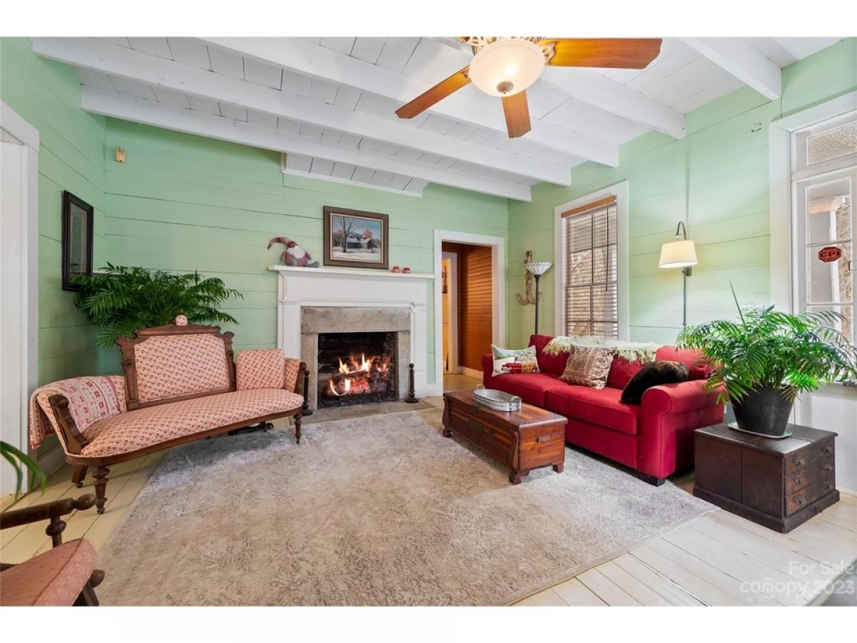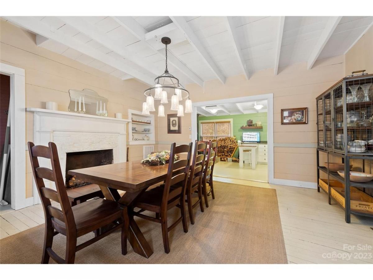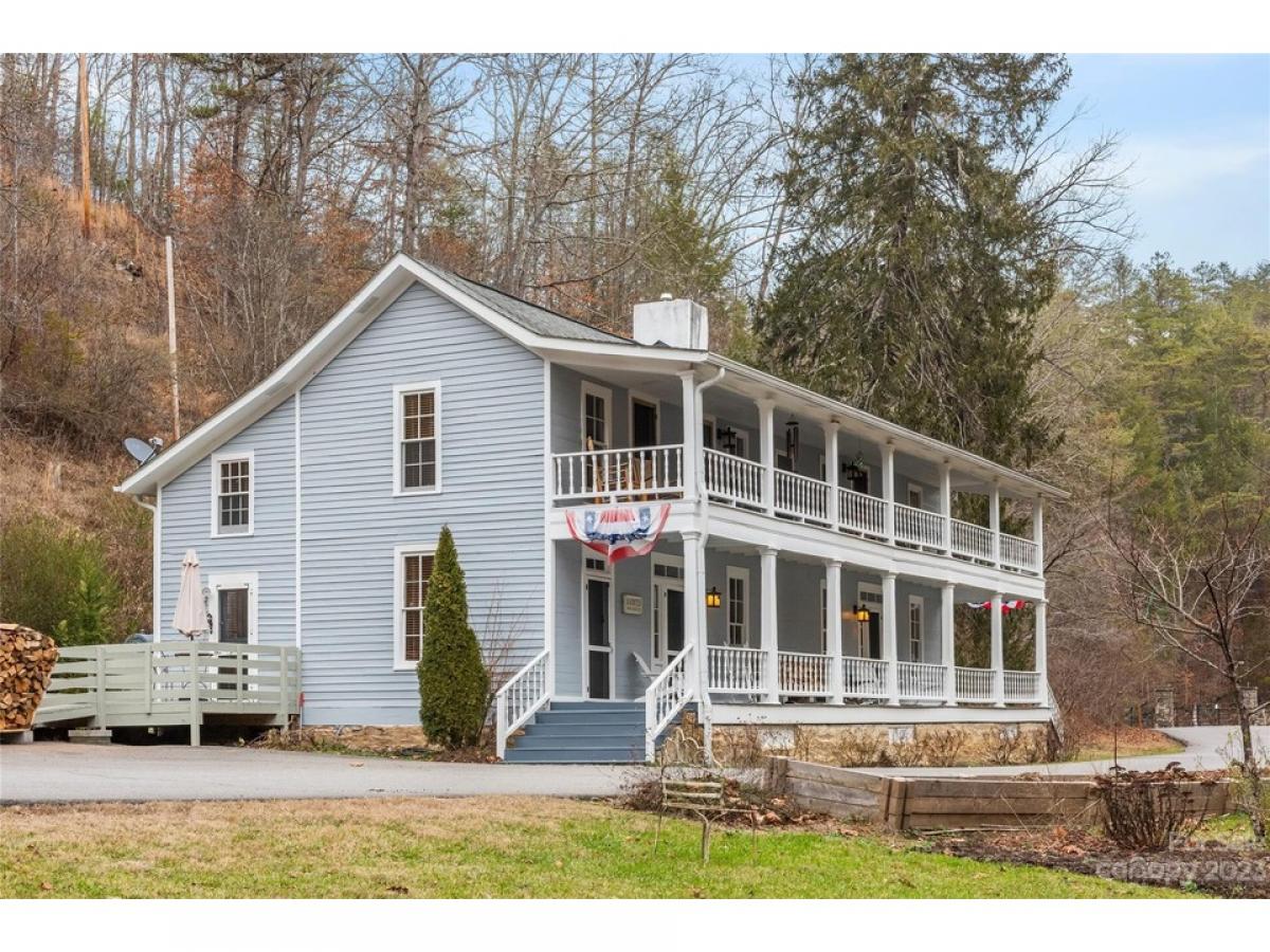 Hear and see the beautiful creek from one of the two expansive porches. Rumor has it that this historic home once served as a stop for stagecoaches. There is no doubt visitors were once wowed by the elegant clapboard & stone clad structure. The beautiful home still stands proudly, but is updated for modern living. Warm by one of four fireplaces, or hang out in the kitchen by the wood stove. The living room is massive and the dining room feels grand! Upstairs could accommodate more beds than the listing suggests, and there is a main level ensuite as well. Outside, the land is mostly level with direct creek access. The neighborhood amenities of an outdoor fireplace and gorgeous barn are conveniently located just steps away from the front door. Oh the gatherings that could happen here! The home's location is decidedly country, but minutes from groceries, and Downtown Asheville is a mere 20 minutes away! The gated neighborhood provides privacy. Ask to explore the special property today!