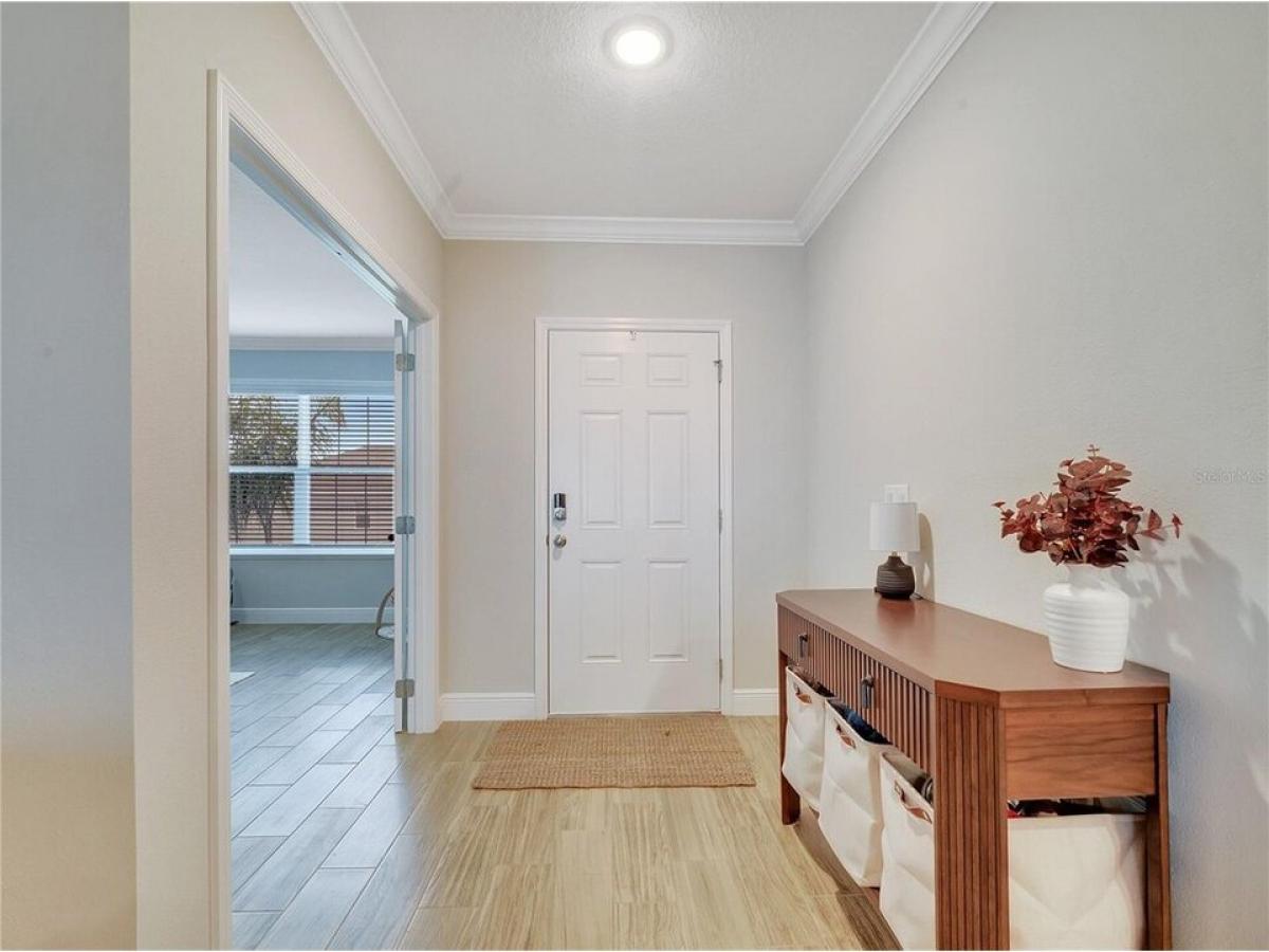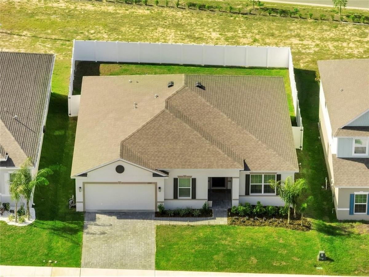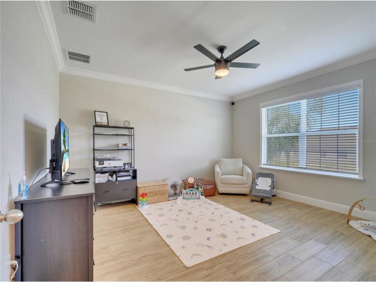 Upgrades Galore ndash; Move-In Ready! Why wait to build when this almost-new home has it all? This beautiful 3-bedroom, 2-bathroom home features a flex room thatrsquo;s perfect for an office or playroom, complete with French doors for added charm and privacy. Step inside to an inviting open floor plan thatrsquo;s perfect for entertaining, with volume ceilings and crown molding that add elegance to every room. The chefrsquo;s dream kitchen is anchored by a large island with bar seating and stainless-steel appliances, while the upgraded wood-look ceramic tile throughout the main living areas adds a sleek, modern touch. With deluxe interior trim and oversized windows, every detail of this home has been carefully designed for style and functionality. Relax or entertain on your spacious screened-in patio or enjoy the privacy of your fully vinyl-fenced yard ndash; plenty of space to design your dream pool if desired! The oversized garage provides ample storage space, and yoursquo;ll appreciate the fiber internet and cable package included in the HOA fee, along with access to 2 playgrounds, a walking trail, and no CDD fees. This home offers all the upgrades you want without waiting. Itrsquo;s truly move-in ready, with plenty of space, style, and modern amenities. Donrsquo;t miss out on this opportunity!