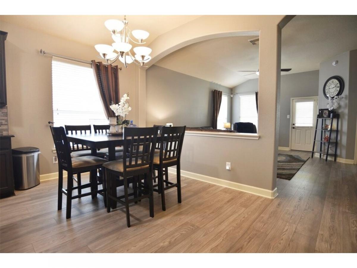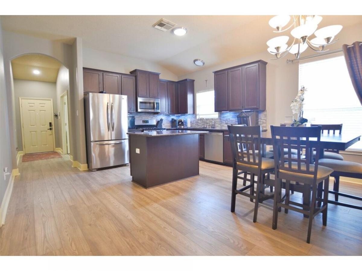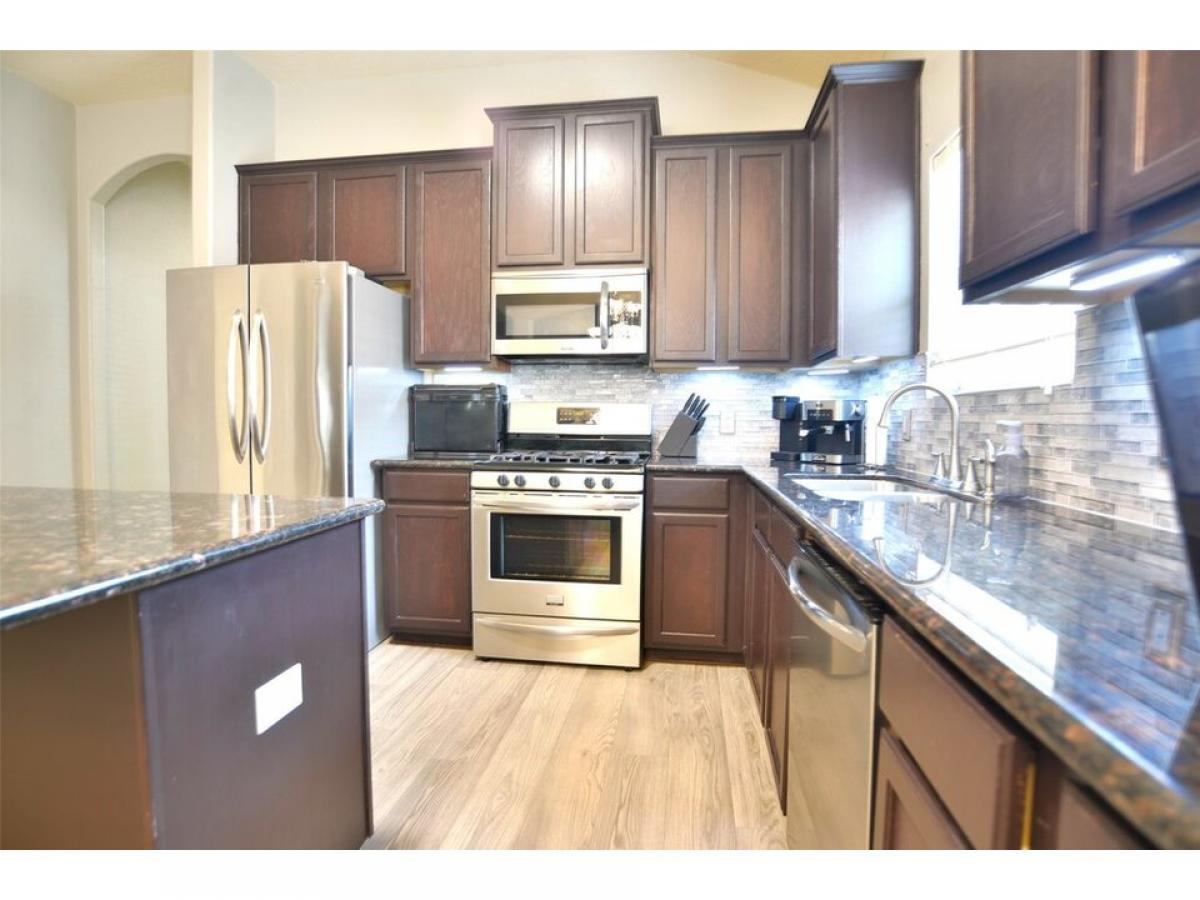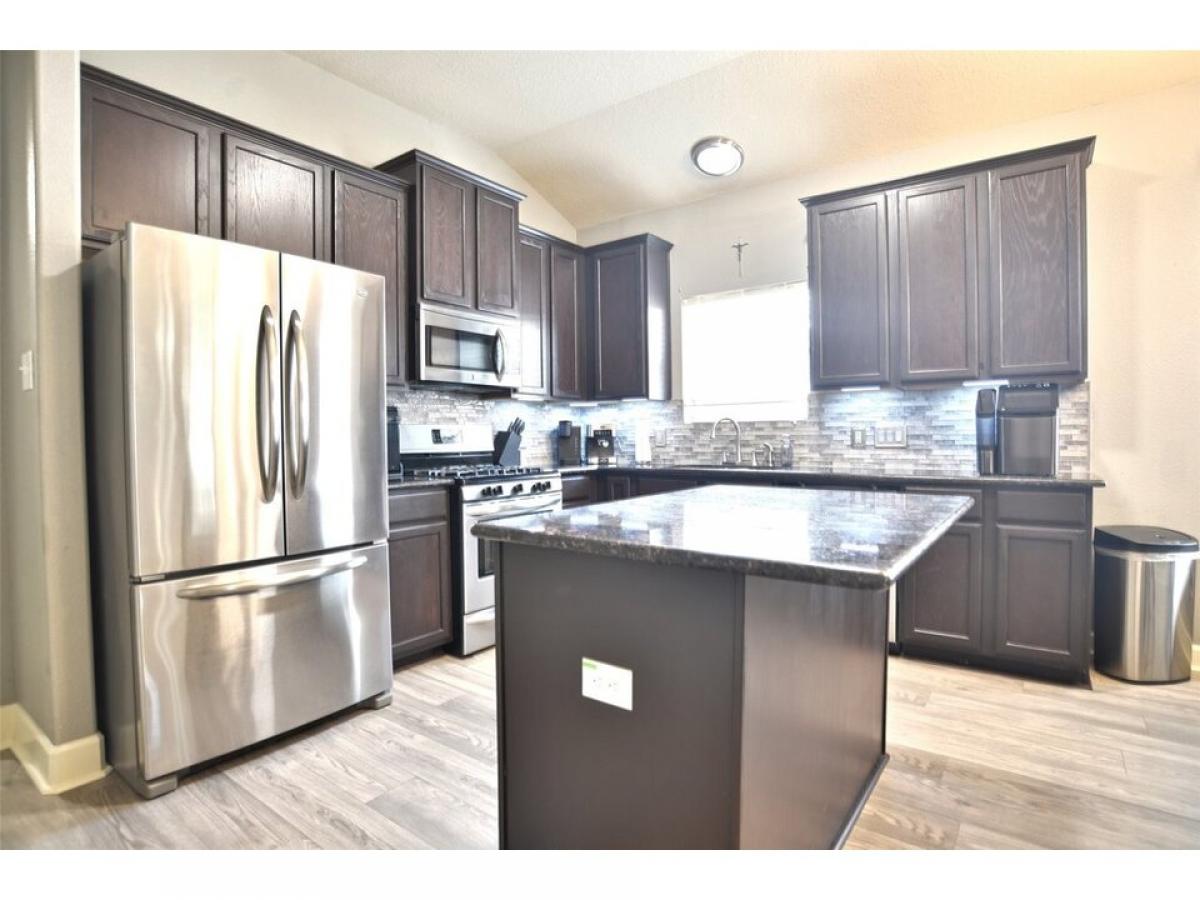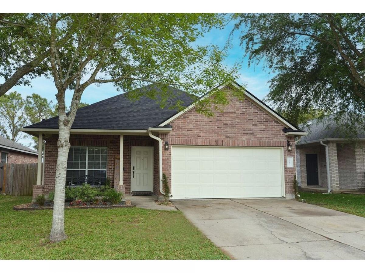 D R Horton popular one story with oversized covered front porch! Split floor plan, beautiful updated kitchen opens to living and dining, huge island, cabinets with new modern paint, stainless steel appliances, laminate flooring living, dining and kitchen, soaring ceiling, huge primary bedroom with walk in closet, huge backyard with covered patio and separate deck. Backyard also features a large storage building. Roof is just 1 yr old and HVAC just 2 years old!