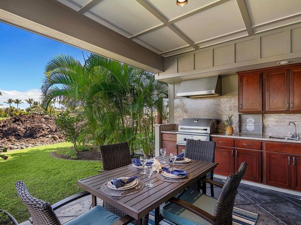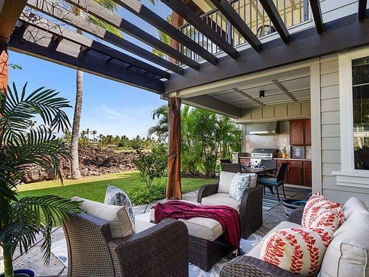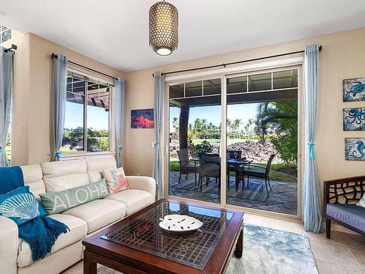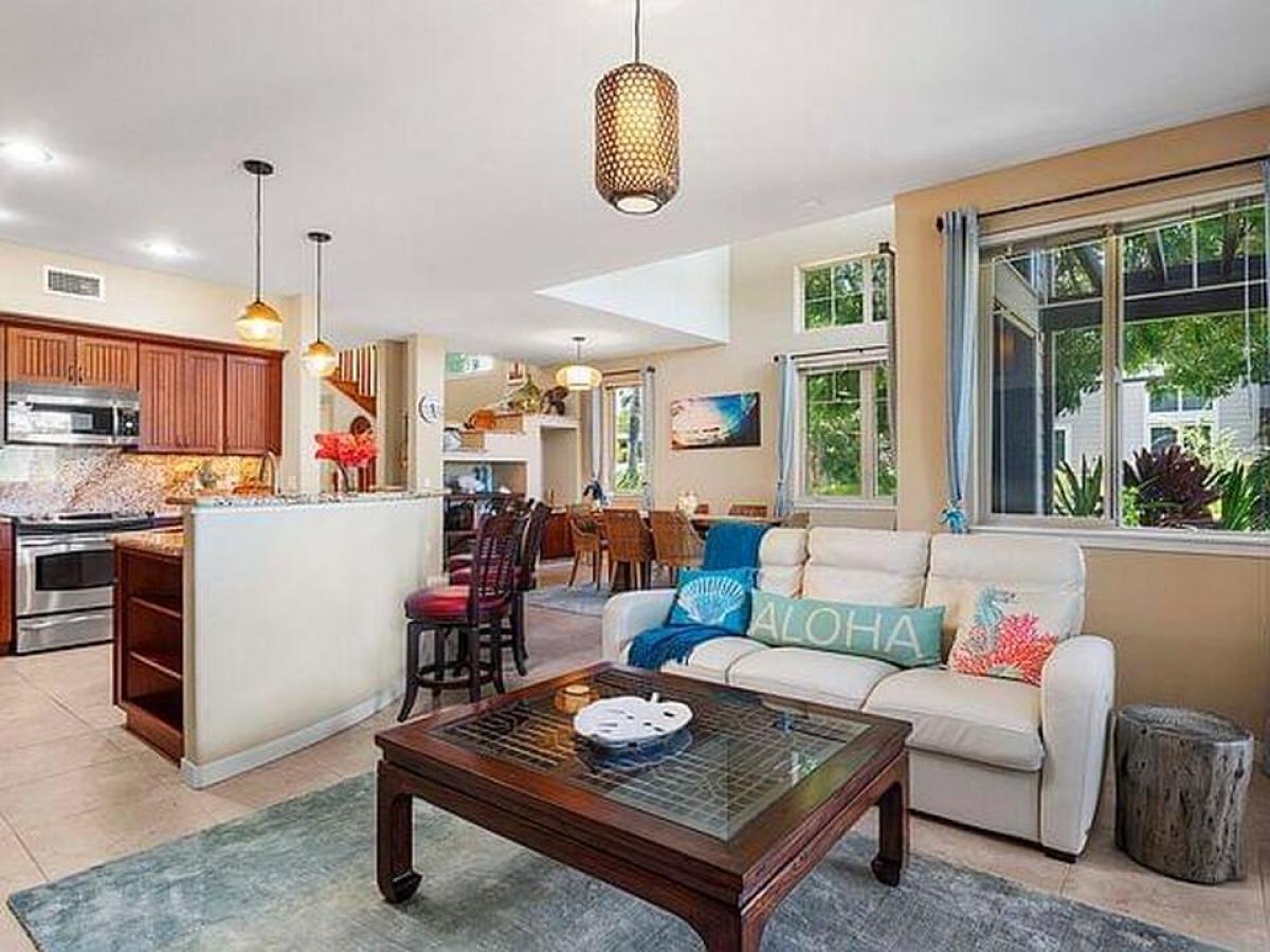 This large 2 story Golf Villa with spacious lanais has panoramic views of the 10th tee and fairway of Mauna Lani Golf South course. Golf Villas F-1 is a highly desired END UNIT, and one of the best sunset facing locations at Golf Villas. It provides plenty of area for entertaining. This Villa also has a one car detached garage with additional parking space in front of the garage. The unit is directly across from the pool and exercise facilities. Features include: - 3 bedrooms, 3 baths with additional den/media area upstairs - New Central AC - New wine cooler - Outside BBQ kitchen - Extra large lanai - New kitchen and bathroom cabinetry - Tile throughout the living / dining area for easy upkeep. The Master Suite has its own lanai with spectacular views of the fairway, mountains and sunsets. This is an end unit with soaring windows and lots of light. The extra-wide lower lanai has a built-in barbecue with granite countertops where you can enjoy your evening cocktail at sunset while waiting for the steaks and fish on the grill. The upstairs lanai is perfect for enjoying your morning coffee while savoring the sweeping views all the way to the ocean. The loft area separating the two upstairs bedroom suites has a den / office area where you can work or email notes to make your friends back home envious, or just kick back and enjoy life. The downstairs bedroom and bath are perfect for people who are challenged with stair climbing. The unit is offered fully furnished and currently has an STVR permit (4-day minimum rental). The Mauna Lani Resort lifestyle is the best! Resort homeowners enjoy the Mauna Lani Advantage Program which includes access to the exclusive and private, gated Beach Club at Mauna Lani. Homeowners also receive preferred rates at both championship golf courses, the North and South, as well as discounts for dining, shopping, spa treatments and discounted membership rates at the Mauna Lani Sports and Fitness Club.