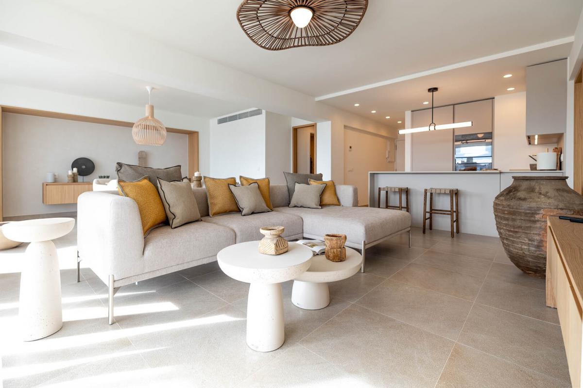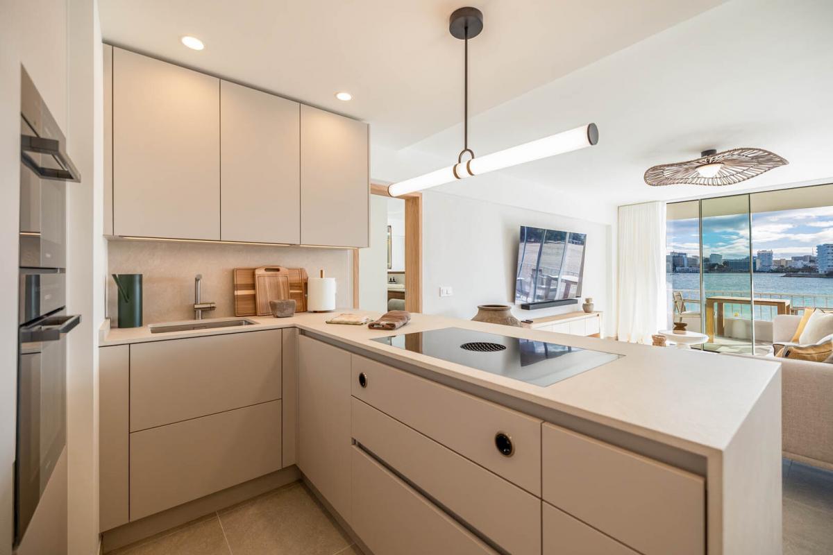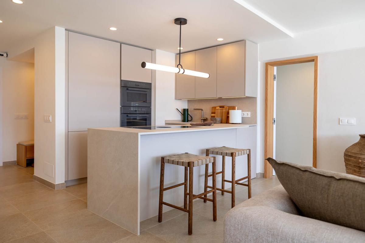 Der offen gestaltete Wohn- und Essbereich uberzeugt durch eine exklusive, massgefertigte Designerkuche mit hochwertigem Bora-Kochfeld und Miele-Elektrogeraten - ein echtes Highlight fur Kochliebhaber. Die offene Raumaufteilung schafft einen fliessenden Übergang zwischen Kuche, Ess- und Wohnbereich und eroffnet einen fantastischen Ausblick auf das Mittelmeer - ideal fur gesellige Abende oder ruhige Genussmomente.