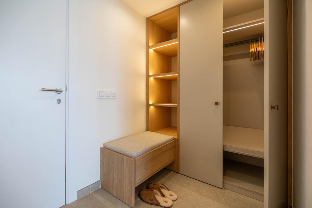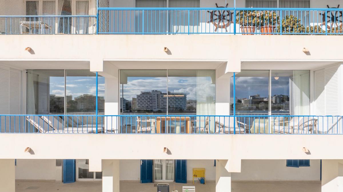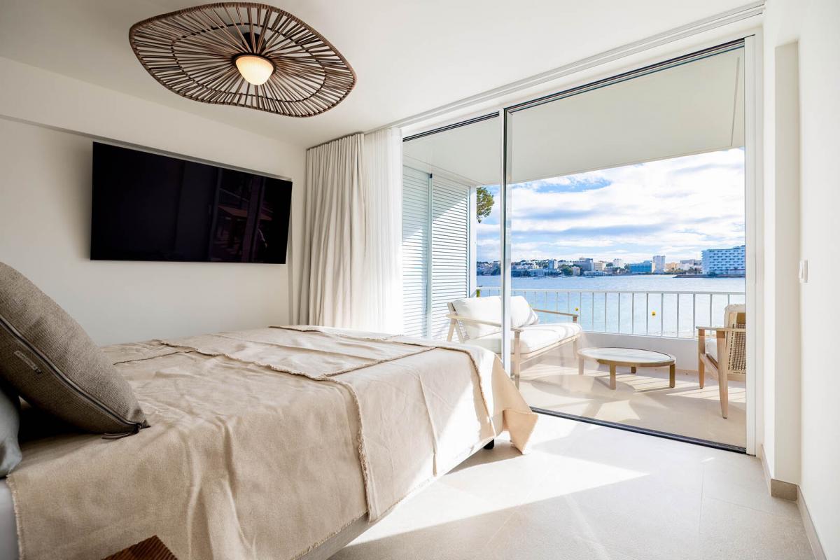 Das Master-Schlafzimmer bietet zusatzlich einen begehbaren Kleiderschrank mit viel Stauraum. Ein besonderes Highlight ist der grosszugige Balkon mit stilvollen Lounge-Mobeln und unvergleichlichem Panoramablick auf den Strand von Palmanova - perfekt, um die mediterrane Meeresbrise zu geniessen.