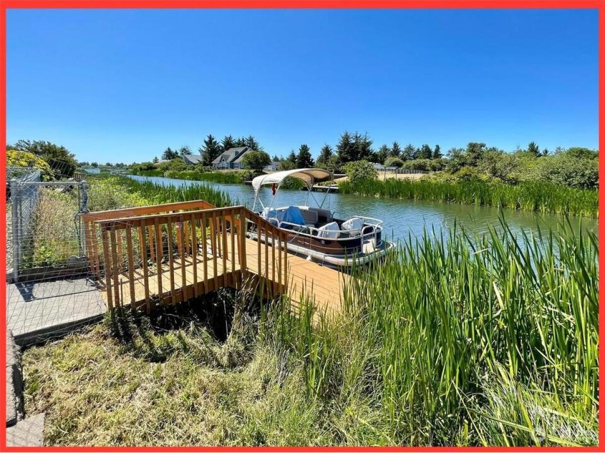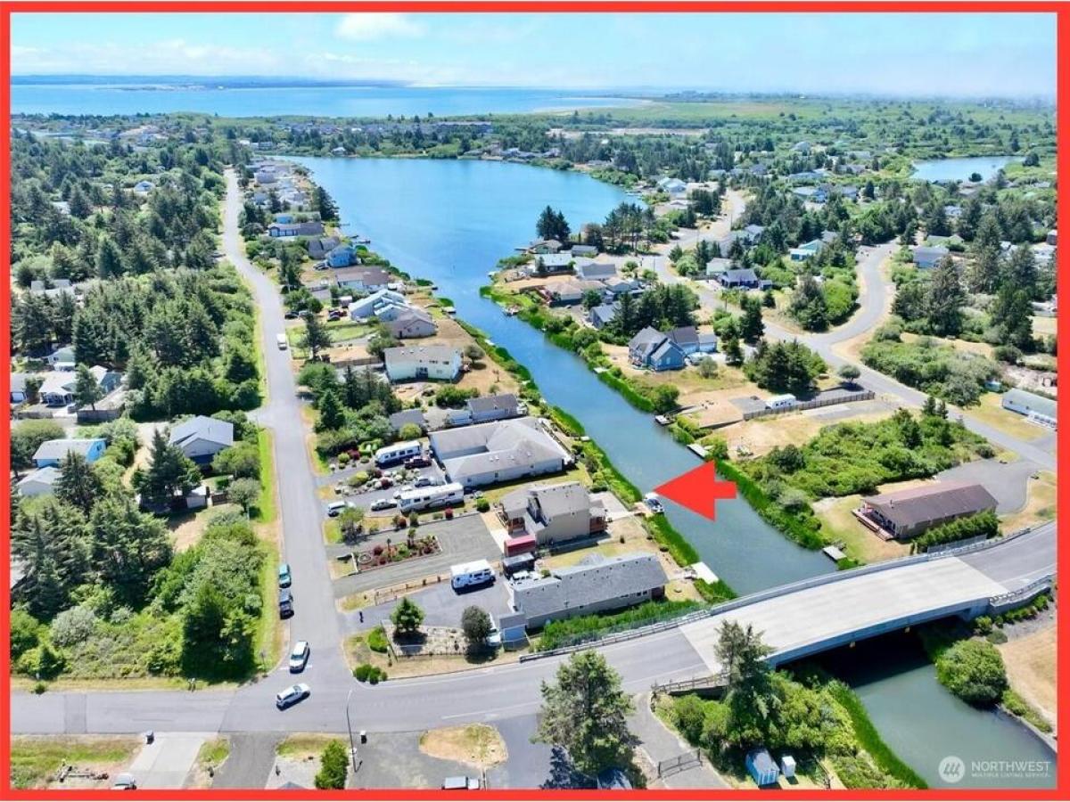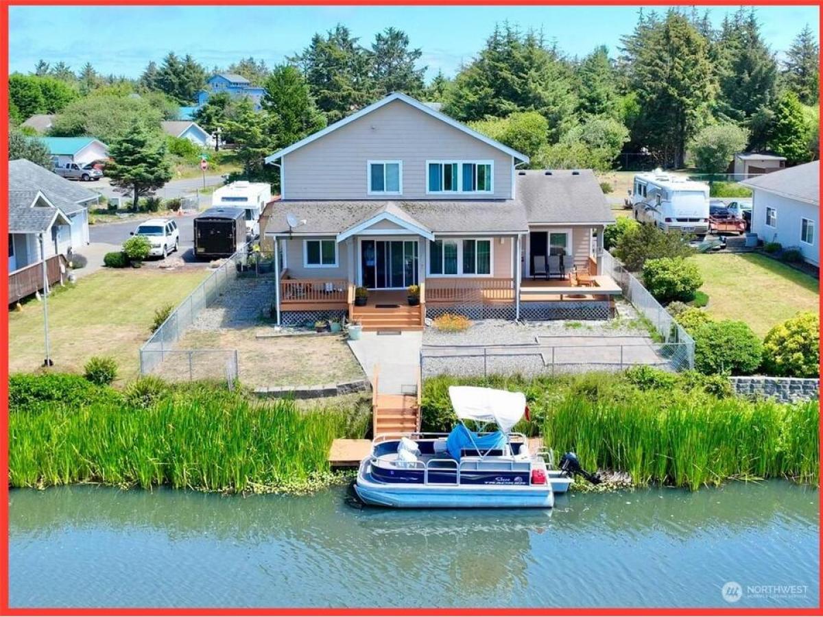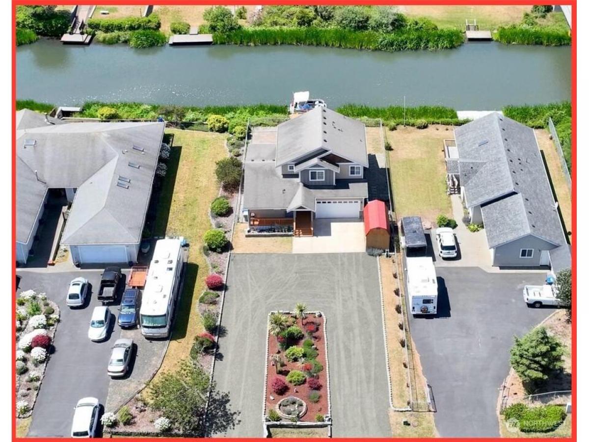 Contemporary Waterfront Home with 2 Primary Suites at Ocean Shores, WA! This 1,773 sf residence is situated near Lake Minard on a 10,200 sf parcel boasting 60' of frontage, dock, circular driveway and fenced back yard. Featuring an open floor plan with wall of windows, fireplace, and door leading to the full-length covered deck facing the canal. The kitchen with a view is outfitted with Quartz countertops and walk in pantry. One primary suite w/views of the canal and connected full bathroom are also on the main. Upstairs there is another primary en-suite w/spacious 4-piece bathroom. 2 more bedrooms and a full bath complete the upper floor. Oversized 2 car garage. 8x16 insulated shed w/power. Assumable loan balance of approx $215k 2.99% int.