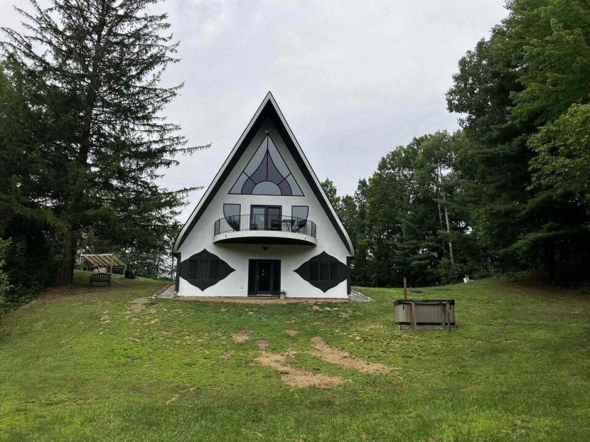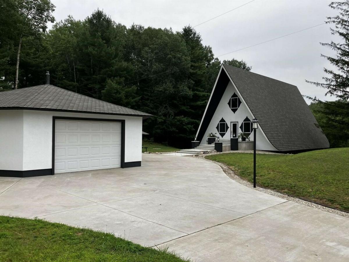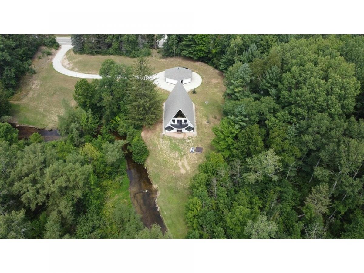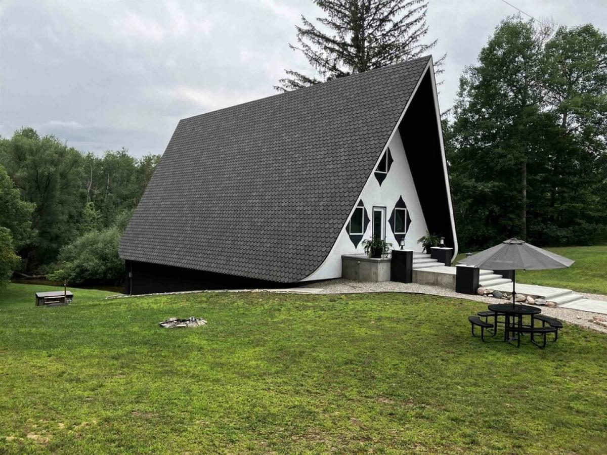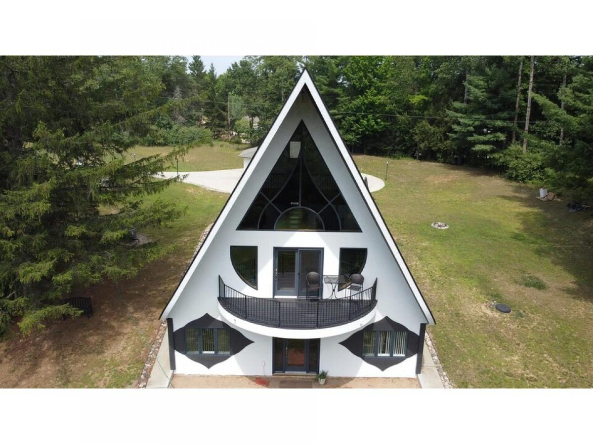 Custom built steel A-frame tucked away just off Ludington Dr. between Clare and Farwell . This home is truly a one of a kind , curved cabinety, custom glass windows, stucco exterior and an hexagon garage are just a few of the unique features. Home sits on 1.6 acres with 400+ft of waterfront on the tobacco river .All listing info/measurments are approx.