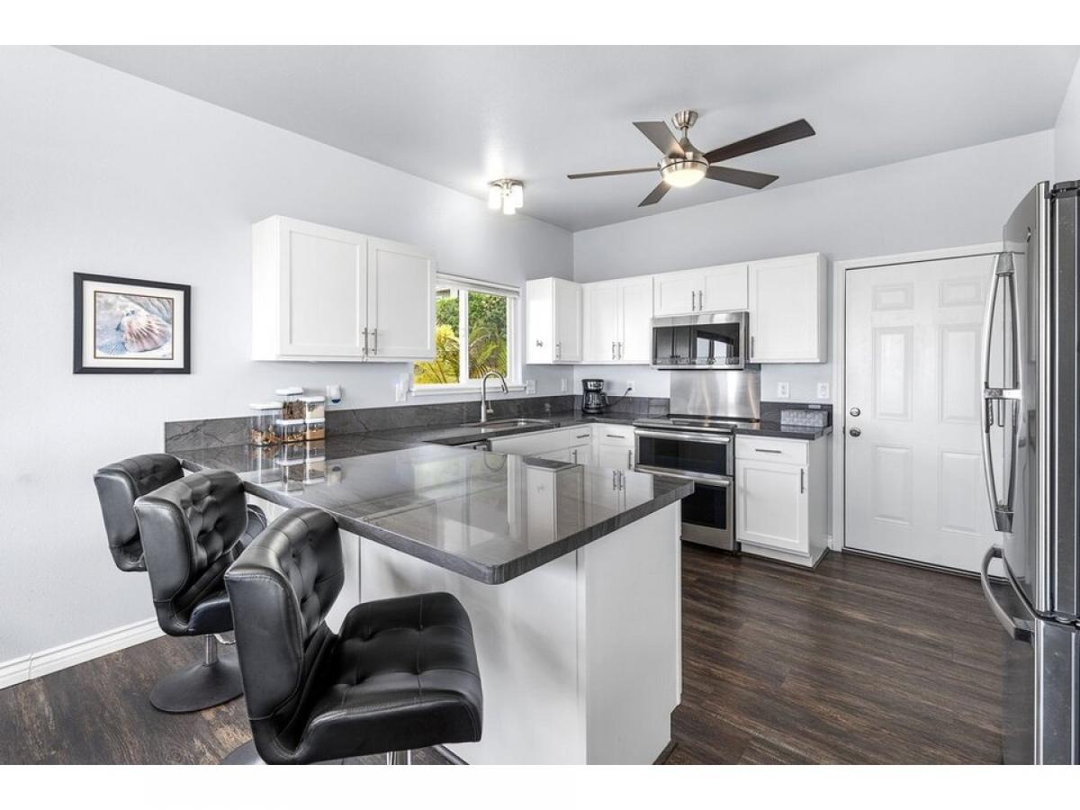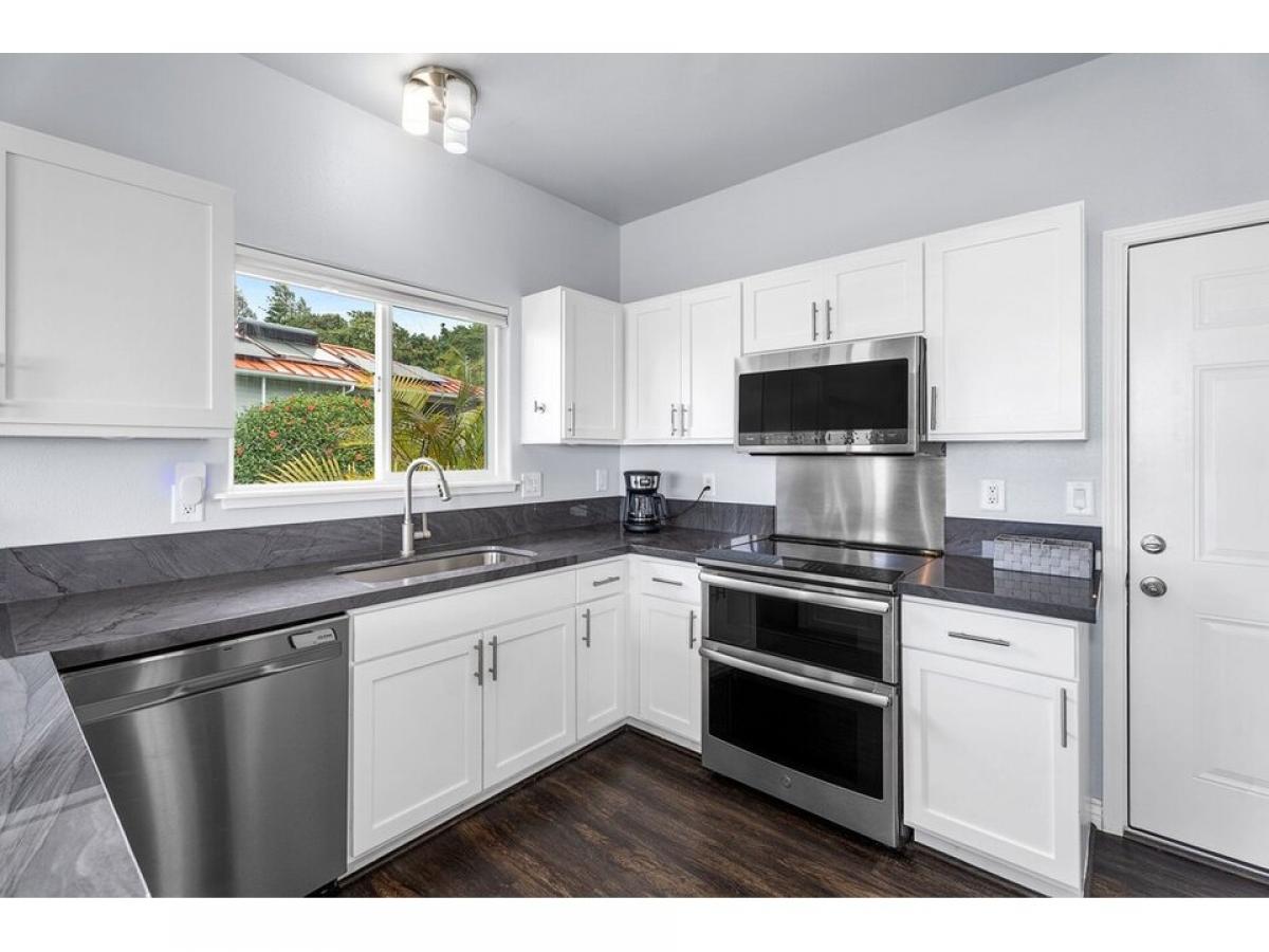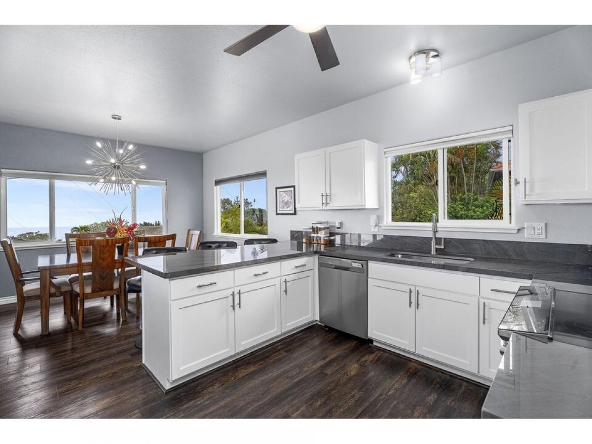 Welcome home!This lovely single level home is situated in a boutique subdivision of 12 homes above the Kona airport at a perfect elevation where you will be able to enjoy the beautiful trade winds by day amp; cool mountain breezes at night. The exterior of this home has a very low maintenance yard, for that carefree life style. Interior shows pride of ownership. Kitchen has quartzite counters amp; GE Profile stainless steel appliances. Both bathroom have been upgraded including a Brondell wash-let amp; Bluetooth connectivity for music. Living room has Cali vinyl flooring, and a corner electric fireplace that is wonderful for those cool evenings after watching those amazing sunset from the lanai.There is an abundance of windows; ocean views can be seen from nearly every room in the home. There are custom blinds along with premium Cali vinyl planking throughout. Home is being sold furnished for an easy move in.Two car garage is situated off the kitchen making it easy access for coming home with your groceries.Sellers have added solar with Sunrun there are 11 panels of solar on the roof with 1tesla battery. There is also a plug in the garage for an electric car. This is a leased system.