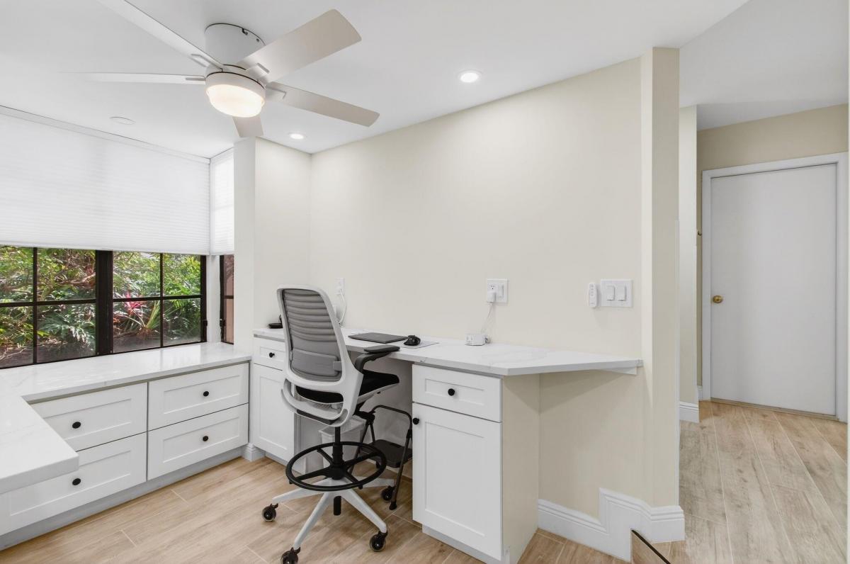 La Mirada at Boca Pointe Lake views 2023 full renovation Corner townhome Gated community Pool nearby Roof, exterior, cable, internet included Optional Boca Pointe club membership.Set within the gated La Mirada enclave of Boca Pointe, this corner townhome blends a 2023 interior renovation with tranquil lake views and a prime Boca Raton setting. The 1,823 sq ft design features smooth ceilings, fresh paint, new tile flooring on the main level, and new laminate on the stairs and upper floor. The fully updated kitchen offers new cabinetry, countertops, appliances, and a new washer and dryer, while the adjacent nook has been finished as a custom office space that can easily convert back to an eat-in area.