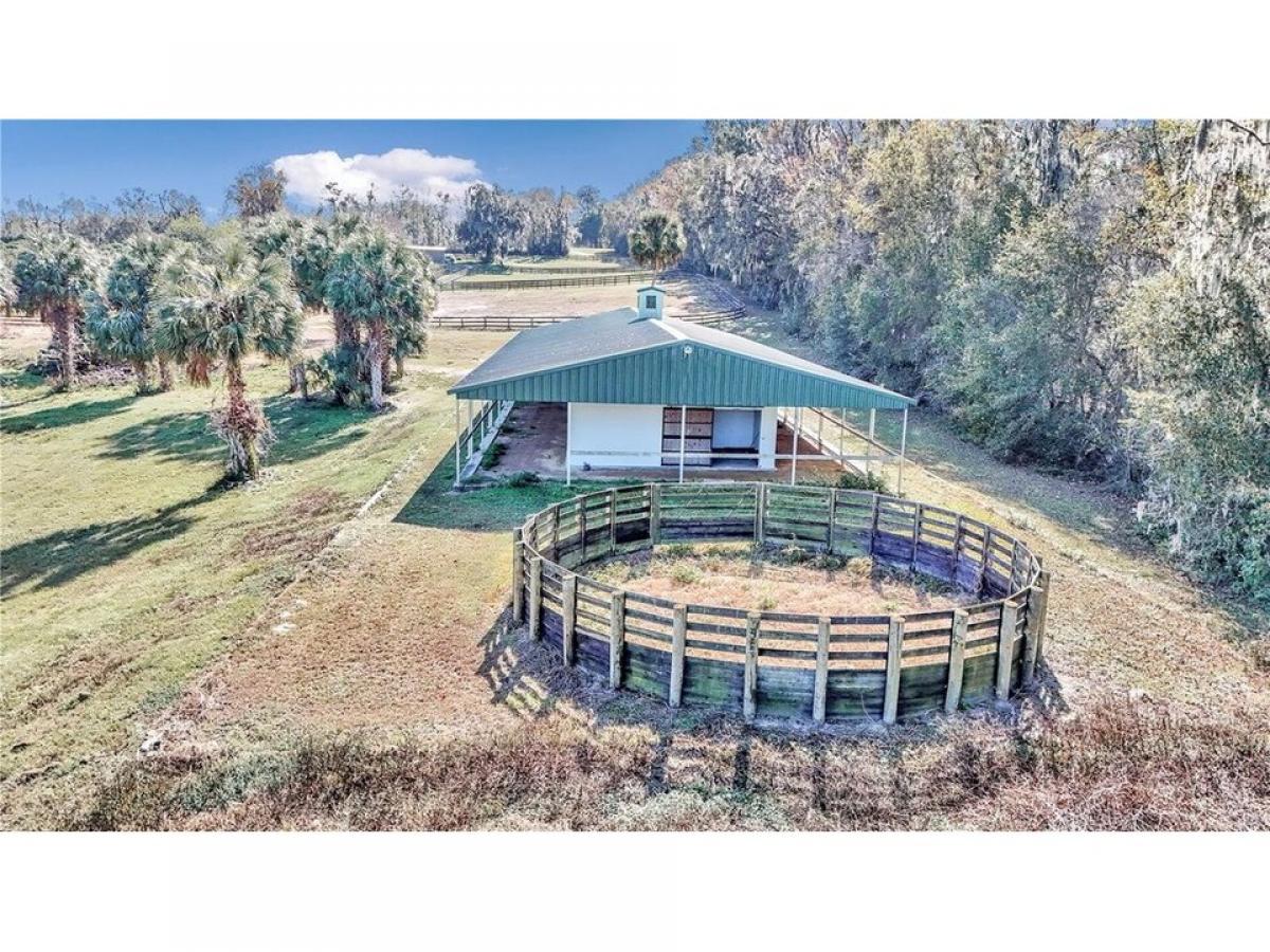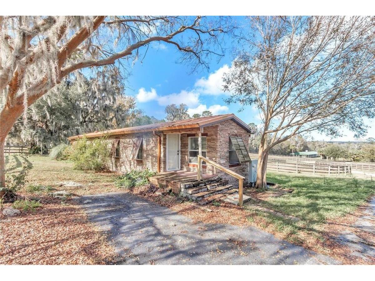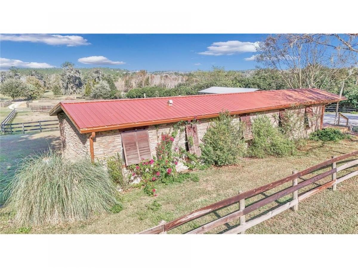 This 10 acre horse farm features 12 stall concrete block barn with spacious stalls, large hay storage with full bath plumbed for potential apartment and oversized tack room. There are seven large paddocks forturn out and a round pin. The perfect area for your arena and additional space behind the barn for hacking! Double gated entrance for easy in and out with your horse trailers . The home is a single wide with custom full four sided stacked stone, lifetime metal roof, and shutters decorating the windows for privacy and lower energy costs. This 2 bedroom 1 bathroom home has just been freshly painted on the interior. There is lvp, tile and carpet in 1 of the bedrooms and features spacious living room and large deck overlooking all of the picturesque 10 acres. An additional barn matching the home with stack stone features 3 additional stalls with tack room/storage area. This perfectly sized property is all about location as well being a short drive to the World equestrian center, hits and all 3 day eventing venues! Owner Financing Available!