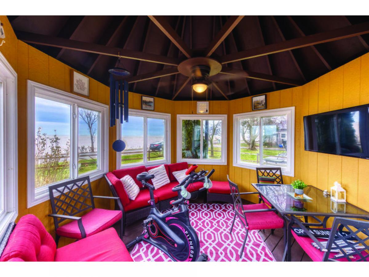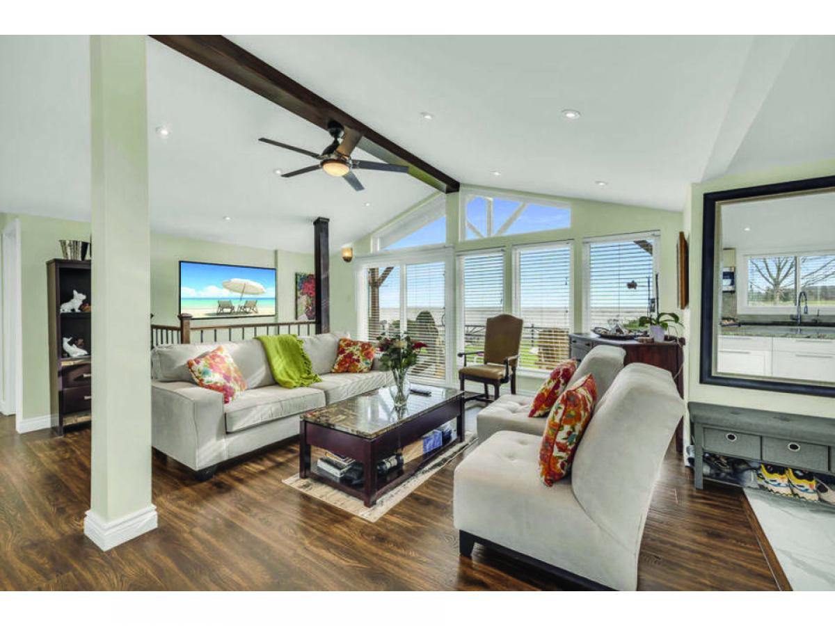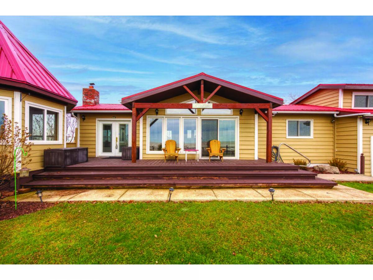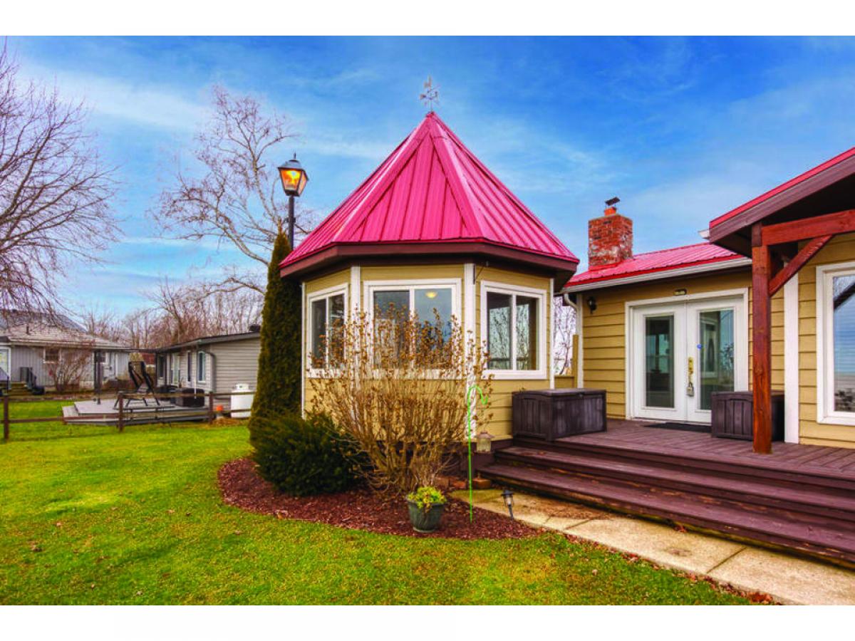 Chalet-style 3-bedrm home! Panoramic lake view! Nearly 1/2 acre property, 100 ft of frontage, 1,770 sqft living space incl fin'd lwr-lvl, open concept main floor with luxurious upgrades, vaulted ceilings, wood stove & exposed wood beams.