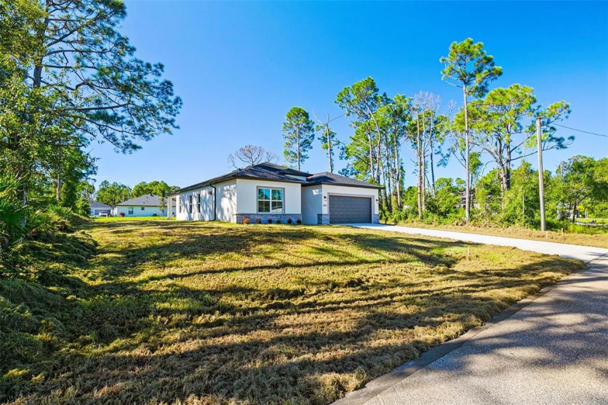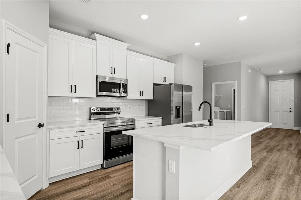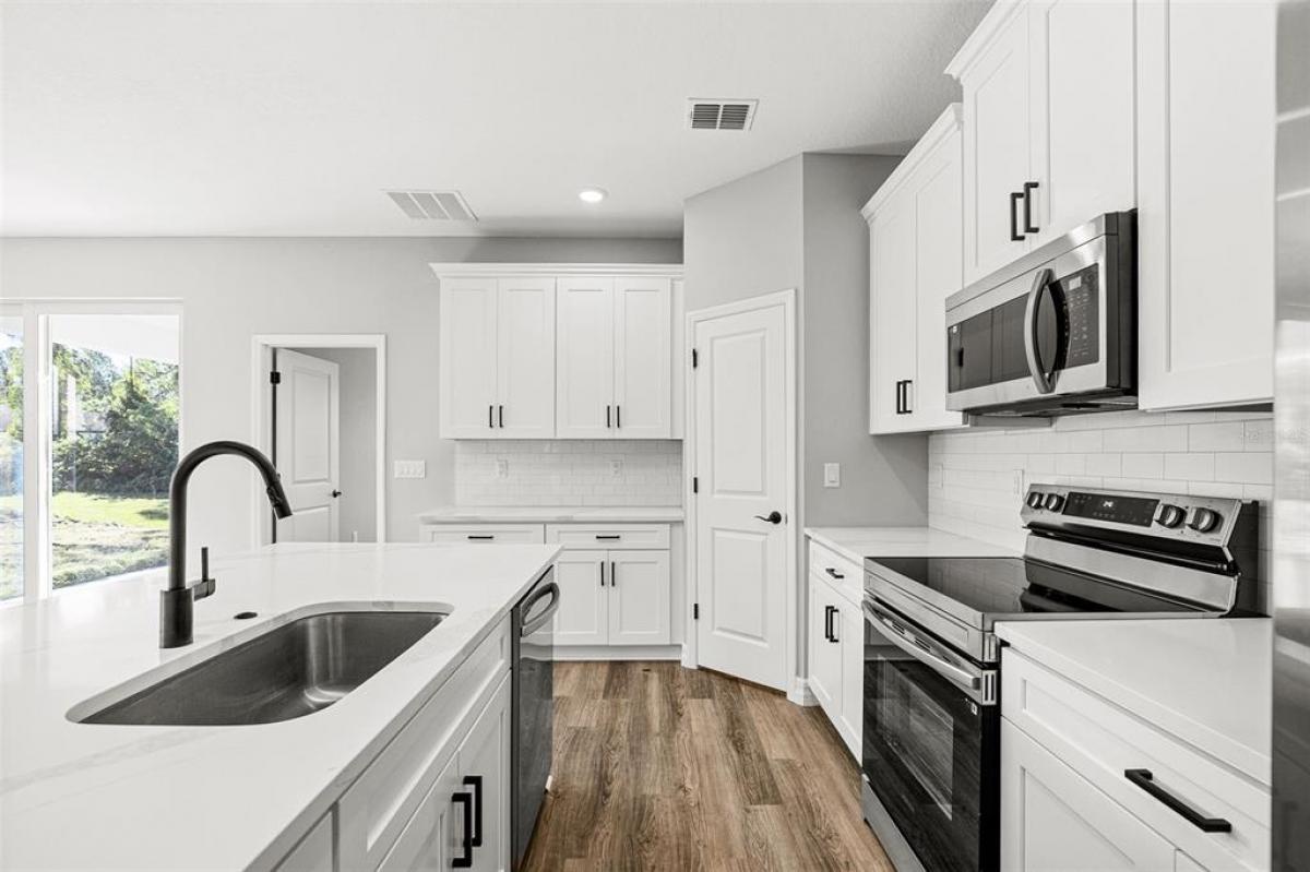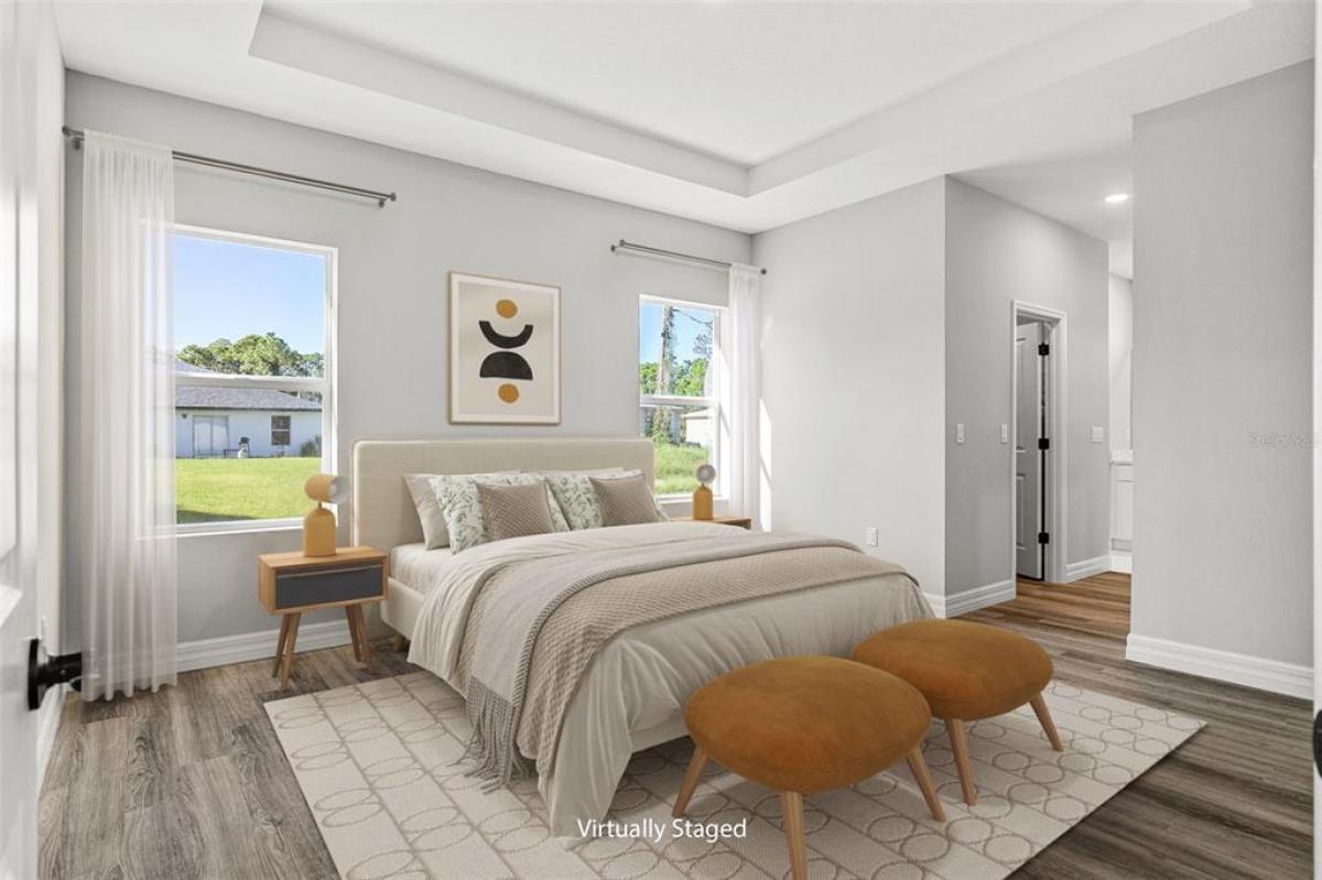 One or more photo(s) has been virtually staged. Welcome to your brand-new North Port home! This thoughtfully designed 4-bedroom, 3-bathroom residence with a 2-car garage offers 1,990 sq. ft. of modern living space, blending comfort, functionality, and style. Inside this light, bright and airy home you will find 9' 4" ceilings, 8' interior doors, and luxury vinyl plank flooring throughout. The open-concept layout showcases a chef-inspired kitchen with quartz countertops, custom tile backsplash, Samsung stainless steel appliances, a walk-in pantry, and a spacious center island with breakfast bar seating. Seamlessly connected to the main living area, sliding glass doors lead to a covered lanai - ideal for indoor-outdoor living. The private primary suite is a serene retreat, highlighted by a tray ceiling, dual walk-in closets, and a spa-like bath with double vanities and a walk-in tiled shower. A smart split-bedroom design includes two well-appointed guest rooms with a shared full bath, one of which can easily serve as a den or home office. The fourth bedroom features its own private en-suite bathroom which is perfect for overnight guests, in-laws, or multigenerational living. Perfectly situated near shopping, dining, schools, parks, and golf courses, this home also offers easy access to Charlotte Harbor, downtown Punta Gorda, and the pristine Gulf Coast beaches. Vacant and easy to show!
