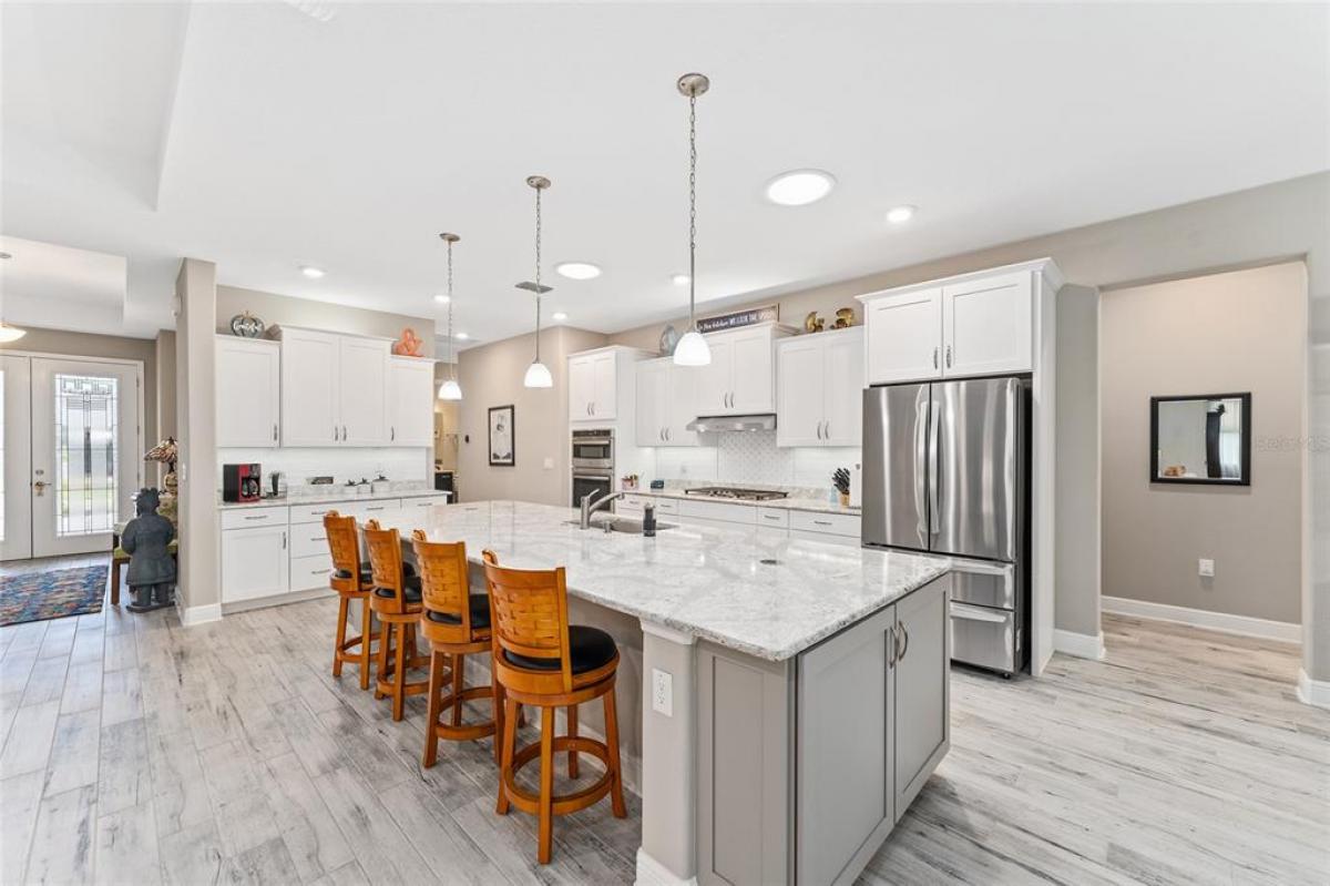 Welcome to 8290 SW 92nd Circle in the West Kestrel neighborhood of Candler Hills in Top Of The World! Greeted by the professional landscaping and the welcoming front porch, you know you are home! You will enjoy the special touches the sellers made to this highly desired Aberdeen Model. Like many new homes, you need to look for the added value items done by the seller to make it their home. The neutral choices they made will let you move right in! The Aberdeen has three bedrooms (of which two can be primary suites), three baths plus a den/flex room. The home has so many desired standard features, along with many items added at the Design Center: Ceramic plank flooring throughout the home, Drywall with round corners, Neutral gray paint in every room, Dovetailed drawers and upgraded hardware throughout the home. In the kitchen: Crown molding added to the 4 level staggered kitchen cabinets, three-drawer bank was added replacing cabinet doors, and in addition, the home has a beautiful 112 x 54" island featuring Cambria Quartz/Summerhill countertops with a bull nosed edge. Two solar tubes were installed above the island! As a bonus the island has disappearing electrical outlets that will pop up when needed and stay out of the way for a clean look! Electrical outlets with dedicated switches were added above the cabinets. The neutral backsplash with mastic grout and tile edged trim are timeless. Of course, the cabinets have pullout drawers for your convenience! The GE thirty-six-inch six burner gas range will handle cooking needs. Clean-up is easy with the GE forty-five decibel stainless tub dishwasher. A highly rated top-of-the-line LG refrigerator is also included. There is a solar tube added to the kitchen plus another down the hall leading to the third car garage. Ceiling fans are found throughout the home, lanai and garage. In the great room, the seller added recessed lighting, a floor outlet and a dedicated twenty-amp outlet for an electric fireplace. In the Flex room there is recessed lighting and low voltage media wiring for TV, Internet and phone. Custom lanai solar shades are also included! The owner added Levelor blinds with remote drapery and hardware in the great room and dining room and owner’s suite. The enclosed lanai has a level floor to the great room and a twenty-four-inch knee wall. Seller also added a GFCI outlet plus a ceiling fan with lighting along with painted walls. Outside the lanai enjoy the professionally landscaped beds with concrete edging plus a 38x10 patio area for your outdoor entertainment! As you might expect, the bathrooms are over the top! The owner’s suite has beveled edge mirrors, three drawer bank, 1x3 herring bone designed shower floor. All three baths have upgraded 10x14 tiled shower walls and Delta fixtures. The laundry has upgraded laundry cabinets with a sink base, granite countertop with bull nosed edge, top-of-the-line LG washer and dryer, 220 Volt outlet at dryer and drop-in laundry tub and faucet. Outside you will find the rich-looking paver driveway, professional landscaping with curbing. The seller added gutters and leaders to move rainwater away from the home. This home has over $100k in options between the seller and design center. You will not find these special touches in a new construction at this affordable price! Thinking of building? Look here first and be amazed with what this home offers at this price! HSA Home Warranty is included Call Today!