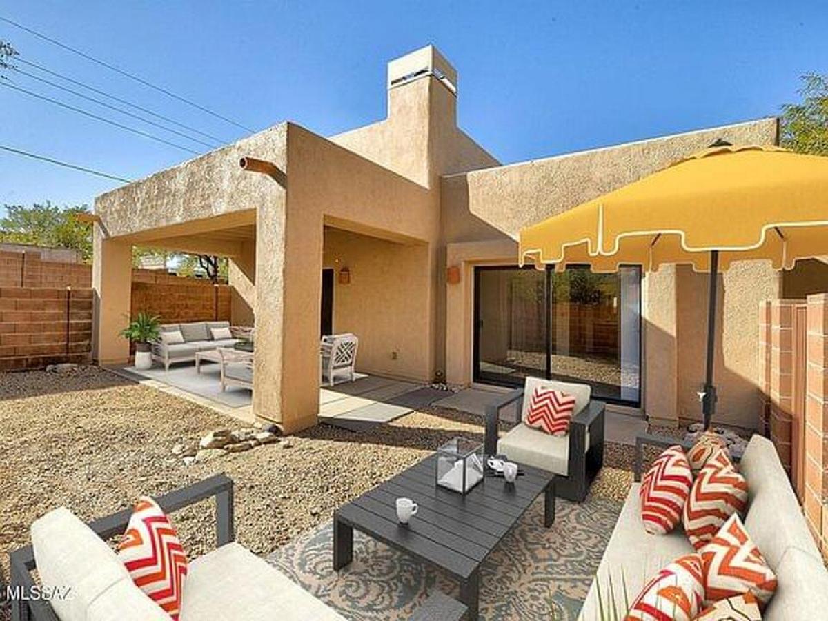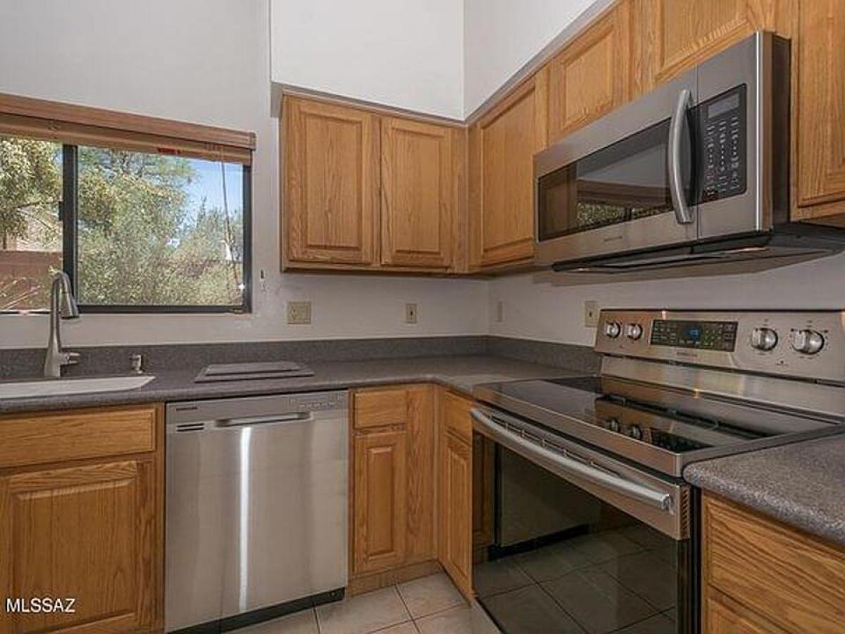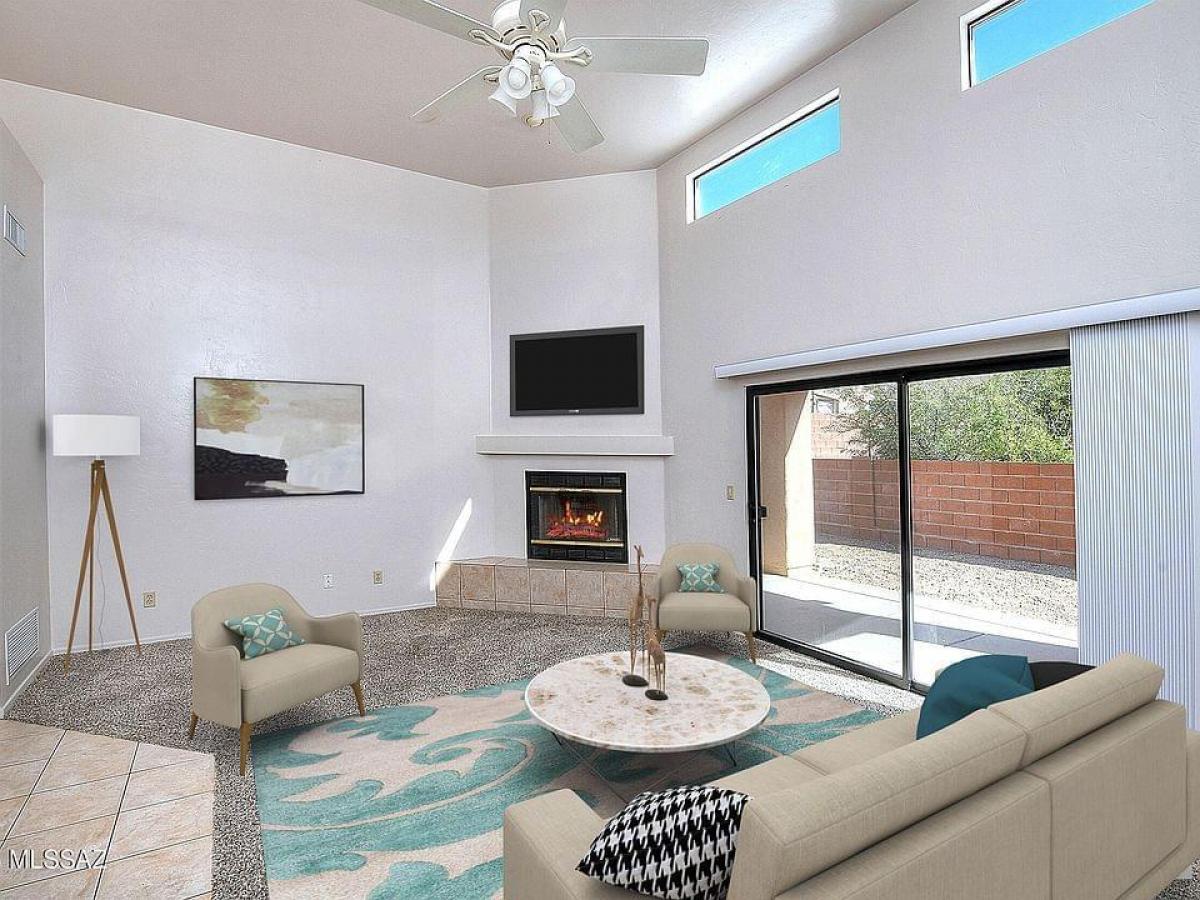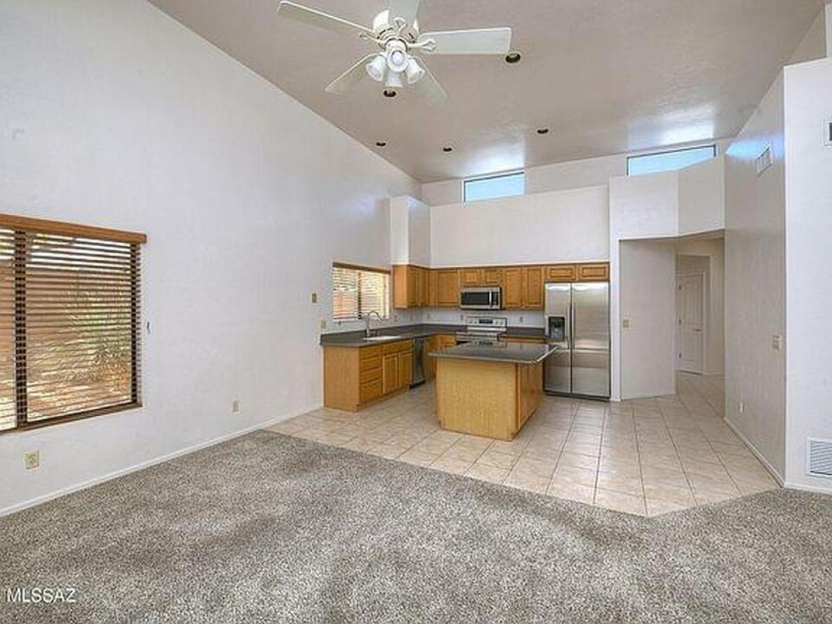 Designed by renowned architect Ron Robinette, this charming home combines modern design with functionality. Featuring soaring vaulted ceilings and clerestory windows that fill the space with natural light, it offers a spacious island kitchen with sleek stainless steel appliances. The kitchen flows seamlessly into a large great room, complete with a cozy fireplace, creating the perfect setting for entertaining. Step outside to an expansive block-walled backyard with mountain views and a covered patio ideal for outdoor relaxation. Located at the end of a quiet cul-de-sac, the home is part of a welcoming community with a pool and picnic area. Enjoy easy access to both Tucson and Oro Valley's shopping, dining, and entertainment options.