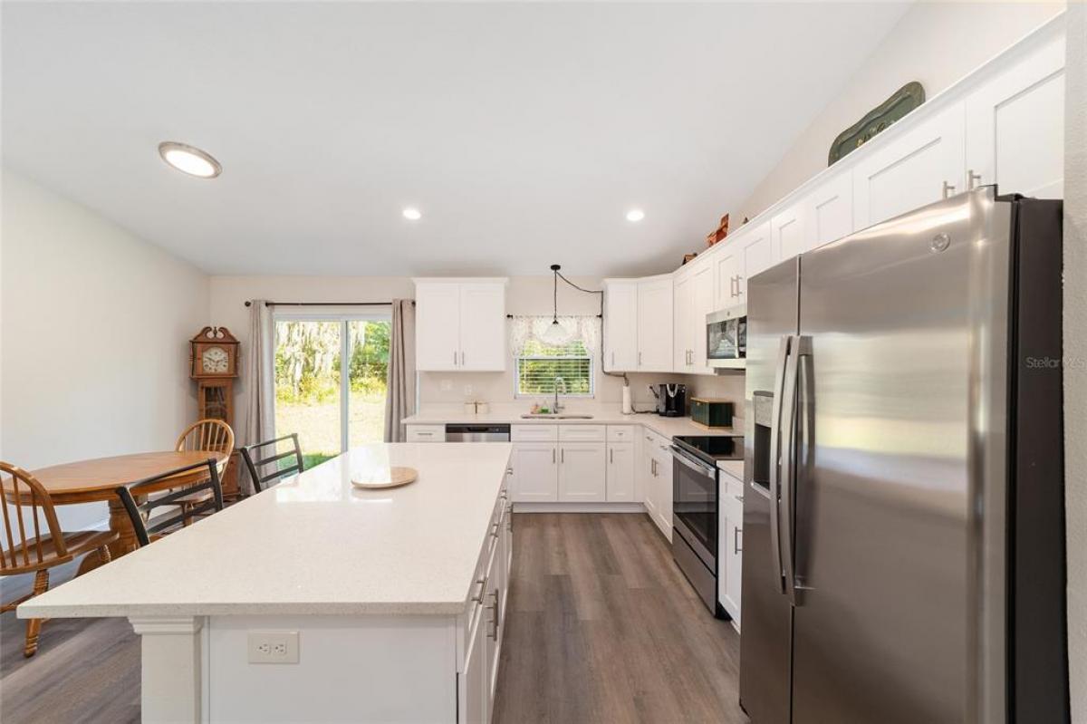 Built in 2022, this move-in-ready home offers modern comfort and an open layout designed for easy living. The spacious kitchen features 42-inch shaker cabinetry, quartz countertops, stainless steel appliances, recessed lighting, and a large island perfect for meal prep or casual dining. High ceilings, double-pane windows, and a luxury vinyl plank flooring flow throughout the home, creating a bright and cohesive space. The split-bedroom floor plan provides privacy, with a generous owner's suite that includes a large walk-in closet and double vanity bathroom with quartz counters. Located in the established Marion Oaks community with no HOA, this home sits in a quieter section near a natural preserve area, offering a sense of space and privacy while remaining close to shopping, dining, and major highways for easy commuting. A great opportunity to own a newer home without waiting on construction.