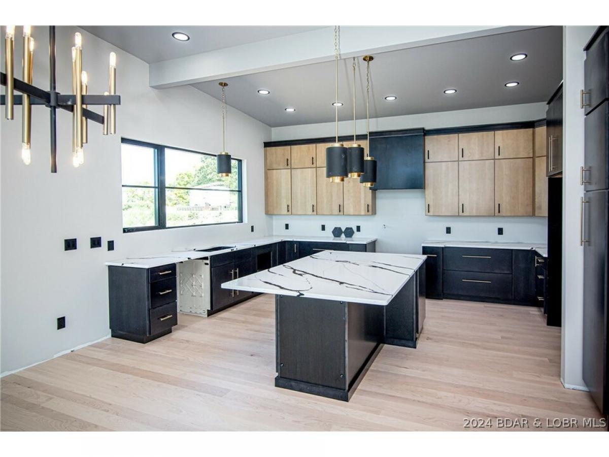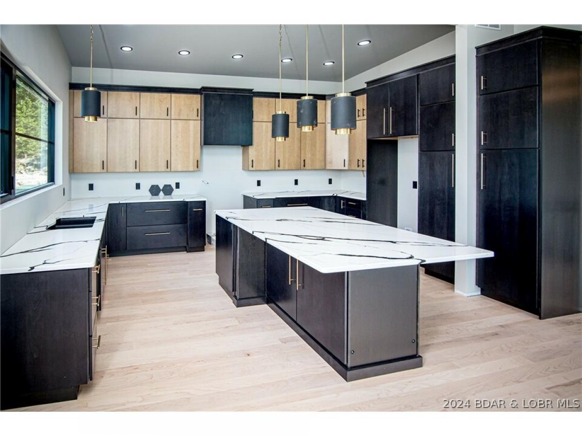 Stunning new modern home with breathtaking views located in Linn Creek Cove! With 3 beds, 3.5 baths, & 2.5 car garage this 3,300+ sf home features exquisite maple hardwood flooring, gas fireplace, designer kitchen with premium cabinetry & gas cooktop, metal roof, and Quaker aluminum windows maximizing the panoramic lake view. Each bedroom boasts a walk-in closet, custom tile onyx bathrooms and sleek quartz countertops. Enjoy the expansive composite hardwood decking on both levels, complemented by a custom cable deck railing, and the durability of prefinished metal roofing and LP natural wood siding. Additional room on the lower level could be a nice wine cellar. Large safe room/storage. So many great features! Assessments are paid every 6 months. Stop by and see the progress!