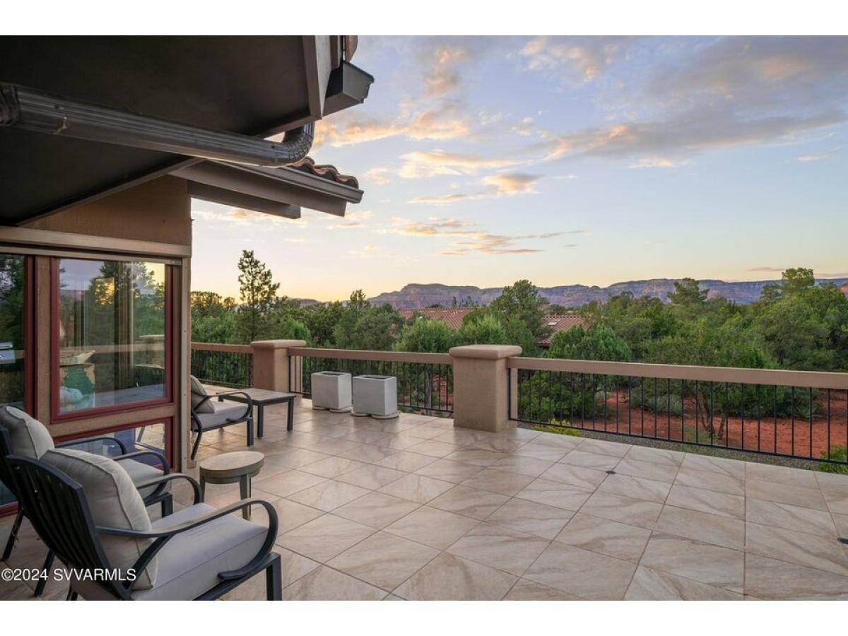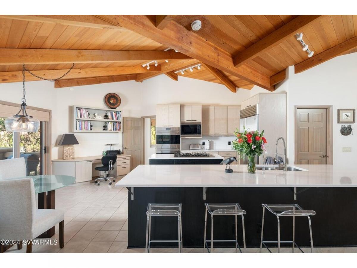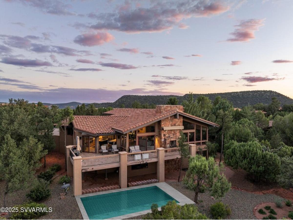 This 4,364 sq. ft. home in the gated Foothills South subdivision sits on .47 acres, offering breathtaking Thunder Mountain red rock views along with the convenience of new solar panels and an upgraded HVAC system. Thoughtfully designed for both luxury and energy efficiency, this home truly captures the essence of Sedona living. at room features newer wood floors, cedar wood ceilings, a stone gas fireplace, and floor-to-ceiling windows that flood the space with natural light while showcasing the stunning surrounding scenery. The chef#039;s kitchen is a standout, boasting new quartz countertops, a gas Viking cooktop, Wolfe double ovens, a Sub-Zero refrigerator, and a Wolfe microwave, creating the perfect space for culinary enthusiasts. There#039;s room for a pool! Photo of pool staged.