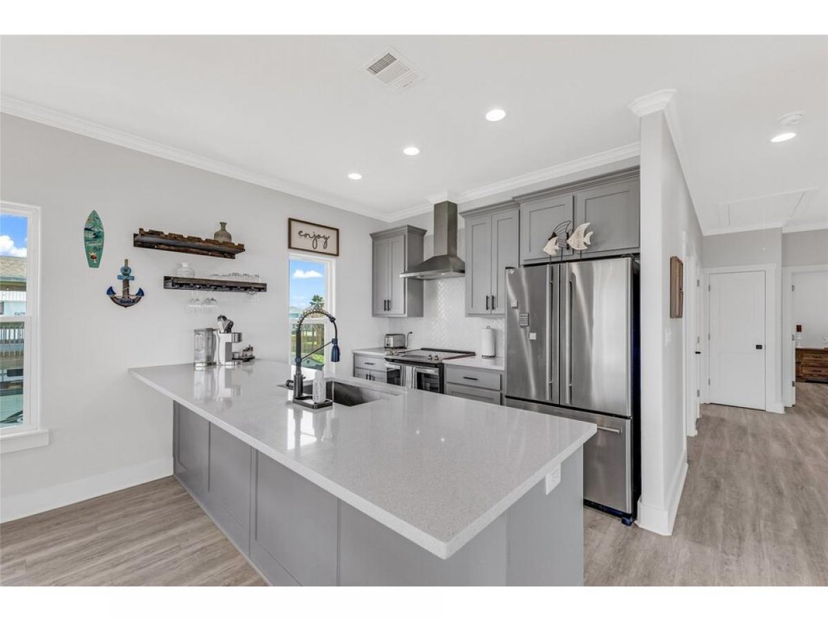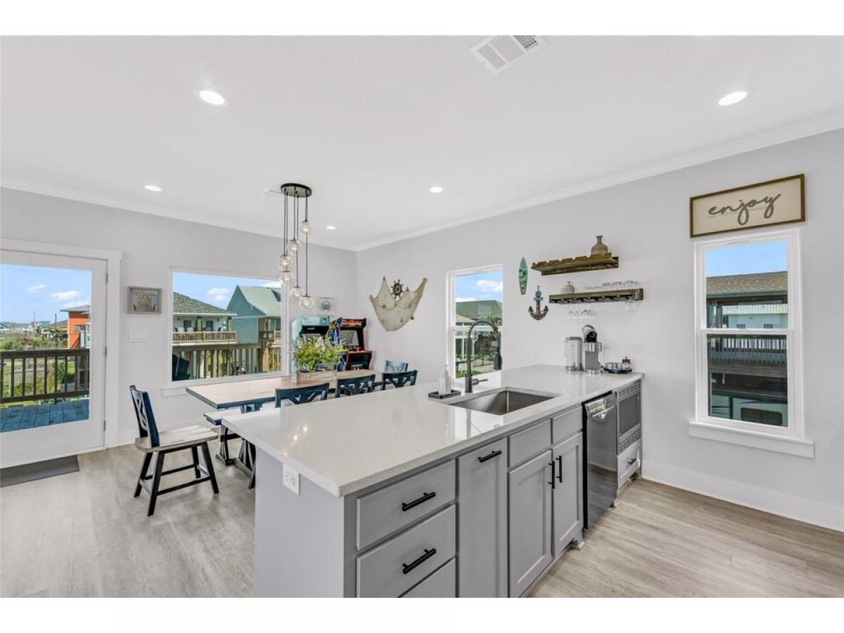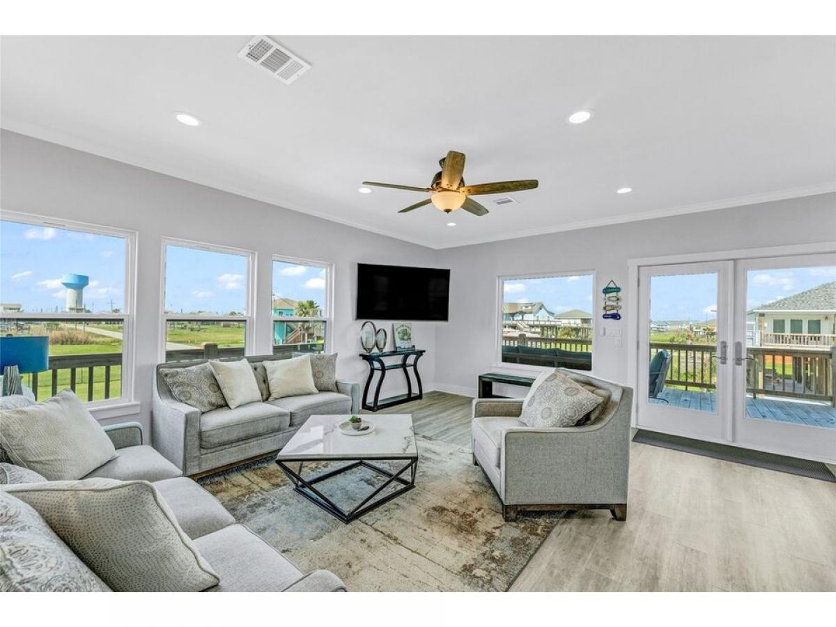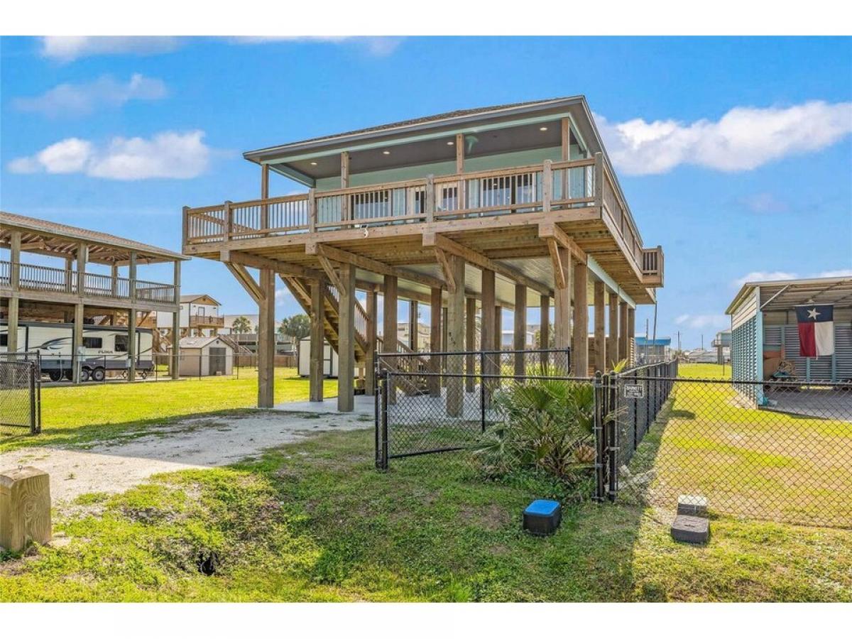 Discover your dream getaway in Crystal Beach, where ocean views meet an ideal location just steps from the shore. This charming 3-bedroom 2 bath home, featuring an additional versatile flex bunk room, effortlessly accommodates families and is a sought-after active rental, comfortably hosting up to 8 guests. Constructed in 2022, the open floorplan is adorned with high-end finishes, modern conveniences, and comes fully furnished with a design that marries style while built for resilience against severe weather. Enjoy additional perks like a refreshing sand shower, a 50/30 amp RV plug, and ample parking for vehicles or small RVs under the home. With no HOA fees and spacious county-owned green space behind for extra parking or recreational space, this property distinguishes itself, blending aspirational living with practicality, ensuring an unmatched family retreat and investment opportunity.
