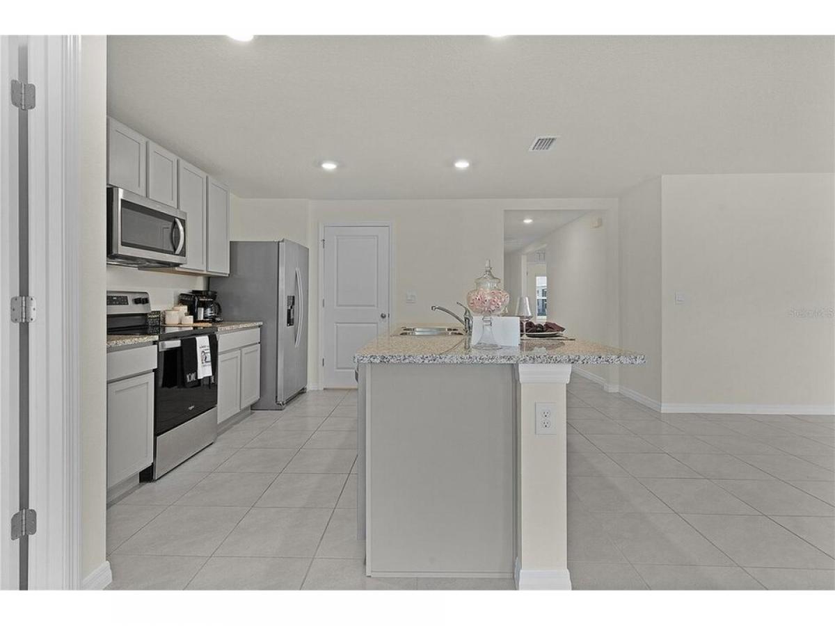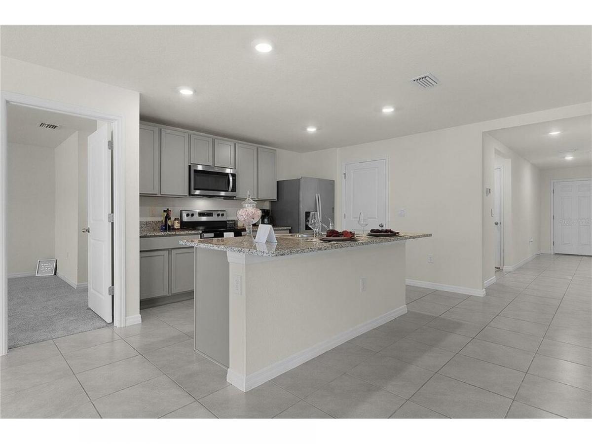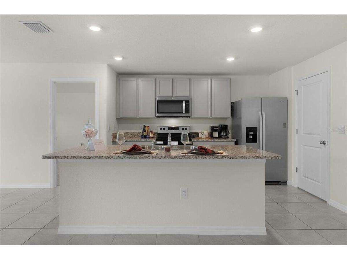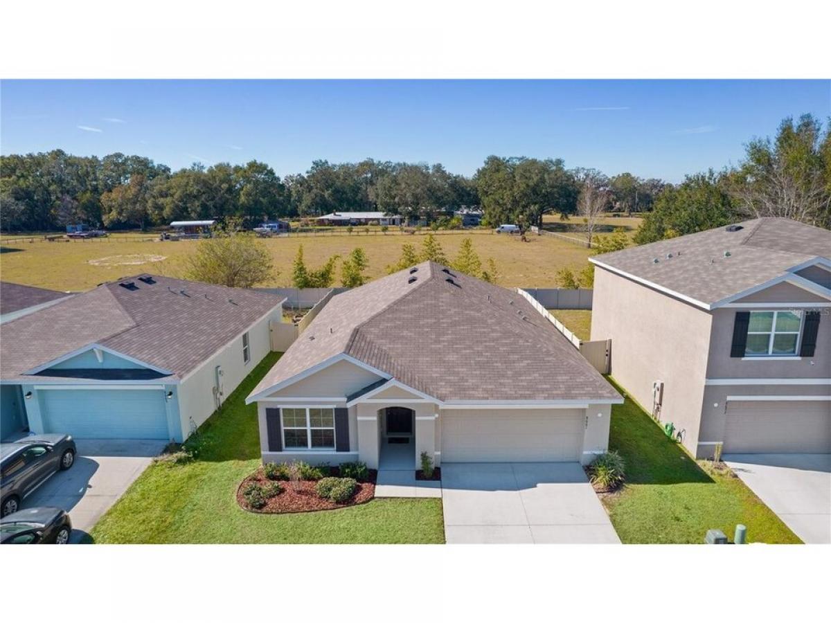 EXPERIENCE ONLY GOOD VIBES in this popular ARIA model BLOCK AND STUCCO 3-BEDROOM, 2-BATHROOM, 2-CAR GARAGE HOME with a spacious 1,664 SQUARE FEET of thoughtfully designed interior living space. Built in 2022, it is nestled in the secluded TRIUMPH SOUTH SUBDIVISION of WILDWOOD, providing a serene and family-friendly setting. Step inside to an open-concept layout, where CERAMIC TILE FLOORING flows seamlessly through the main living areas, complemented by cozy CARPETED BEDROOMS for added comfort. The kitchen is a standout, featuring GRANITE COUNTERTOPS, a LARGE GRANITE ISLAND, STAINLESS STEEL APPLIANCES, GRAY WOOD CABINETRY, and a SPACIOUS WALK-IN PANTRYmdash;combining functionality with sophisticated, contemporary style. The primary bedroom retreat, located at the quiet rear of the home, offers a peaceful escape with a HUGE WALK-IN CLOSET and a luxurious ENSUITE BATHROOM. The ensuite includes a SECOND CLOSET, a LONG DOUBLE-SINK VANITY, a spacious shower with a rain showerhead (both baths have been upgraded with rain showerheads), and a PRIVATE WATER CLOSETmdash; Luxury at its finest. The SPLIT-BEDROOM LAYOUT ensures privacy for everyone. The two additional bedrooms, tucked into a private front wing, share their own hallway, a full bathroom, and a linen closet. This area is ideal for guests, family members or maybe you need an office, hobby, art, or crafts room. So many opportunities. Other home highlights include a 2-CAR GARAGE, an INSIDE LAUNDRY ROOM WITH A WASHER AND DRYER, and a SPACIOUS LANAI. The VINYL-FENCED BACKYARD offers a generous area for relaxing or entertaining, with the added bonus of no rear neighbors for enhanced privacy. Located in a low-traffic neighborhood with a single entry and exit point, this home ensures both safety and tranquility. BRAND NEW PARK IS CURRENTLY BEING INSTALLED COMPLETE WITH A PLAYGROUND AND BOCCE BALL COURT. Should be ready when you move in. Be the first to enjoy it. Enjoy the convenience of nearby shopping, dining, and The Villages Town Squares, where free nightly outdoor music awaits. Exciting new developments coming to the area, including TARGET, OUTBACK STEAKHOUSE, CHIPOTLE, and CRUMBL SWEETS SHOP, are just minutes away, making this an ideal location for growth and convenience. This is a great opportunity to own a stunning home in a rapidly growing area.