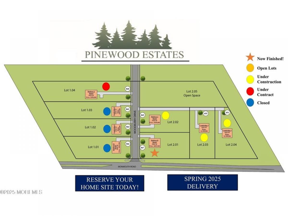 Welcome to Pinewood Estates! This Brand New 8 Home Subdivision is located in Jackson, NJ with less than a mile from 195 amp; Jackson Outlets amp; only 3 miles from Six Flags! Also, it is right around the corner from the new Adventure Crossings! This Lot (1.041 Acres) features the Madison B Model (NOW FINISHED!) which includes 4 Beds, 2.5 Baths, 2 Car Garage, Full Basement, 2966 SF, Walkup Attic that could be finished which would increase square footage to 3537 SF, Open Floorplan layout, Engineered Flooring on 1st Floor/2nd Floor Hallway, Custom trim/paint throughout, Large Family Room w/Gas Fireplace. Kitchen boasts Center Island, Granite tops, Tile backsplash, amp; SS Appliances Huge Owner#039;s Suite w/2 Walk-in Closets, sitting area amp; attached Full bath w/Dual Sink Vanities amp; Shower Stall. There are also multiple other quick delivery options! Don#039;t miss out on your chance to see this one!