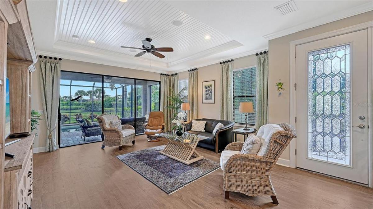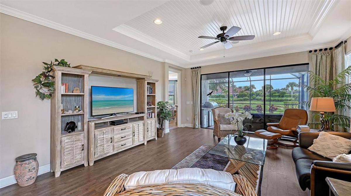 Welcome to Cobblestone, a premier gated community in Sarasota’s desirable Palmer Ranch. This former model home offers exceptional style and quality throughout, featuring 2 bedrooms, 2 baths, and a den/office. The open floor plan showcases hardwood floors, tray ceilings, and a beautifully appointed kitchen with backsplash. The spacious primary suite includes a walk-in closet and a dual-sink vanity. Step outside to your own private oasis—an extended lanai with outdoor kitchen, complete with sink and refrigerator, plus a sparkling private pool with a waterfall feature, all overlooking the peaceful lake. Situated on a premium corner lot, this home has been lovingly cared for by its original owner.Cobblestone offers exceptional resort-style amenities including a clubhouse, fitness center, resort-style and heated community pools, spa, tennis courts, pickleball, bocce ball, and a dog park. Enjoy walking access to the Legacy Trail, and a short drive to restaurants, shopping, and the world-renowned Siesta Key Beach. No flood zone and no CDD fees. This is Sarasota living at its finest!