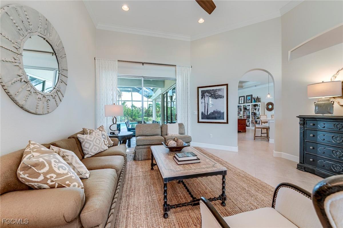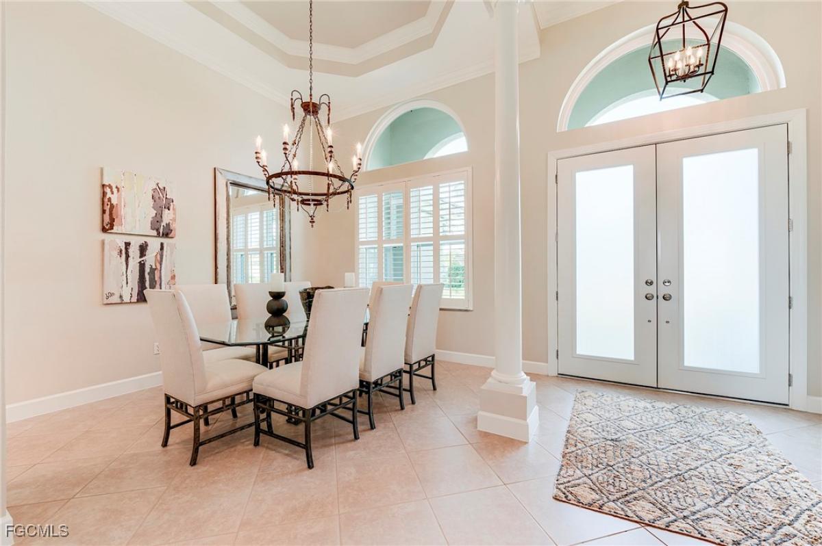 Stunningly beautiful sunrise view over the 17th golf fairway, very well updated, and located on the quiet cul-de-sac of the very desirable New Castle Drive. This south Ft Myers location is Crown Colony, with The Golf Club at Crown Colony as a social or golf option. The kitchen has been totally redone with new cabinetry, quartz countertops and backsplash, new SS appliances and wine cooler. The electric heated pool has been resurfaced and the pool deck refinished with an easy-to-maintain artistic stamped concrete. This home has a new tile roof, impact windows and StormSmart remote fabric roll-down shutters for total storm protection. And though all Crown Colony homes remained dry during Ian, flood insurance is available to transfer to a now owner with a current low annual cost of $1,974. The HOA is very well run with low quarterly fees providing all lawn maintenance on a weekly schedule, 24x7 attended gated access, a community pool, hot tub, 4 Har-Tru tennis courts, and well-equipped fitness center open 24x7. Comcast fiber-optic cable and the Xfinity X1 platform with up to 4 TV/DVR boxes, and high-speed Wi-Fi Internet are all part of the dues - over a $750 quarterly value at retail. Social membership (for Club restaurant access) or golf membership at The Golf Club at Crown Colony is optional. And there is no waitlist for membership! This Club was chosen for the 2022 LPGA $1.5M Drive-On Championship, hosting the world's top women golfers, and is also used for PGA qualifying events.