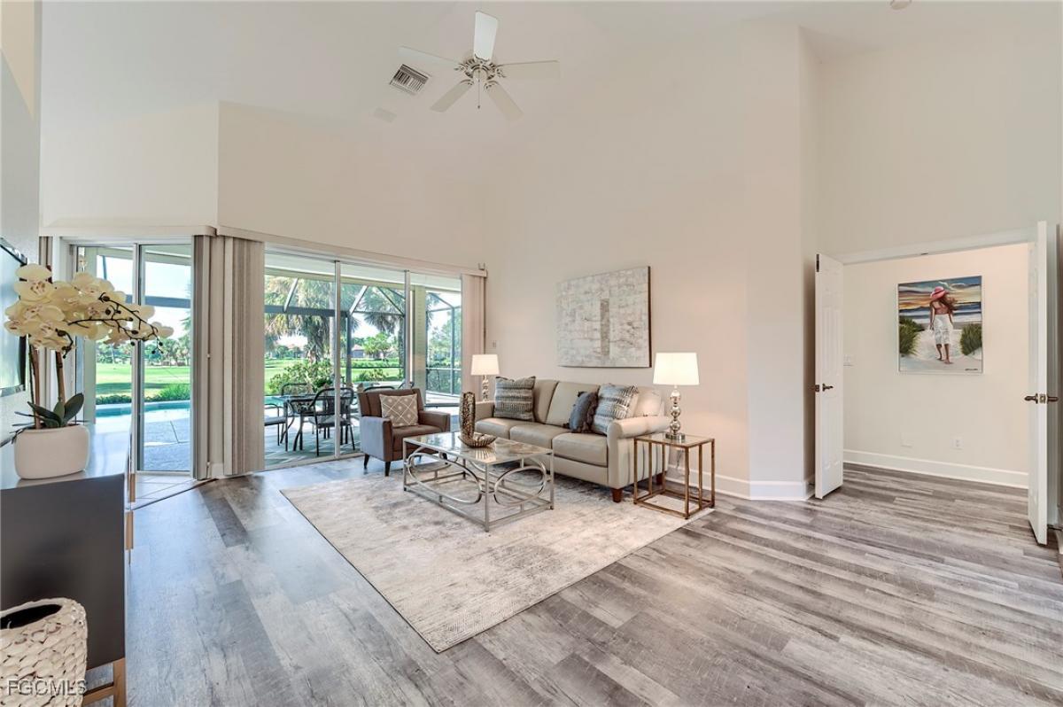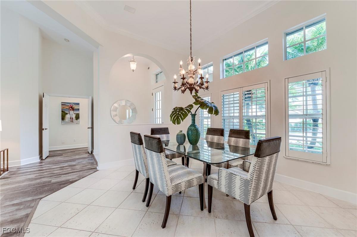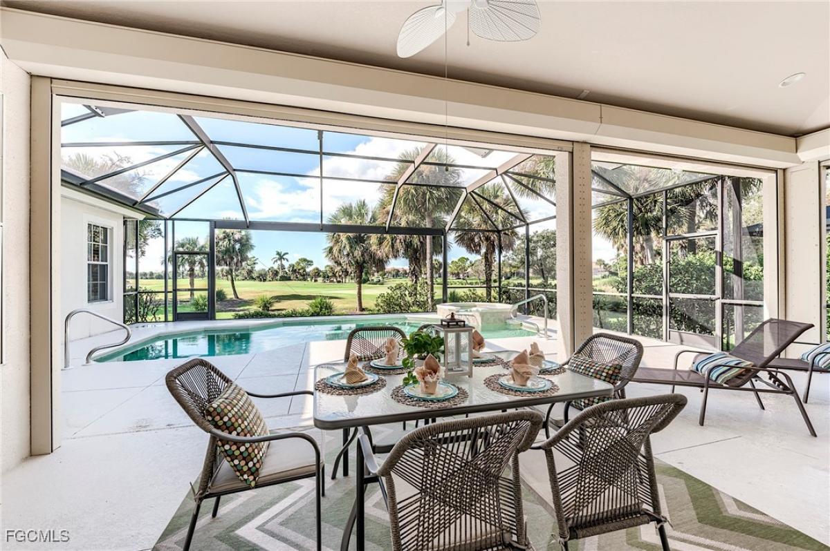 Enjoy a southwest, "Golf Digest" view of the beautiful 5th Green at The Golf Club at Crown Colony through a picture frame screened lanai and pool. This very rare 4 BR Areca model was enlarged by the builder at construction with an added bedroom and bath, making this one of only two 2,359 sq ft, 4/3 models of its type. Fresh paint covers all interior areas and garage for a move-in ready purchase. The new flat tile roof was just installed in December 2024 and the house can be made storm ready quickly with electric roll-down shutters at all the large openings with easy to install clear Lexan shutters at the windows. Newer LVP flooring was installed in the main living areas, the primary bedroom and the 4th bedroom/office. Bedrooms 2 and 3 have new carpeting just installed. The kitchen and all 3 baths have tile flooring. White wood plantation shutters cover interior windows. The water heater was new in 2022, the A/C unit in early 2023, and the pool pump in 2025. The HOA is very well run with low quarterly fees providing all lawn maintenance on a weekly schedule, 24x7 attended gated access, a community pool, hot tub, 4 Har-Tru tennis courts, and well-equipped fitness center open 24x7. Comcast fiber-optic cable and the Xfinity X1 platform with up to 4 TV/DVR boxes, and high-speed Wi-Fi Internet are all part of the dues - over a $750 quarterly value at retail. Social (for Club restaurant access) or golf membership at The Golf Club at Crown Colony is optional. And there is no waitlist for membership! This Club was chosen for the 2022 LPGA $1.5M Drive-On Championship, hosting the world's top women golfers, and is also used for PGA qualifying events.