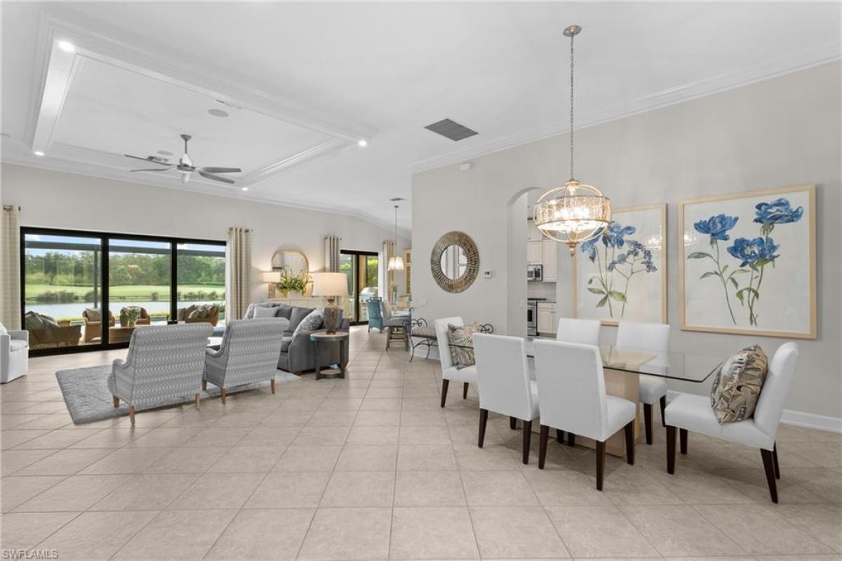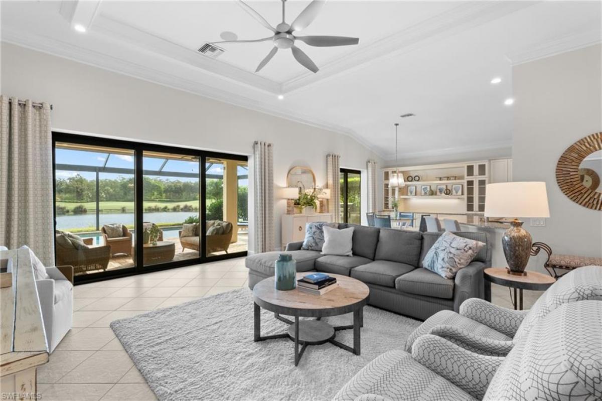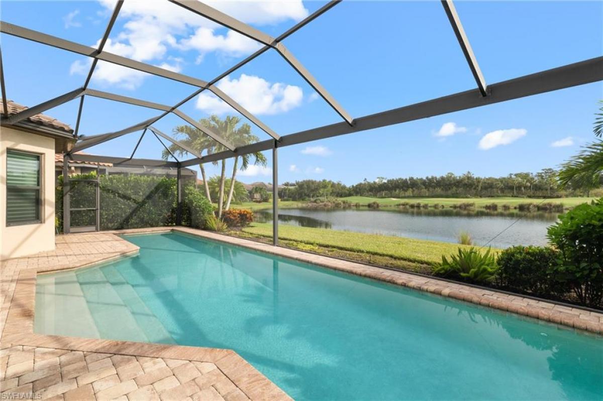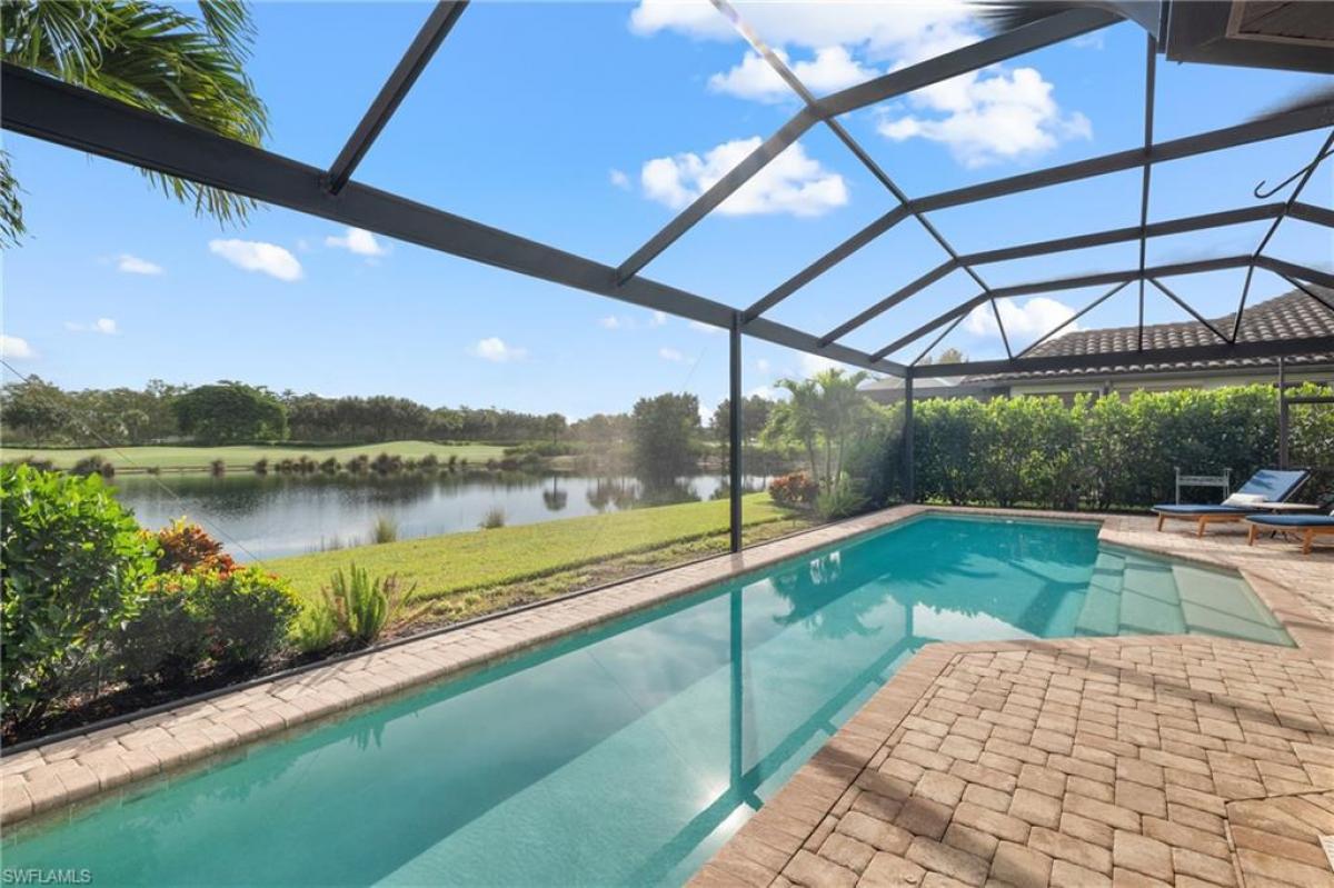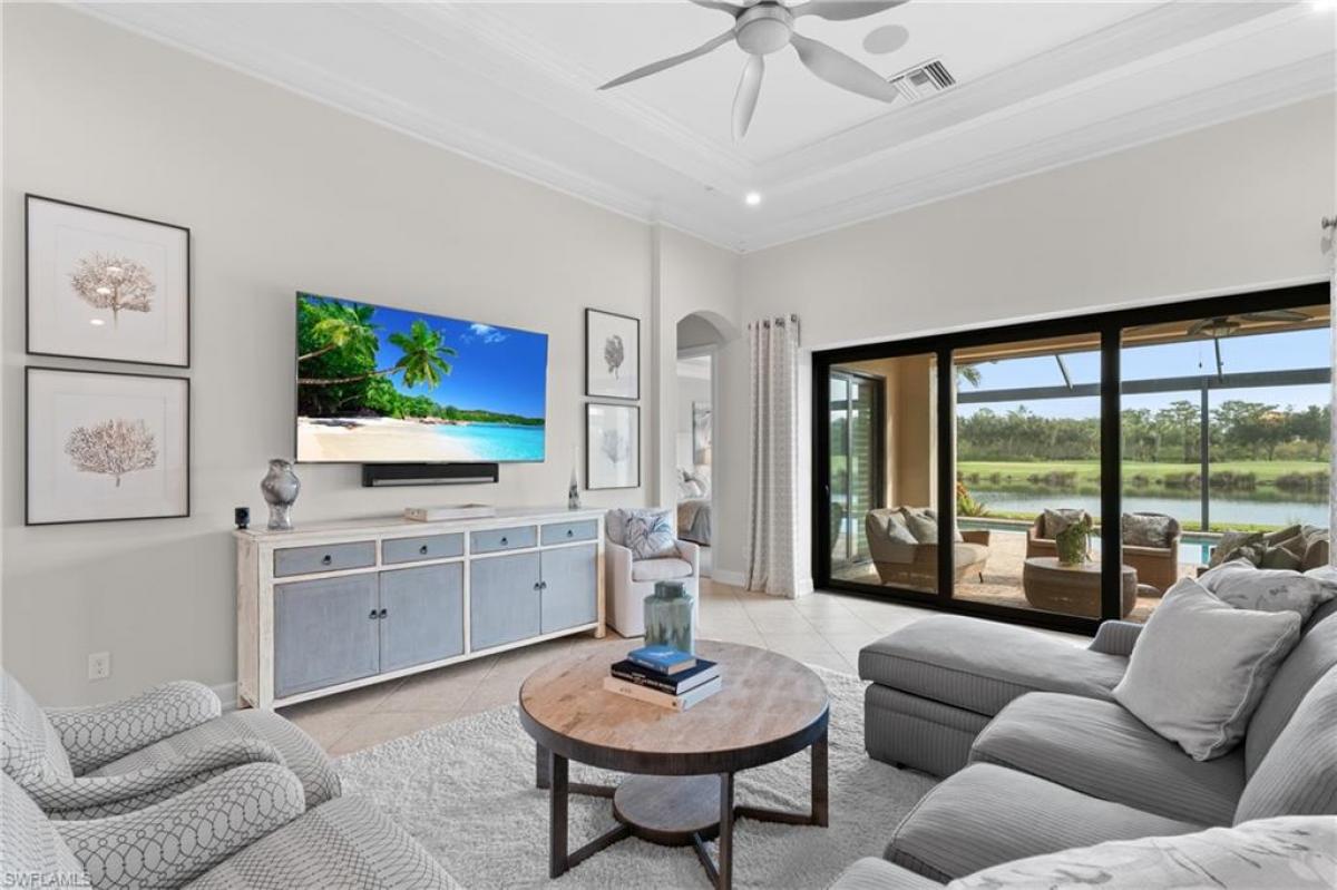 THIS HOME HAS IT ALL! STUNNING VIEWS, FULL GOLF MEMBERSHIP, and being offered FURNISHED! Incredible long lake and golf course views set the stage for this exquisite Carrera model home, being offered fully furnished for a seamless move-in experience. Perfectly positioned on a premium lot with unobstructed views of the 9th fairway/green & natural preserve, this residence offers unmatched privacy with no other homes in direct sight—all just a short walk to the golf practice facilities & the community’s vibrant amenity campus. Lovingly maintained by its owners, this 2483 Square Foot home features 3 bedrooms, 2.5 baths, and an extended two-car garage with ample space to accommodate both vehicles and a golf cart. Sophistication meets strength with hurricane-impact windows and doors, complemented by electric hurricane shutters on the lanai for added peace of mind.The outdoor living space is nothing short of extraordinary, showcasing an expansive saltwater gas-heated lap pool stretching 42 feet, bathed in sun throughout the day and framed by a beautiful screen enclosure. An outdoor kitchen and fireplace (installed 2 years ago) elevate the setting, ideal for entertaining or simply unwinding in complete luxury. Inside, soaring 12 foot ceilings and 8-foot doors enhance the open design, while two sets of pocket sliding glass doors create a seamless flow between indoor and outdoor living. The chef’s kitchen features an expanded layout with a gas cooktop and high-end finishes that cater to both casual dining and gourmet entertaining.Additional enhancements include a whole-house water filtration system, an AIR CONDITIONED GARAGE with ceiling storage, professionally designed landscaping with accent lighting, an indoor/outdoor SONOS system with mounted TVs, CUSTOM CLOSETS built-ins, and meticulously curated furnishings and décor. Together, these upgrades reflect an additional investment of more than $100,000 over the past two years, further elevating the home’s sophistication and comfort. Perfectly positioned on a QUITE STREET just steps from the community mailboxes, this residence embodies a seamless blend of refined elegance and modern luxury. As a resident of Esplanade, you'll enjoy an unmatched lifestyle with access to world-class amenities, including a championship golf course, state-of-the-art clubhouse, resort-style pool with food and beverage service, private cabanas, tennis and pickleball courts, walking and biking trails, a dog park, fitness center, full-service salon and spa, wellness center, tiki bar, and more. Ideally located in North Naples, Esplanade Golf & Country Club offers convenient access to I-75, the airport, top-rated restaurants, premier shopping, and the stunning beaches of the Gulf Coast. Known for its vibrant, active social scene, the community delivers the perfect blend of luxury, recreation, and lifestyle. Don’t miss the opportunity to make this exceptional home yours—and start living the Esplanade dream.