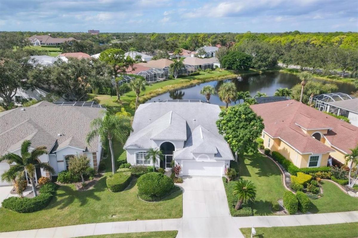 Under contract-accepting backup offers. Immaculate, well cared for 2 bedroom, 2 bath home with DEN and POOL in sought-after Stoneybrook Golf and Country Club! Vaulted ceilings and loads of natural light encompass this desirable open floor plan. Gorgeous, wood-look plank tile in all the main living areas. Kitchen is updated and charming with an eat-in bar, granite counters, tiled back splash, stainless steel appliances, soft close drawers and a bright dinette with plantation shutters. Living room and dining room open to the spacious screened-in lanai and pool area with tranquil views of the lake. Primary bedroom has 2 walk-in closets, a glass sliding door to patio, and a large ensuite bath with dual sinks and a soaker tub. Den/office is is a great option for an extra sleep space for guests as it has pocket doors for privacy. 2nd bath is beautifully updated with a tiled walk-in shower and raised granite vanity. Entertaining is easy, all year round on your covered lanai, lounging by your pool and enjoying your own piece of tropical paradise! 2 car garage has plenty of room for your vehicles and all your beach and sports gear. Stoneybrook is a premier and established club in Palmer Ranch and boasts top amenities that include a new 18 hole golf course redesigned by Kipp Schultes and is said to be one of the best on the West Coast! Lighted Har-Tru tennis/pickleball courts, pro-shop, well-equipped fitness center, bocce court, putting greens, driving range, fitness studio, sharing library, additional heated pool/spa, full service restaurant/bar, meeting rooms, catering facility, outdoor dining patio, walking/biking trails, fishing, planned activities like yoga, mahjong, line dancing, and so much more! Stoneybrook Golf and Country Club is a prime location close to the Legacy Trail, shopping, Costco, restaurants and all Sarasota and Venice has to offer! WELCOME HOME to RESORT-STYLE LIVING at its BEST!